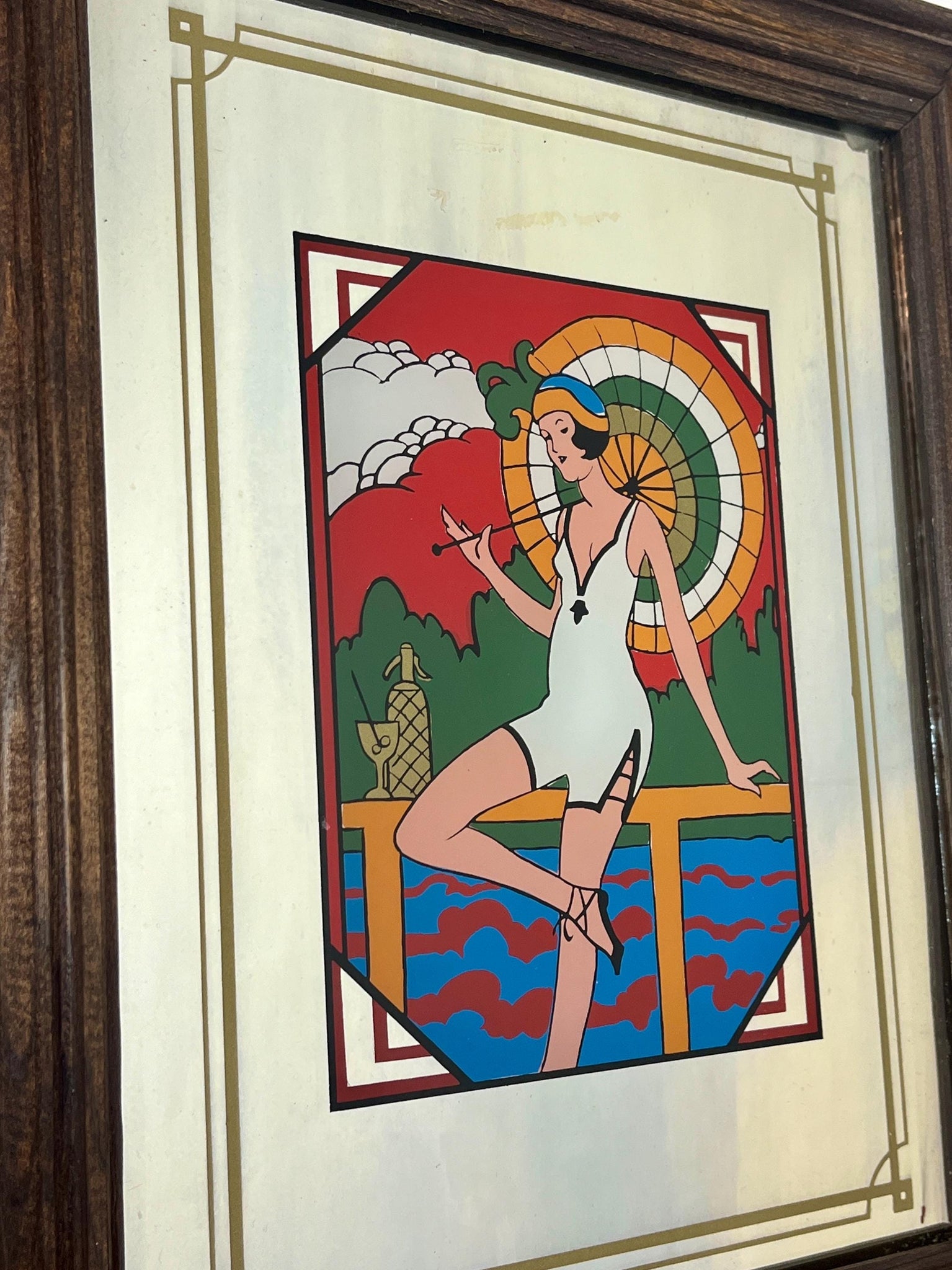 A beautiful Art Deco mirror is a popular decorative print that depicts a woman, sometimes referred to as a "flapper girl," in a 1920s aesthetic.