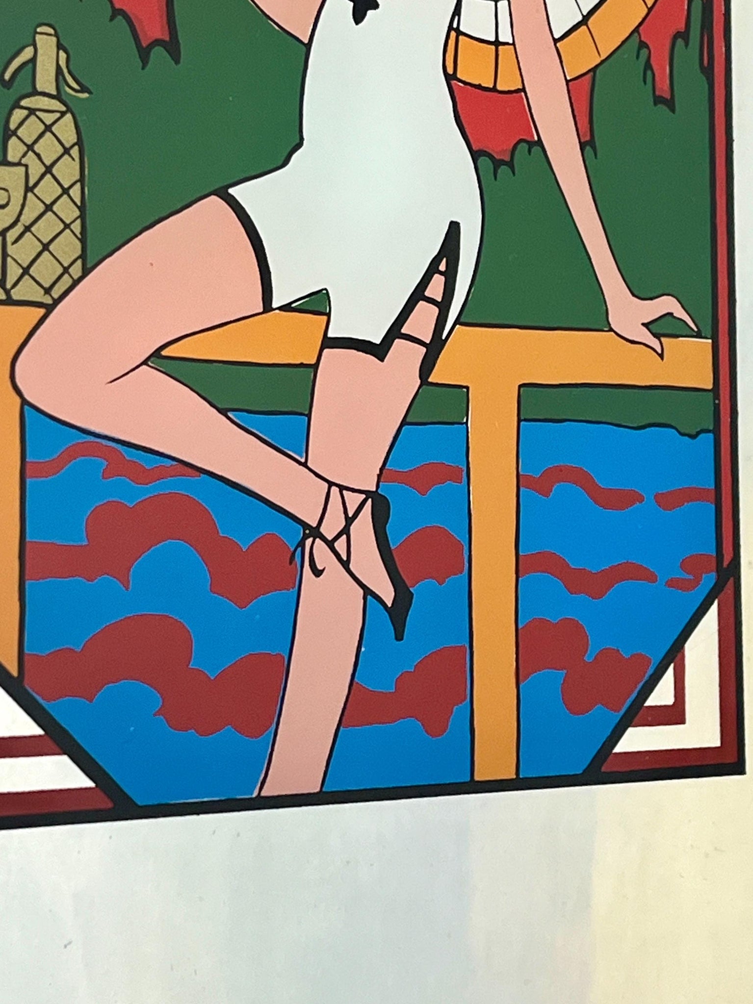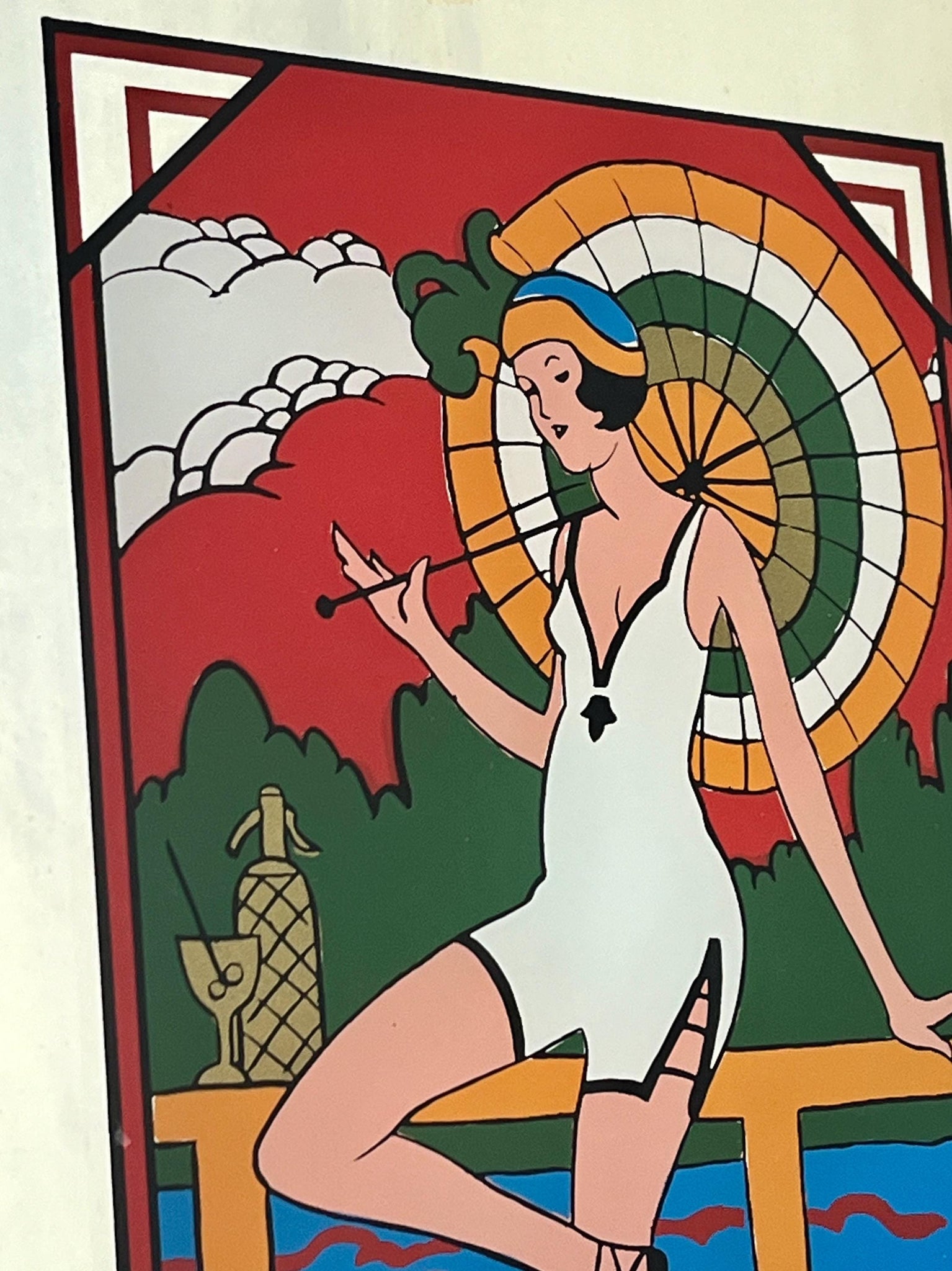 It features a woman in a white swimsuit, hat, and high-heeled shoes, holding a long cigarette holder and standing on a dock with a large, colourful umbrella and a soda syphon bottle nearby.