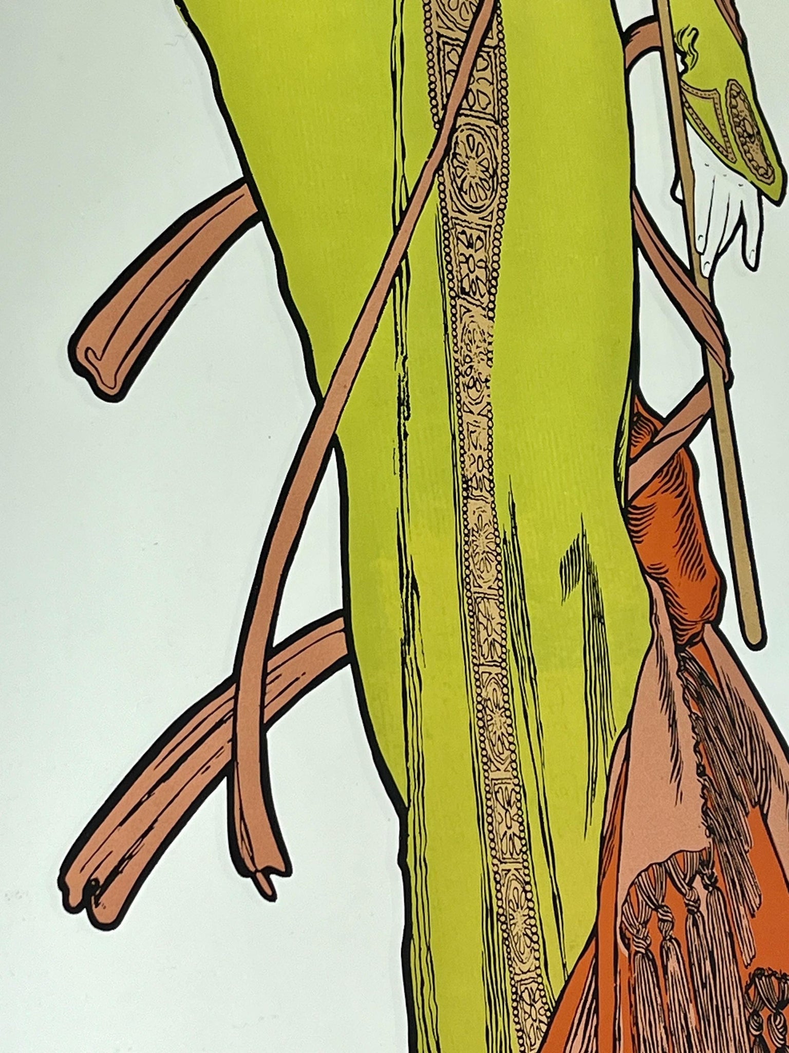 The artwork exemplifies key characteristics of Art Nouveau, including sinuous organic lines, intricate decorative patterns, and a harmonious blend of the figure with natural elements like flowers and foliage.