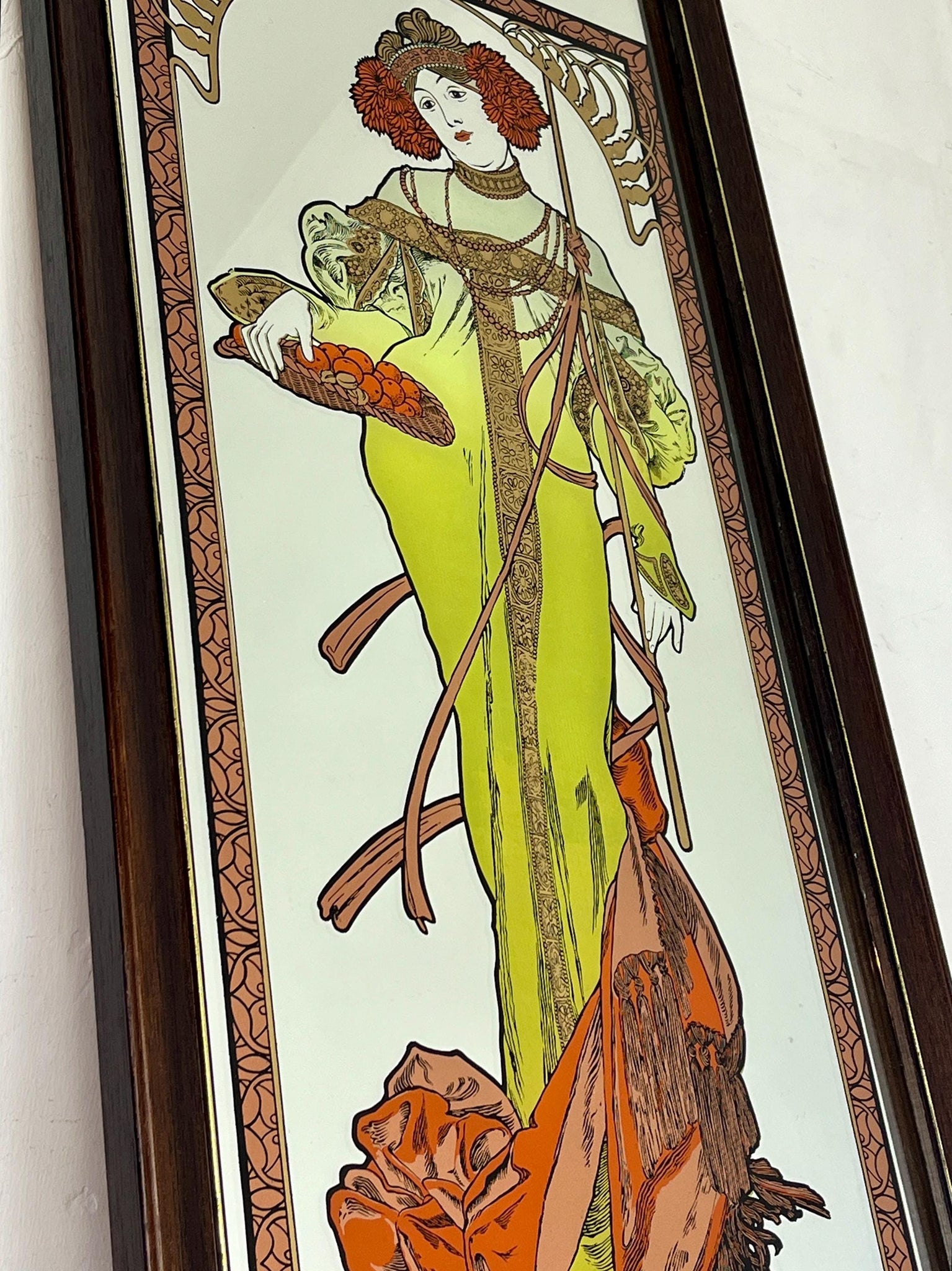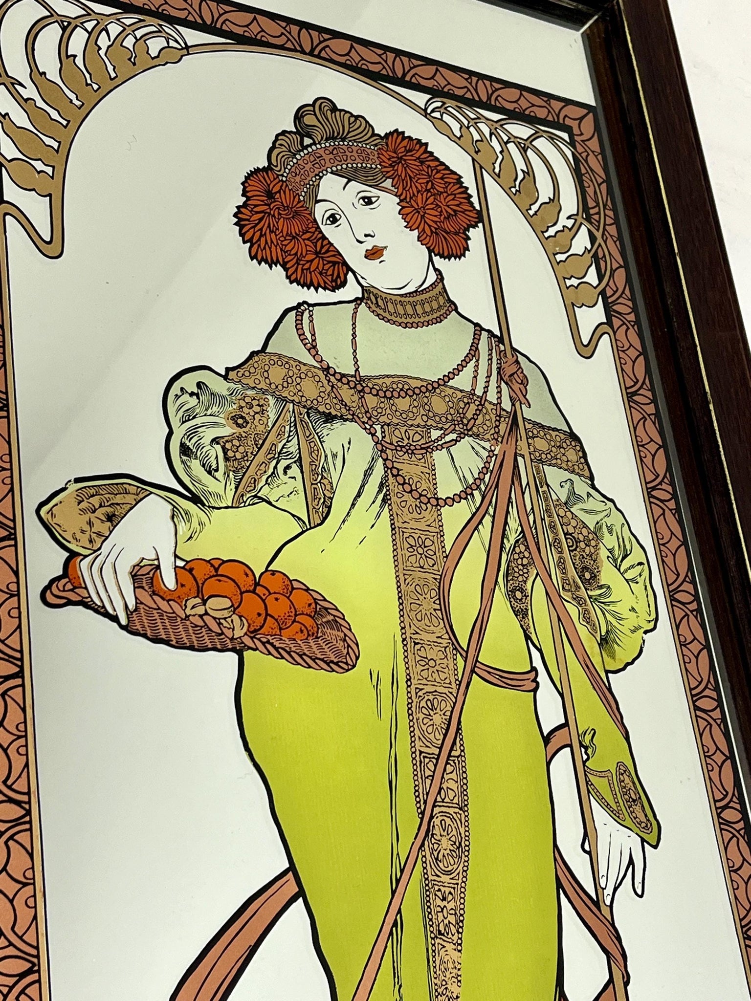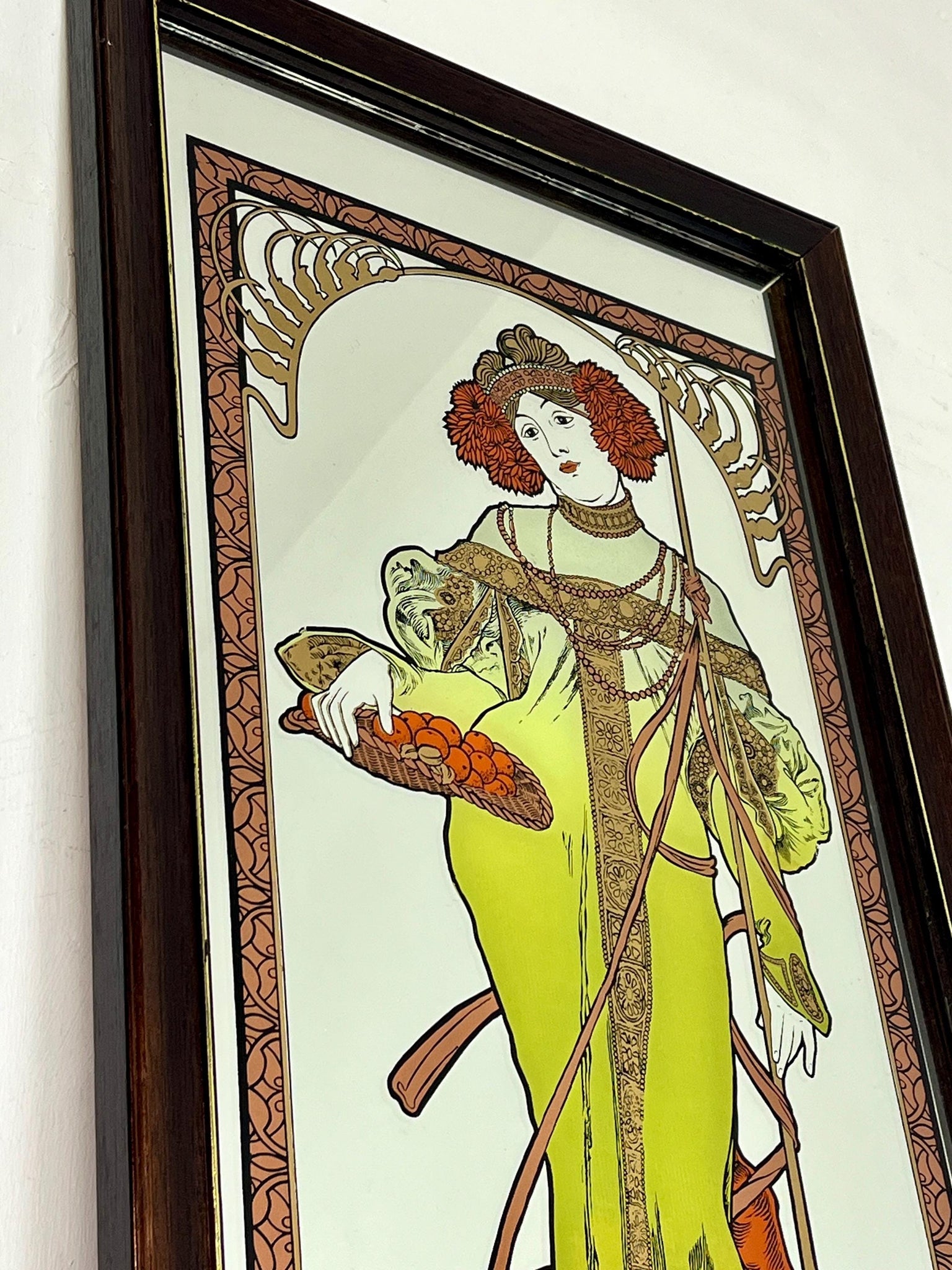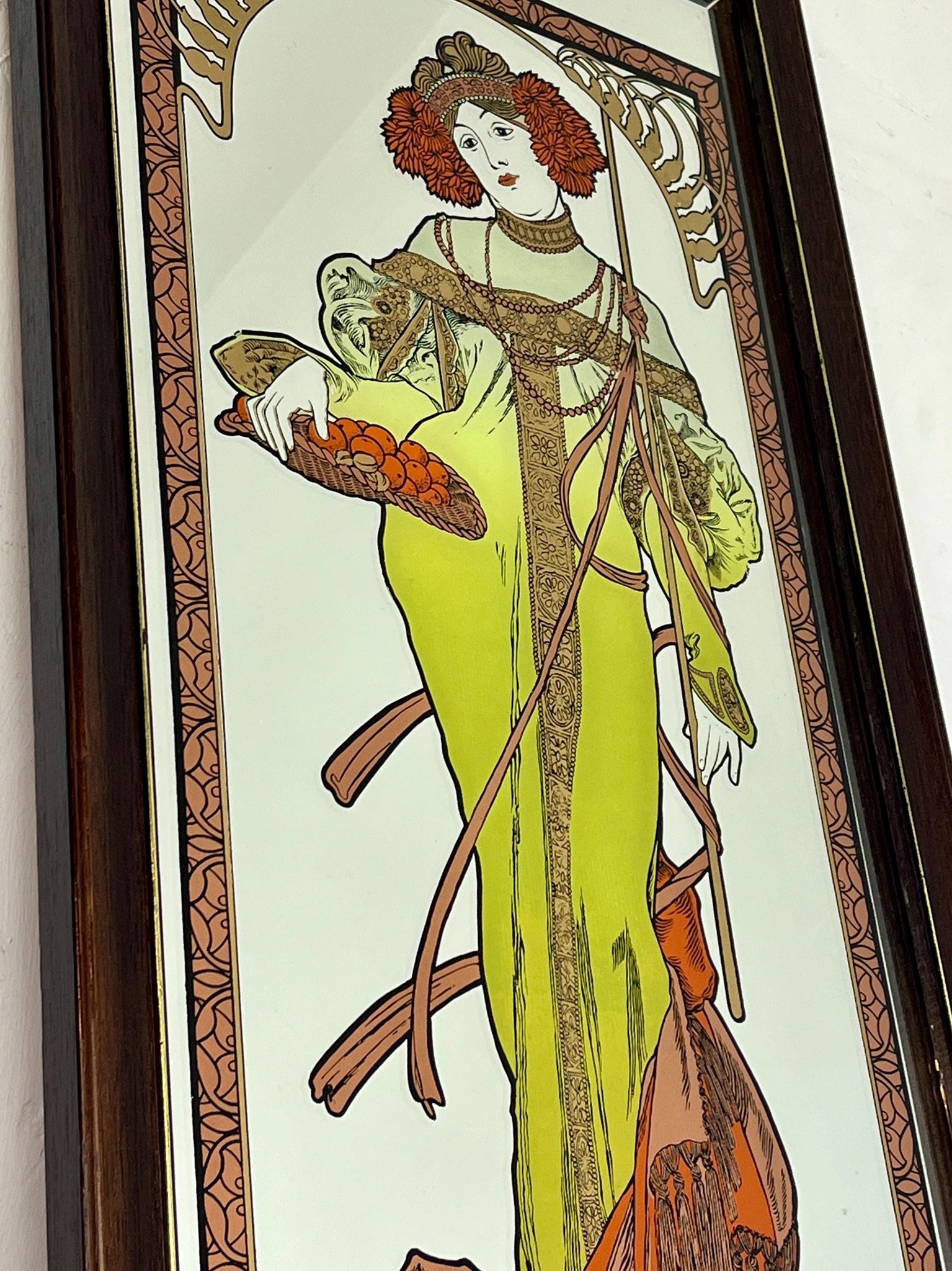 Vintage Art Nouveau mirror showing Alphonse Mucha's Autumn from his influential 1896 series, The Seasons.