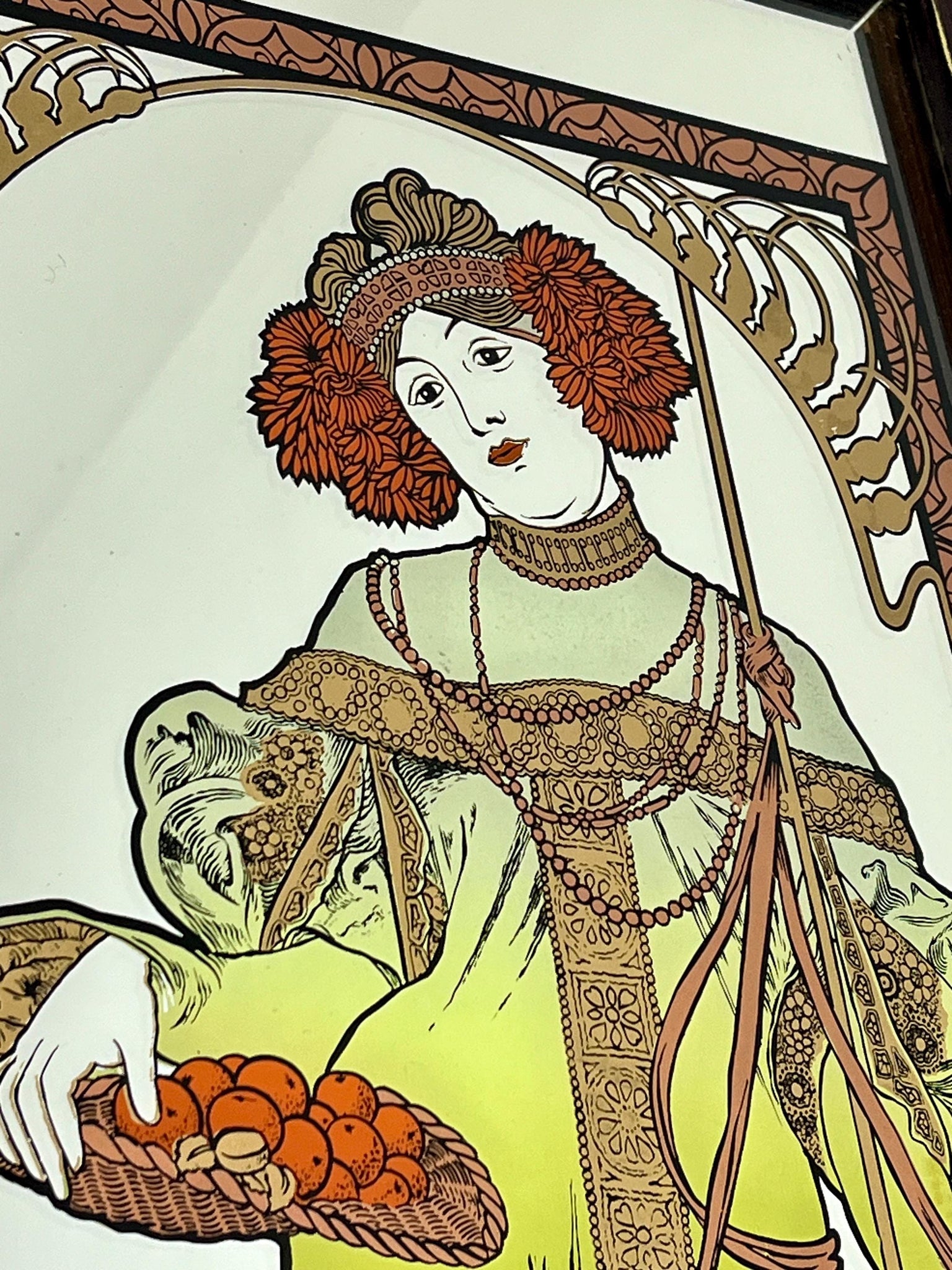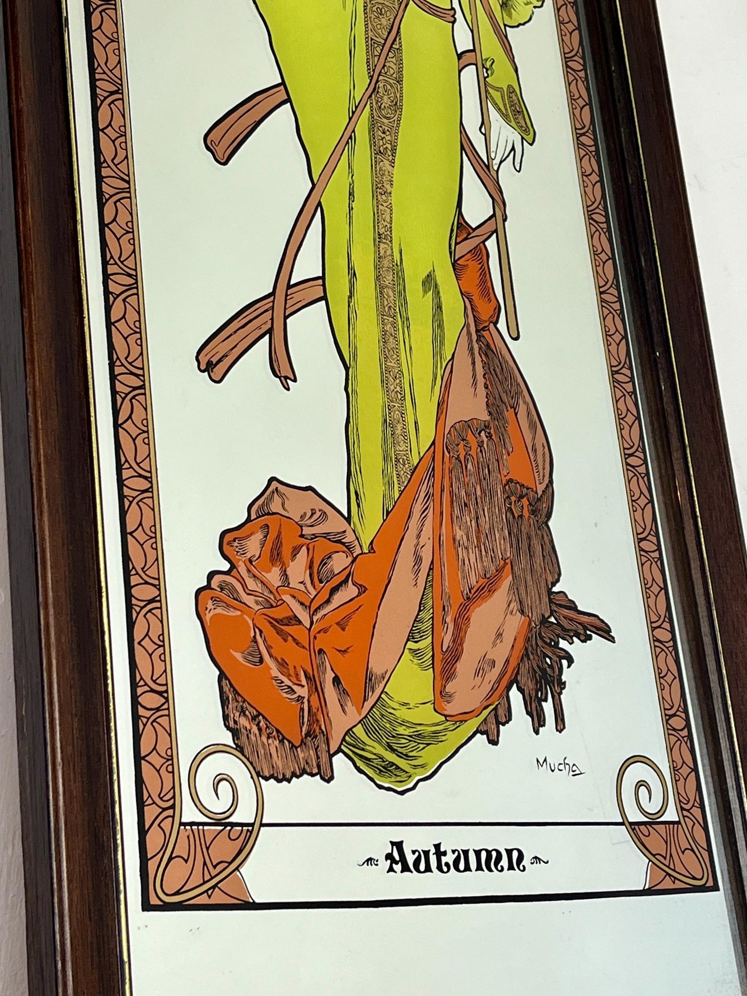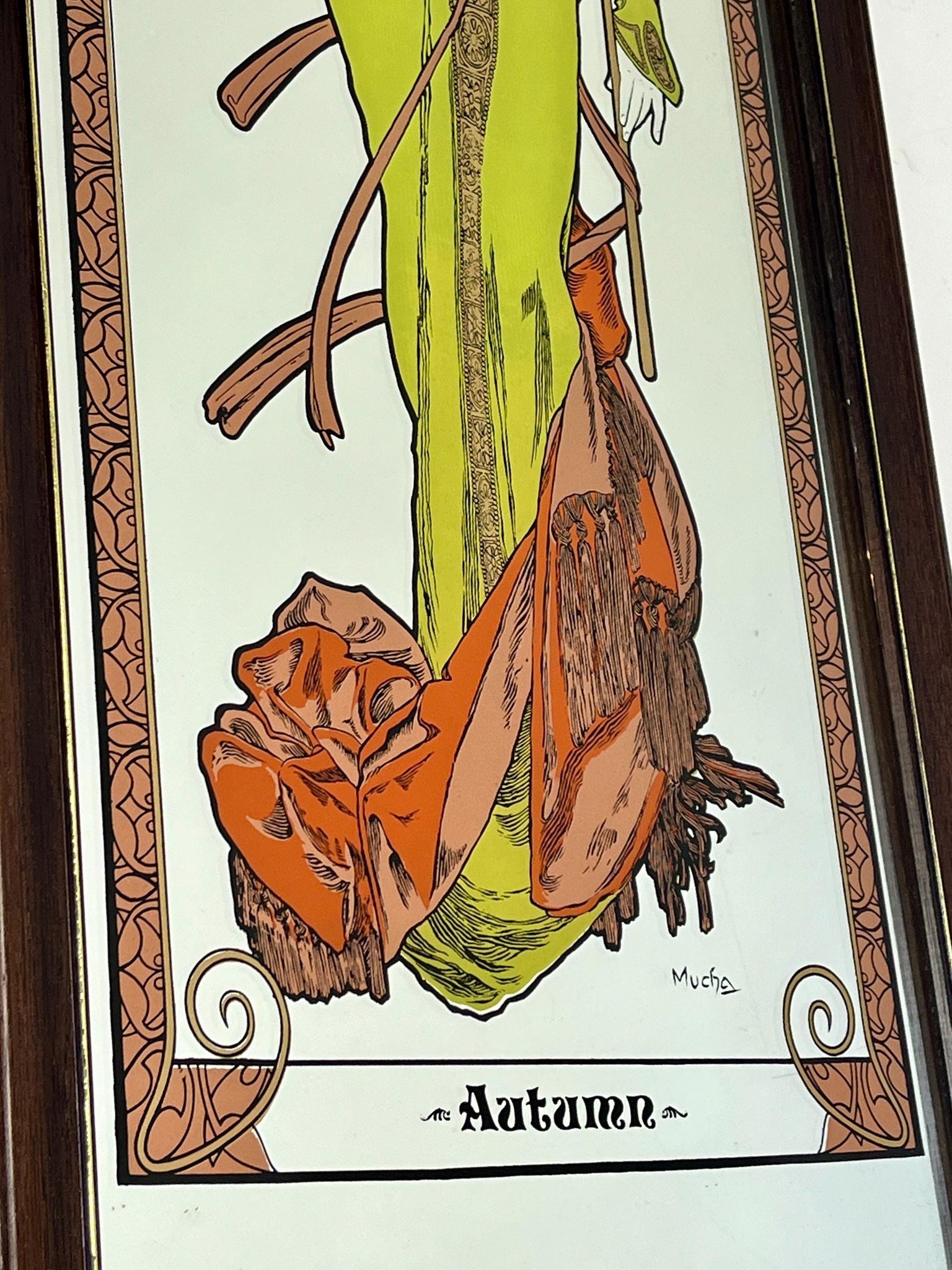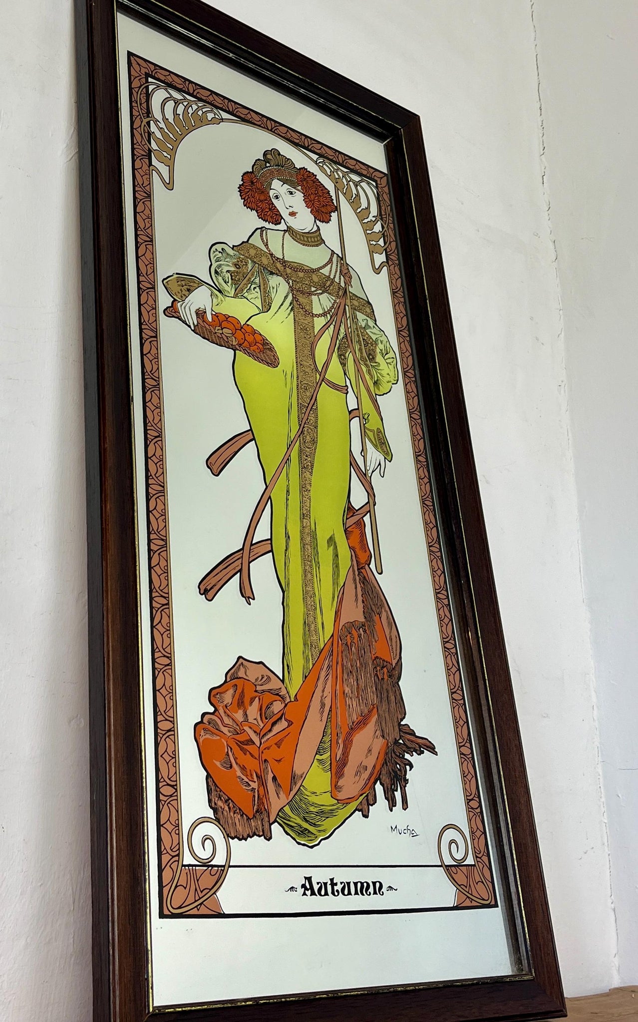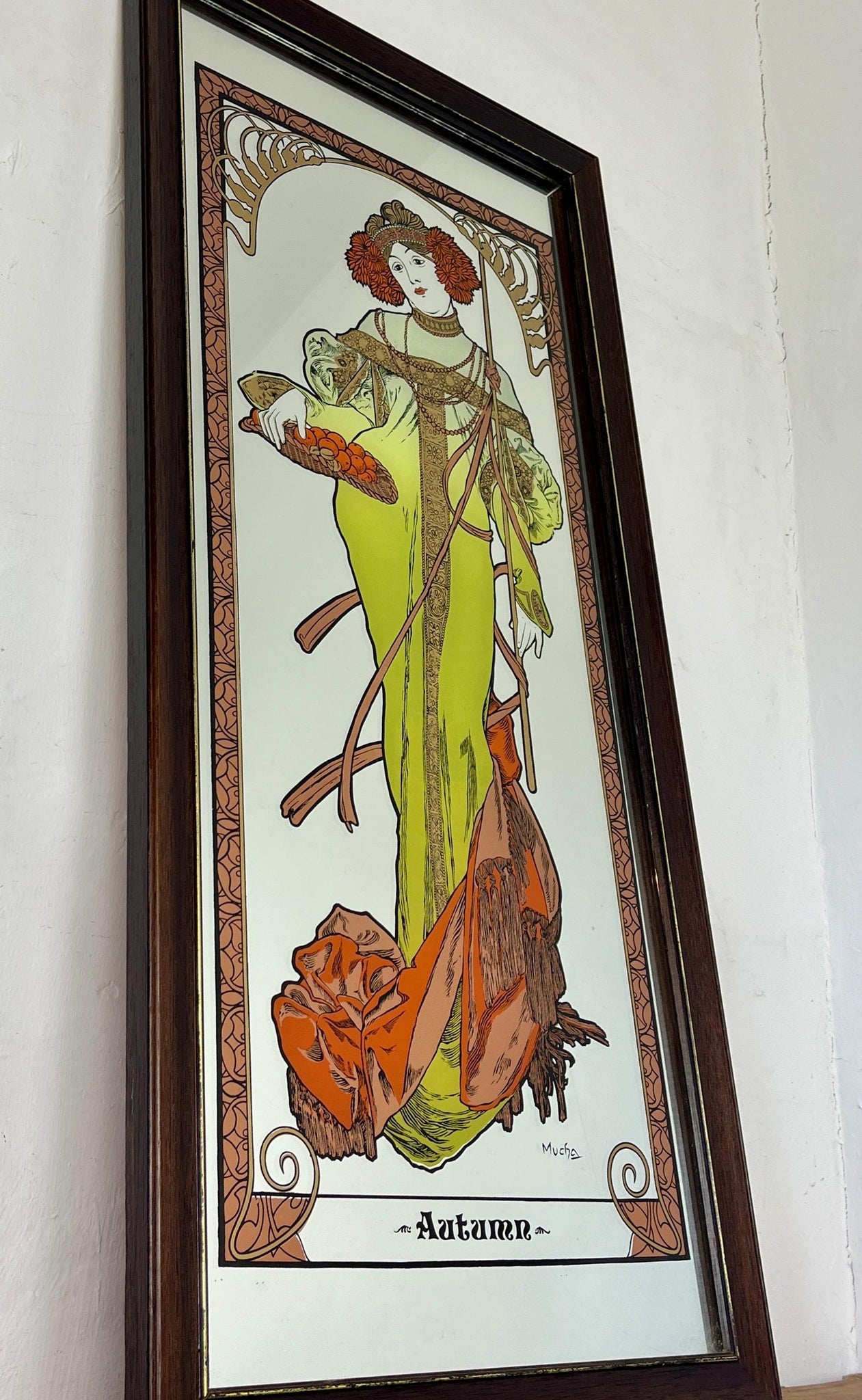 Vintage Art Nouveau mirror showing Alphonse Mucha's Autumn from his influential 1896 series, The Seasons.