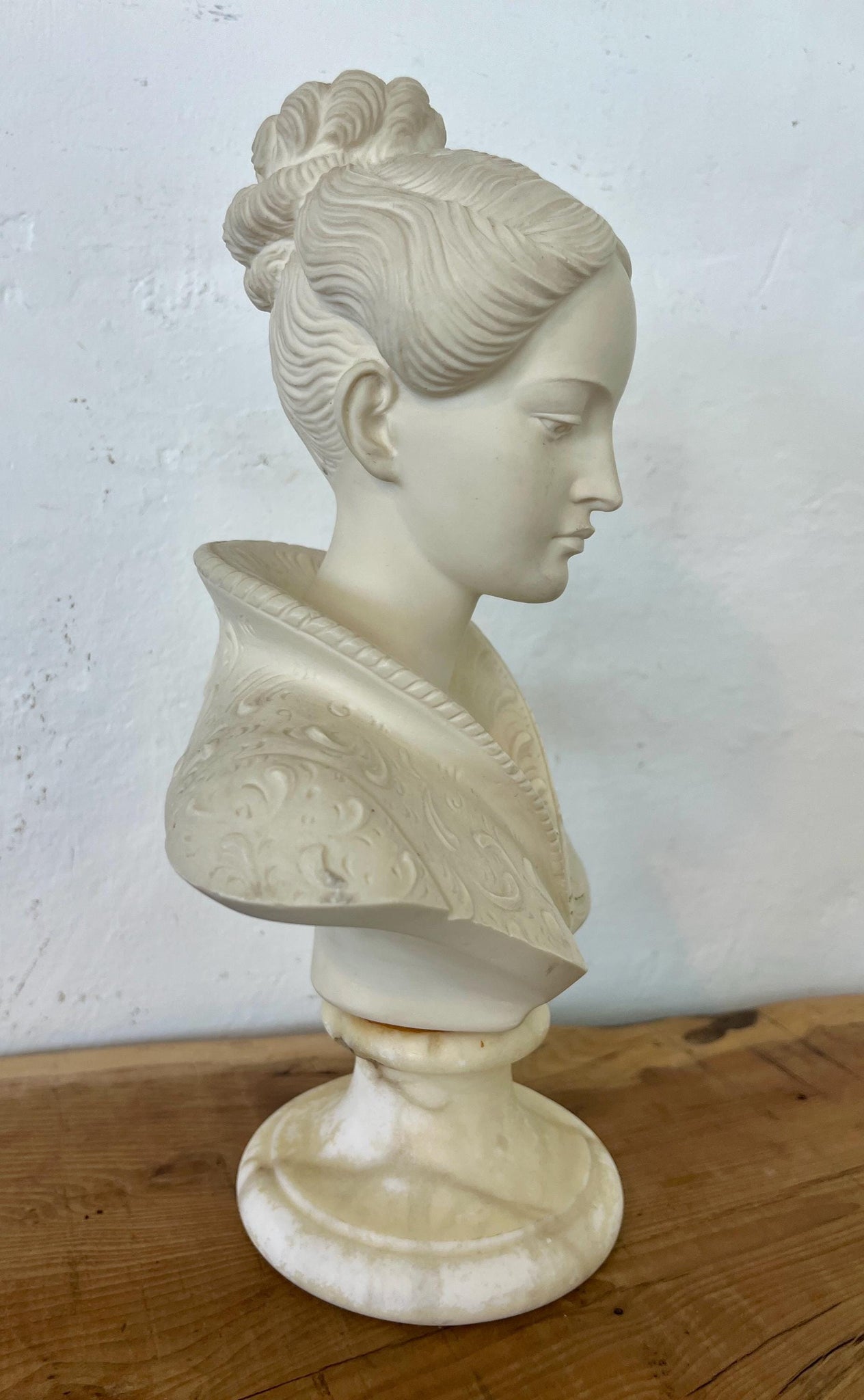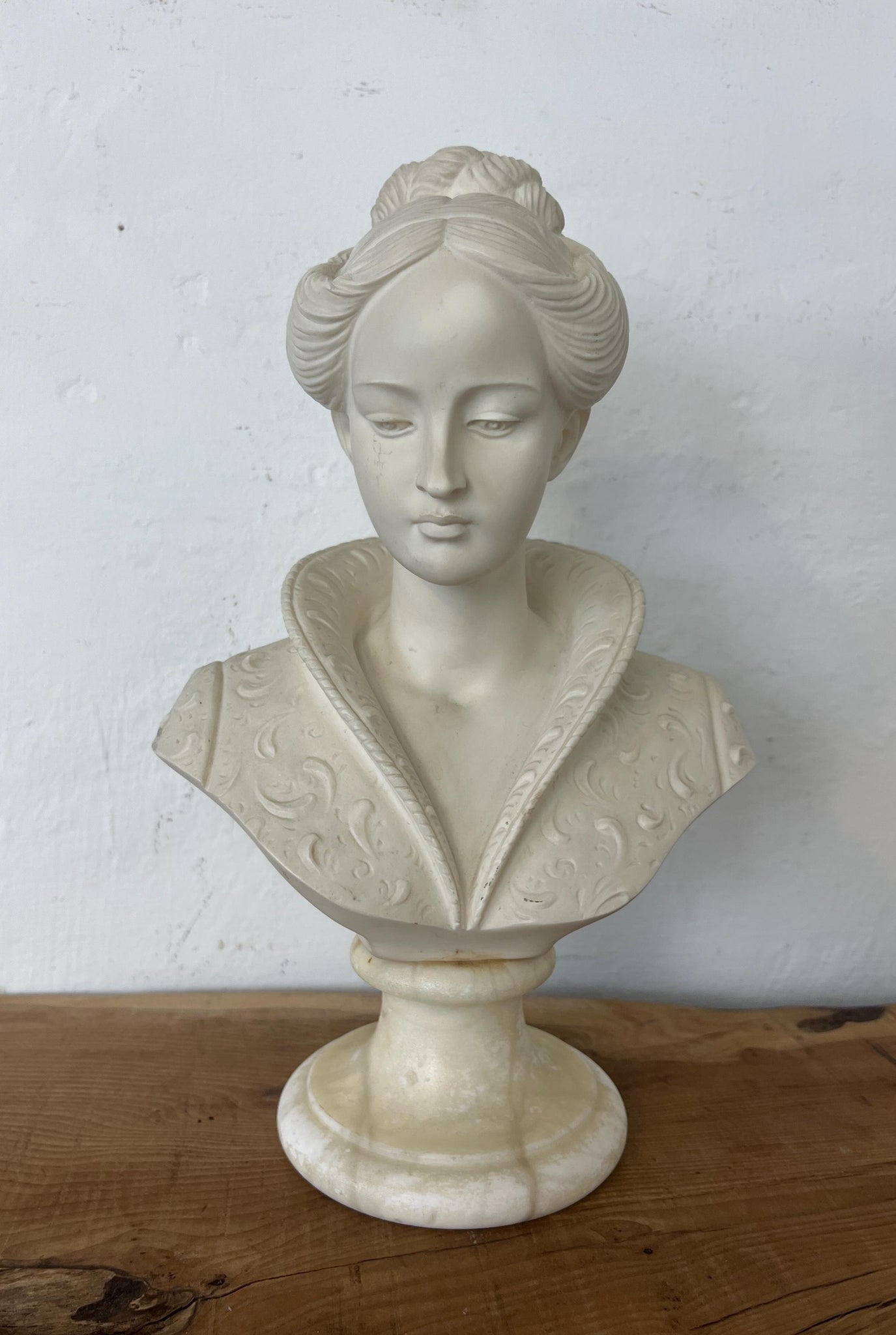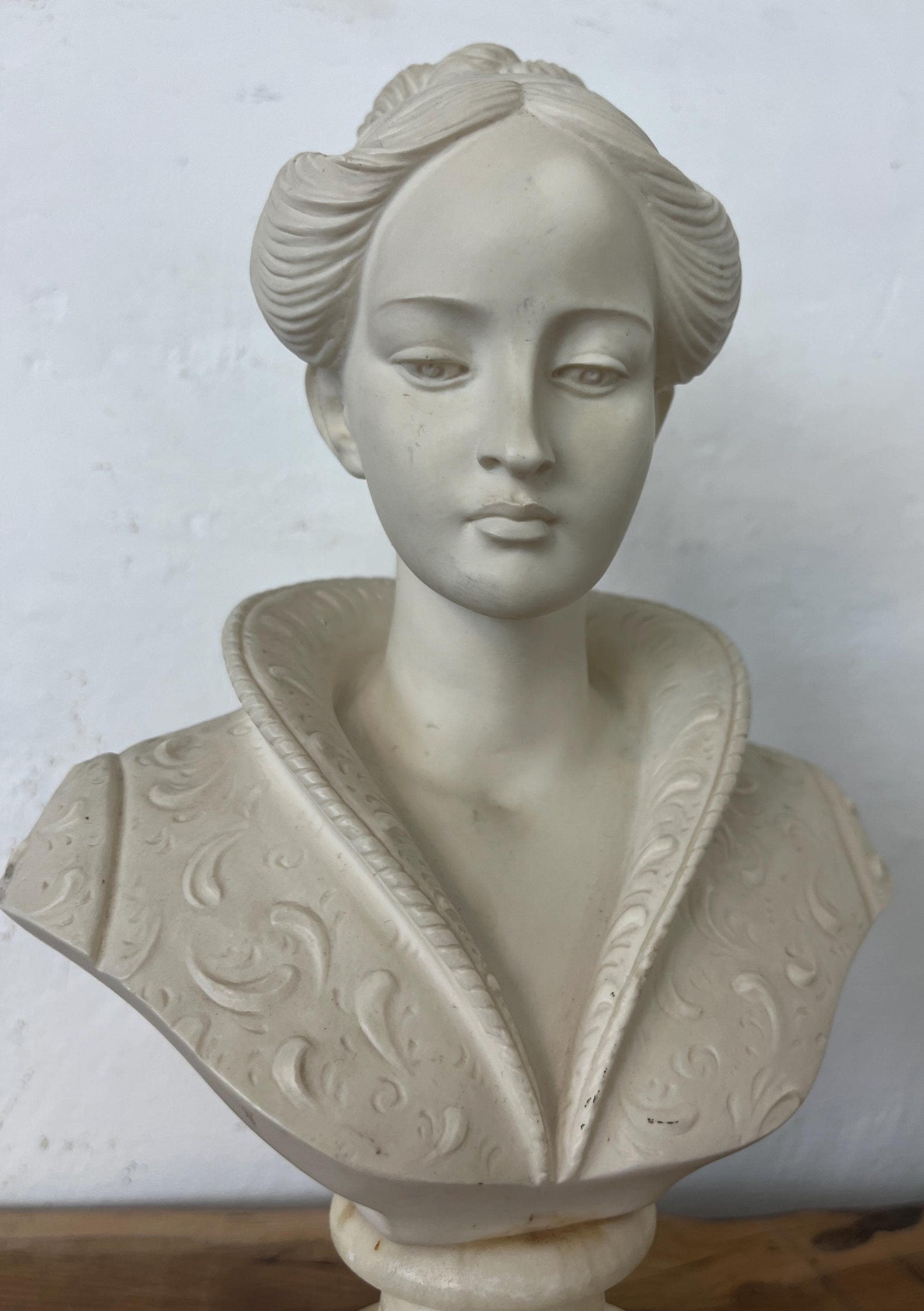 The elaborate collar (possibly a Medici collar) and Renaissance-style busts are sculptures that reflect the revival of classical antiquity and humanism characteristic of the 15th and 16th centuries. Departing from the more stylised and symbolic medieval forms, Renaissance busts focused on realism, individual expression, and idealised human beauty.