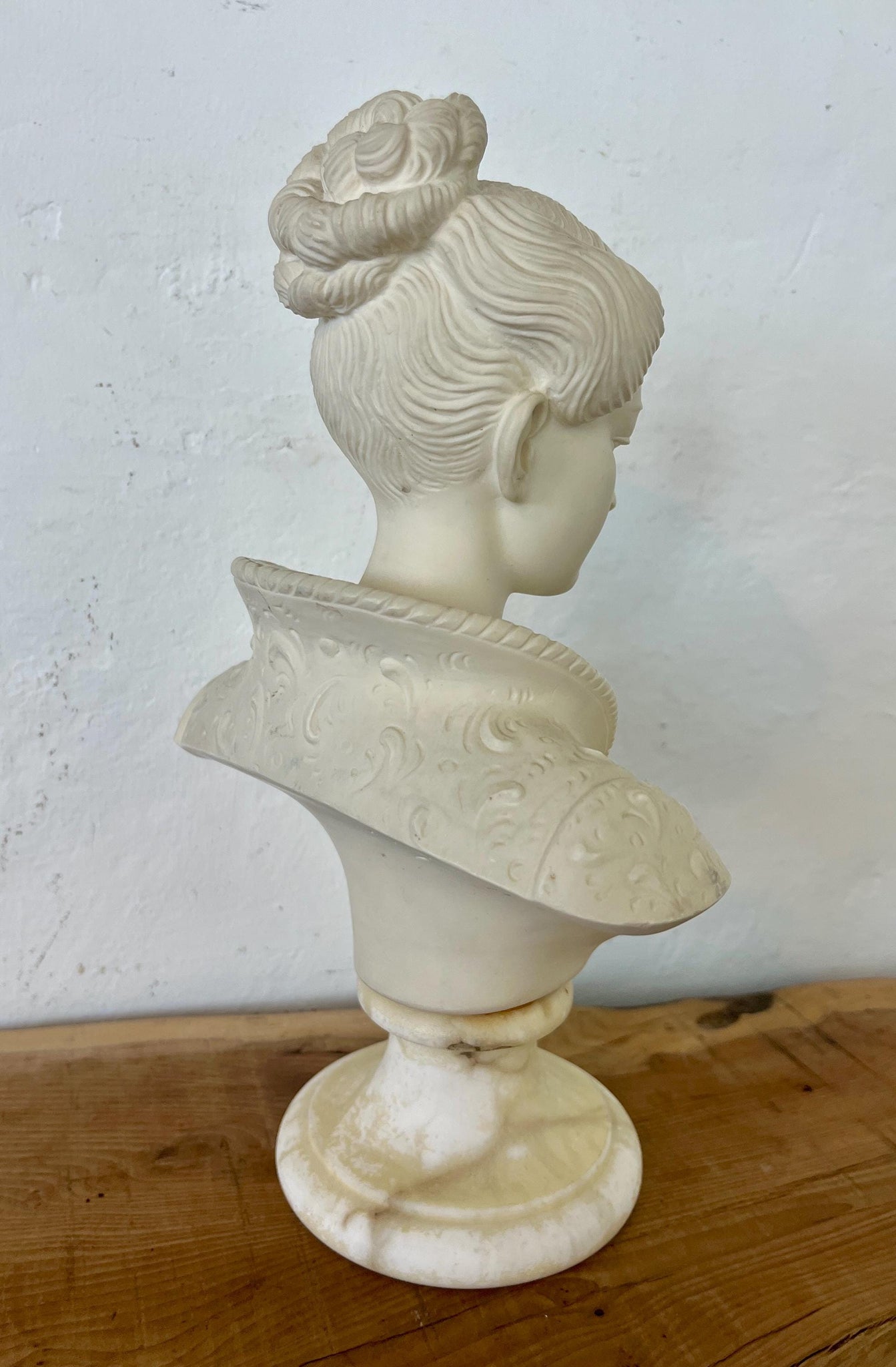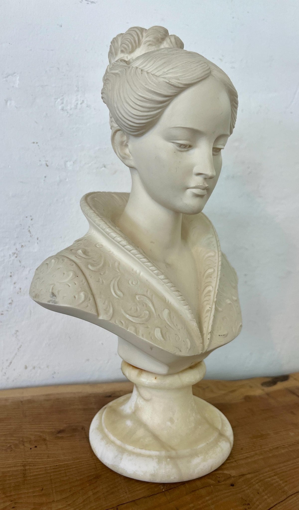 This bust is made with alabaster with a marble base.