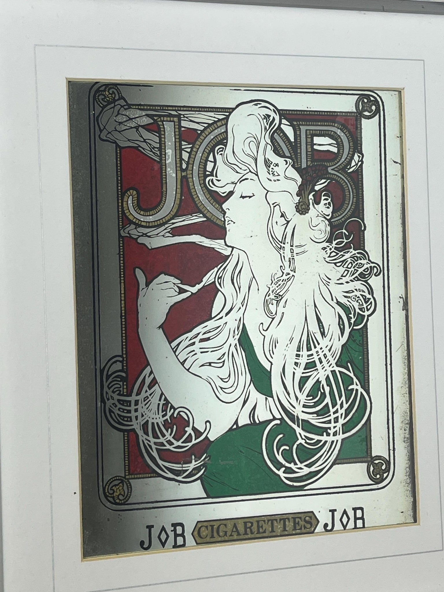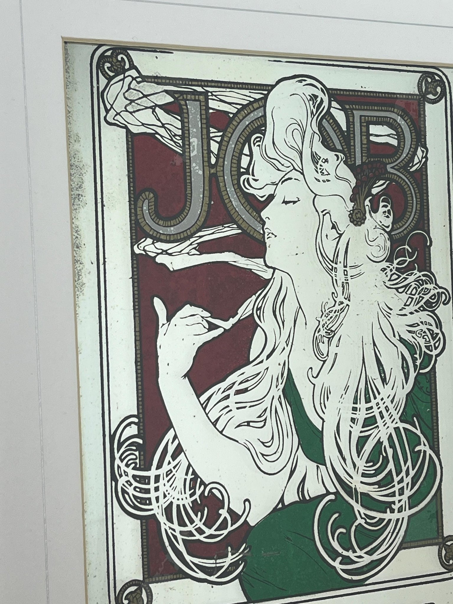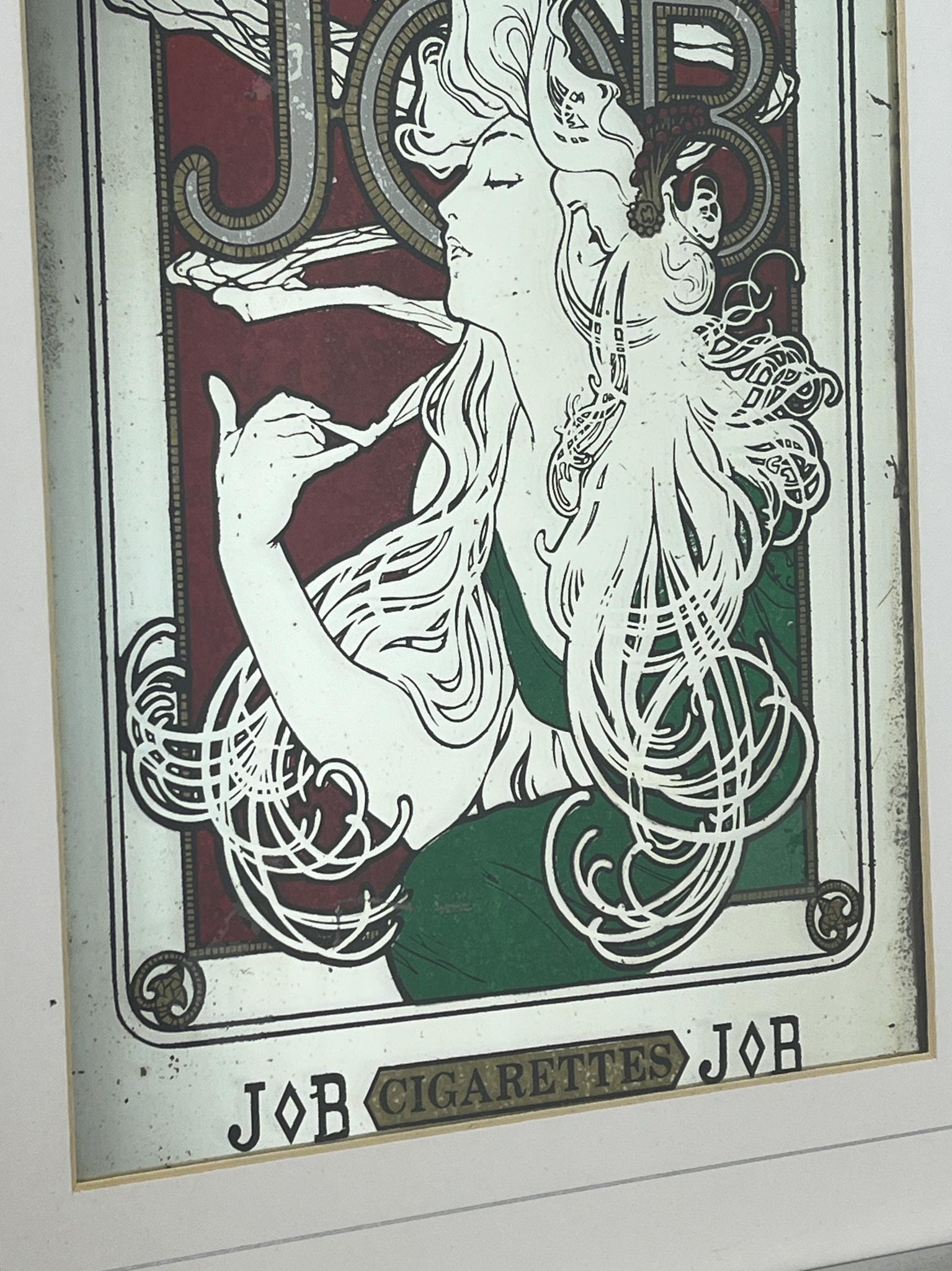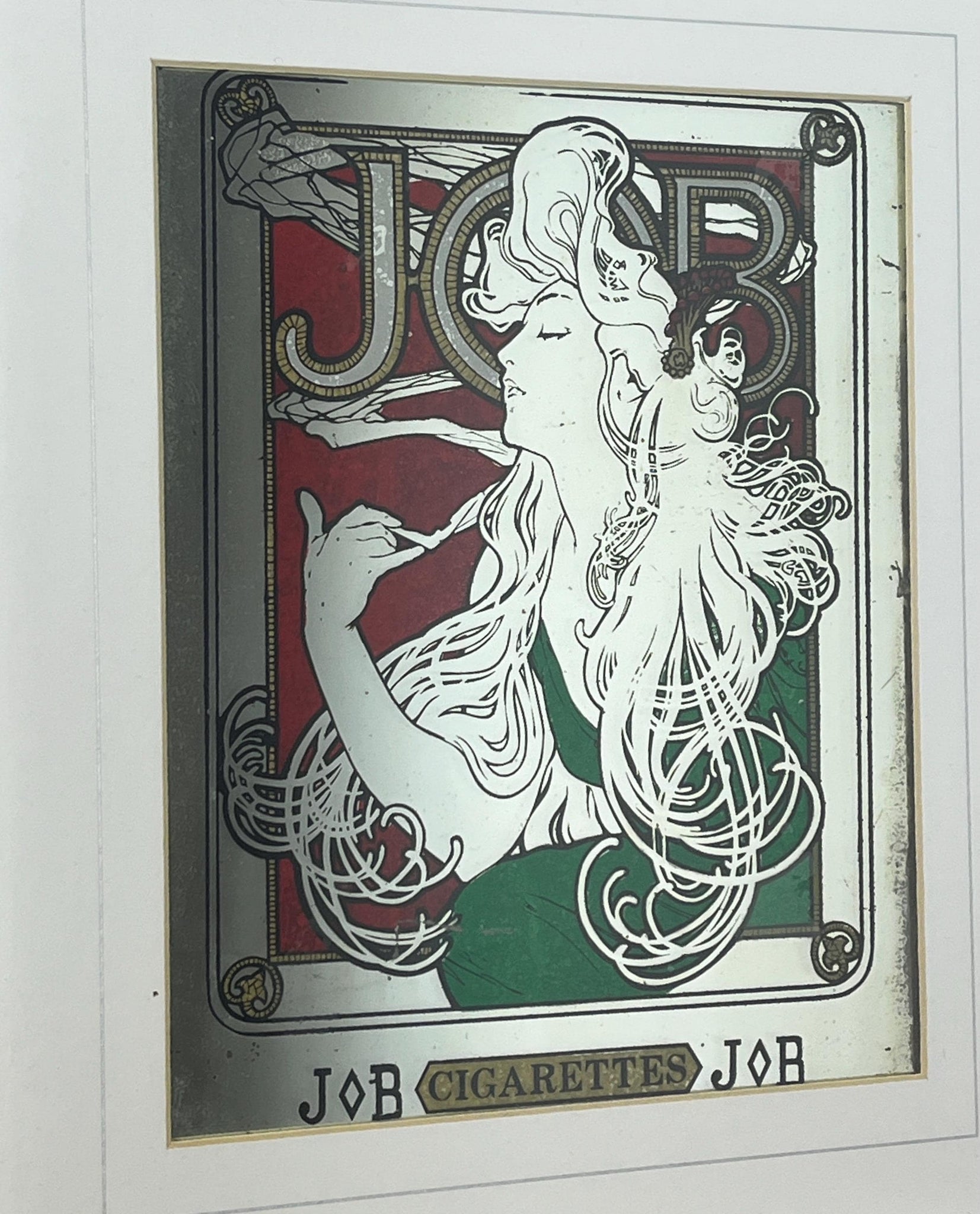 Stunning Mucha art nouveau Job cigarette mirror, featuring an elegant lady wearing a glamorous luscious green dress, background in an intricate vintage, rouge coloured pattern design and a stand-out bold font in enchanting tones, superb border, and further beautiful fonts at the bottom.