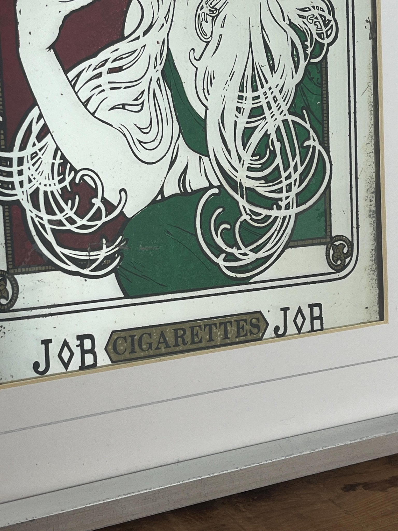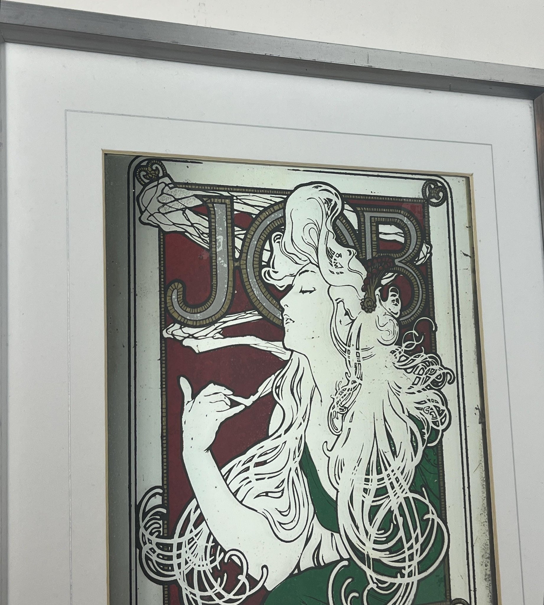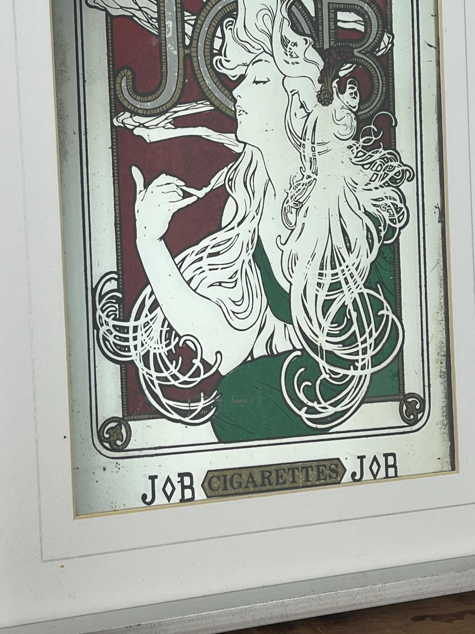 Stunning Mucha art nouveau Job cigarette mirror, featuring an elegant lady wearing a glamorous luscious green dress, background in an intricate vintage, rouge coloured pattern design and a stand-out bold font in enchanting tones, superb border, and further beautiful fonts at the bottom.