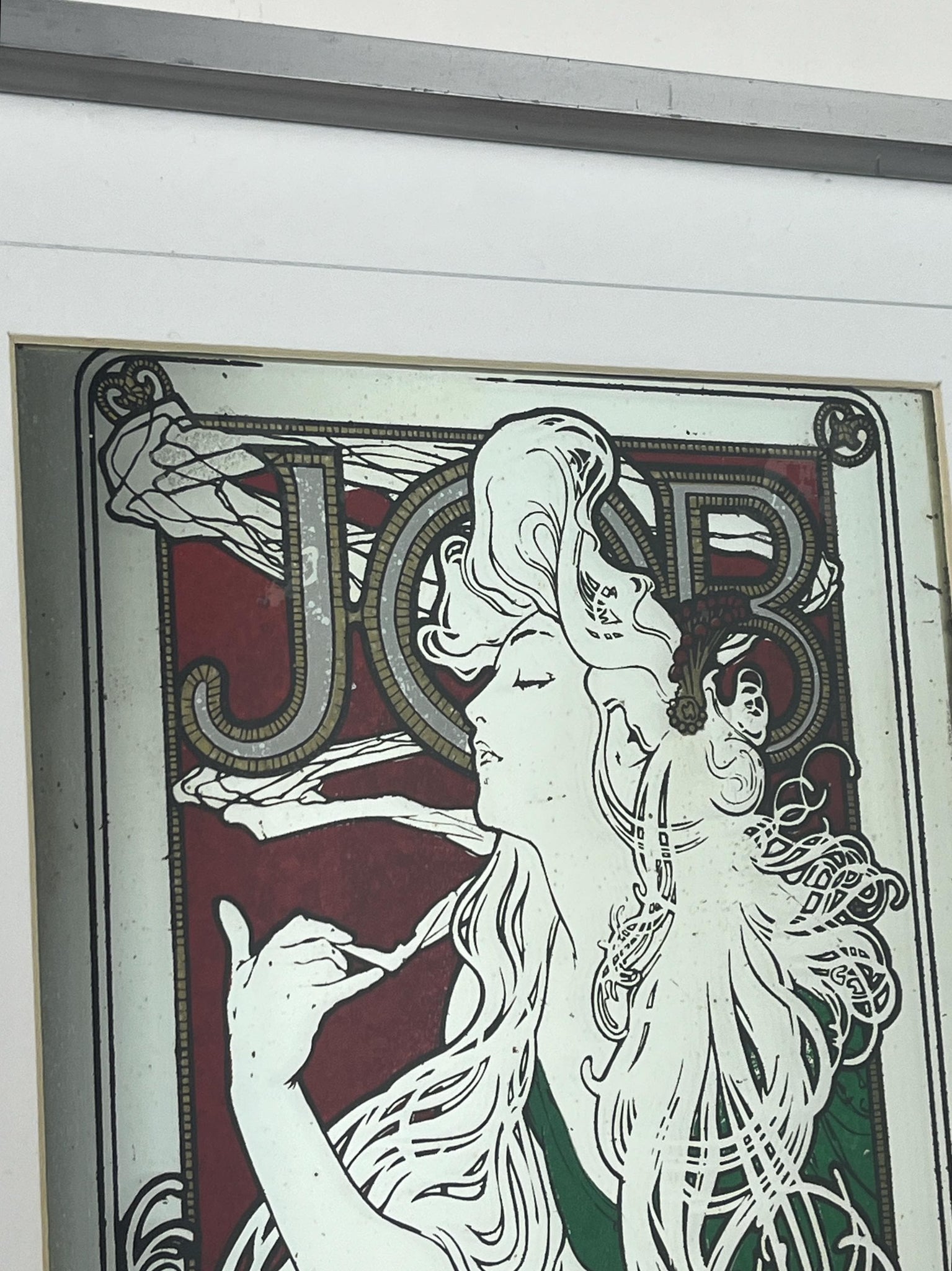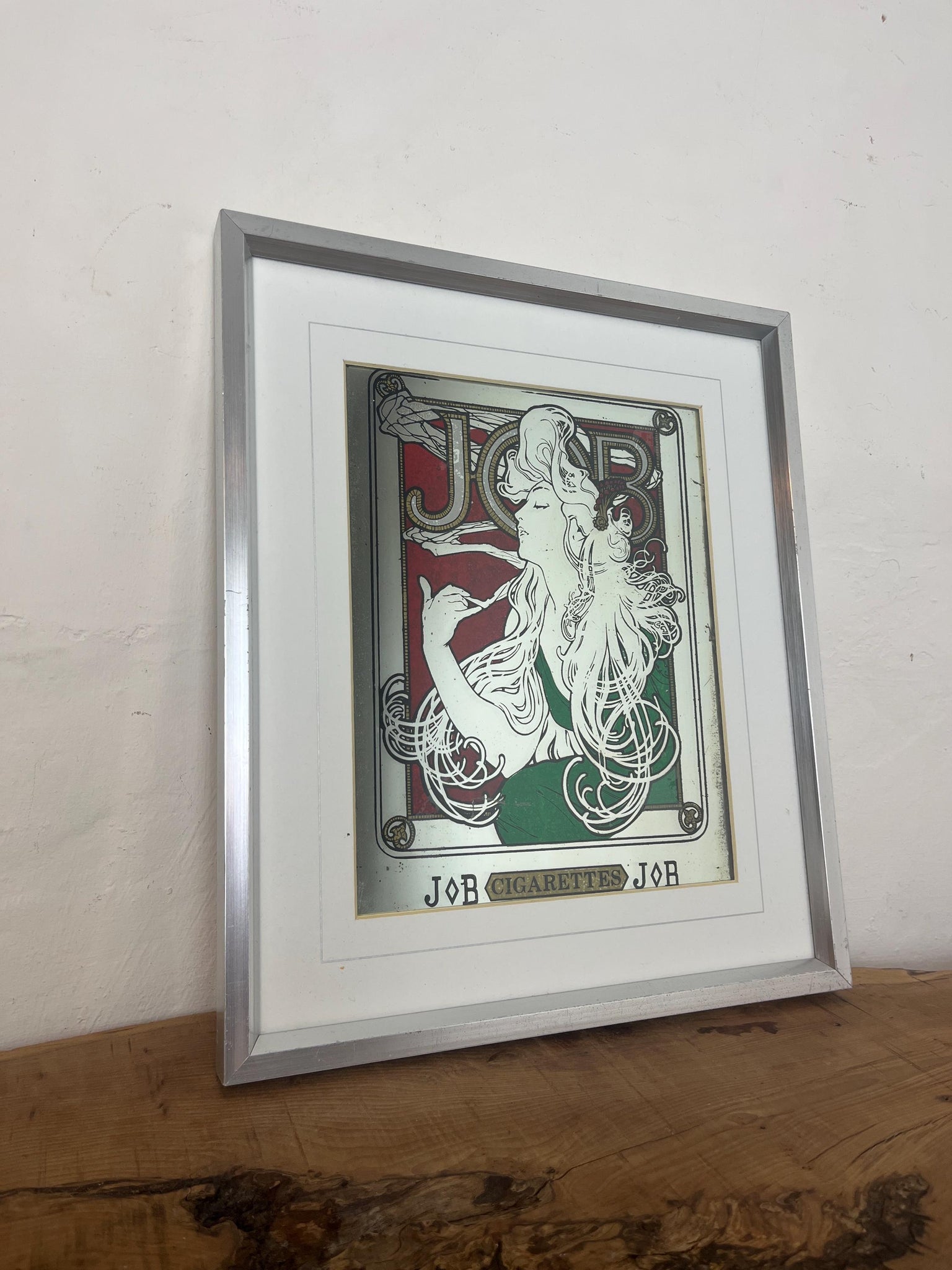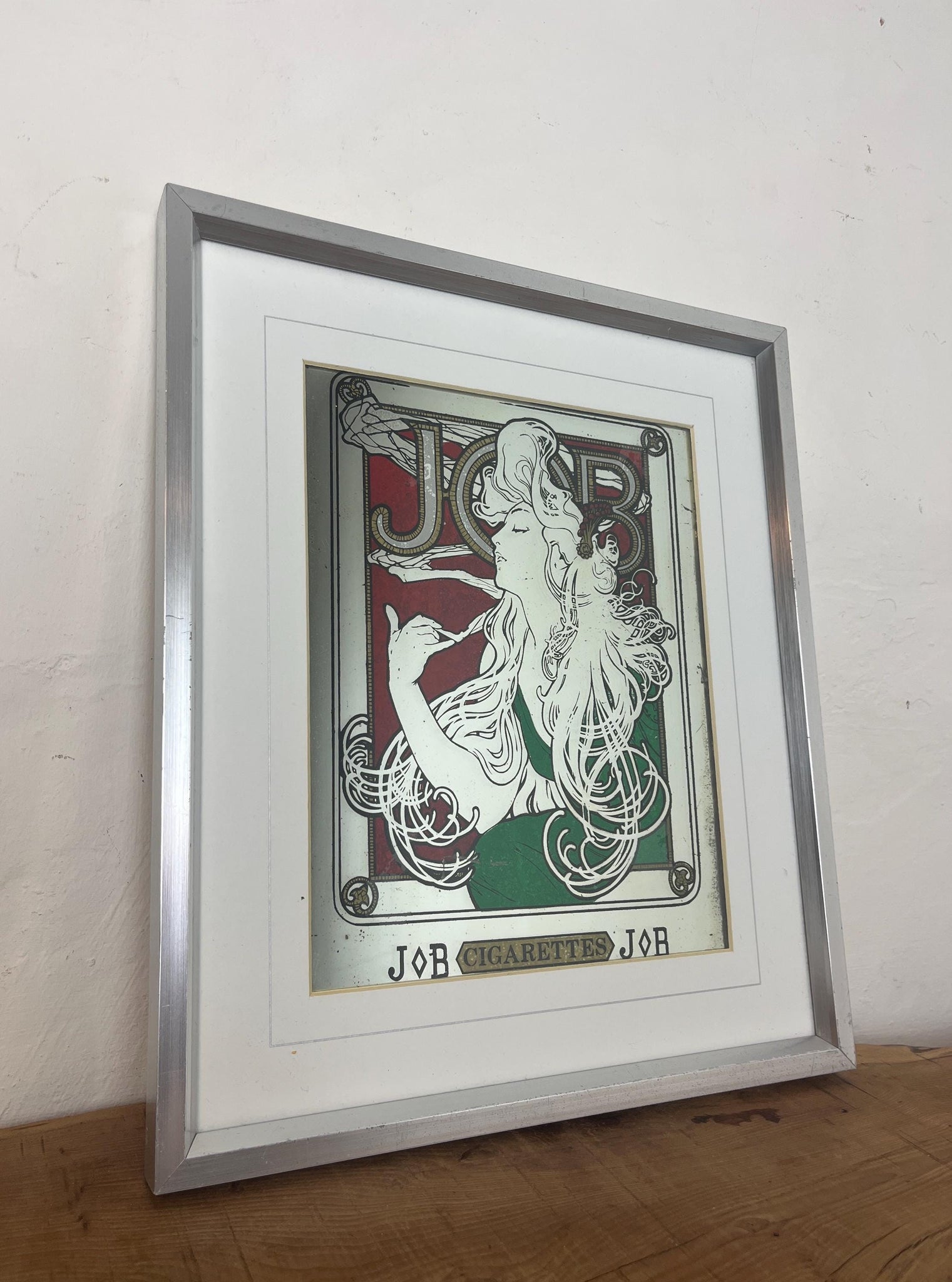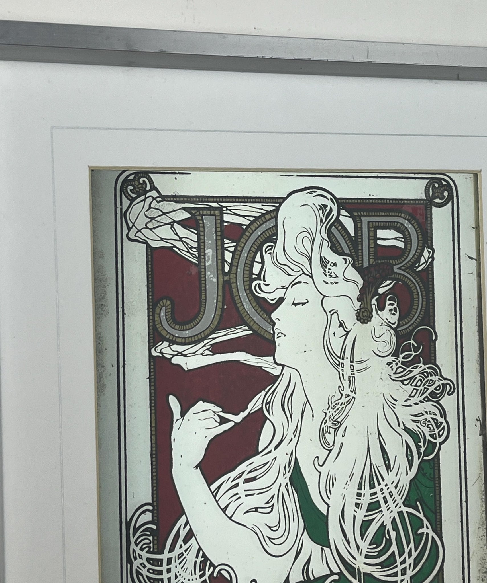 Stunning Mucha art nouveau Job cigarette mirror, featuring an elegant lady wearing a glamorous luscious green dress, background in an intricate vintage, rouge coloured pattern design and a stand-out bold font in enchanting tones, superb border, and further beautiful fonts at the bottom.