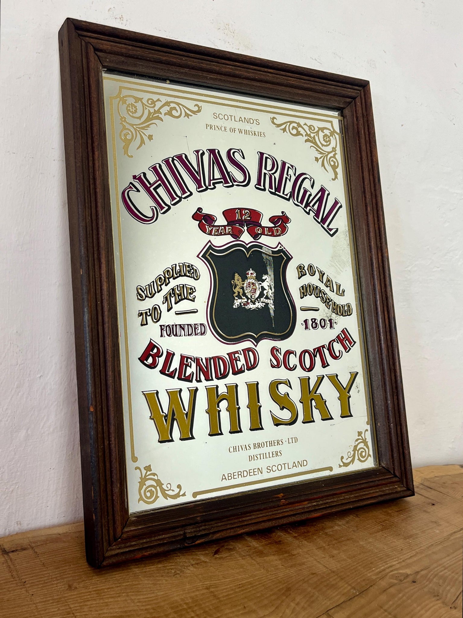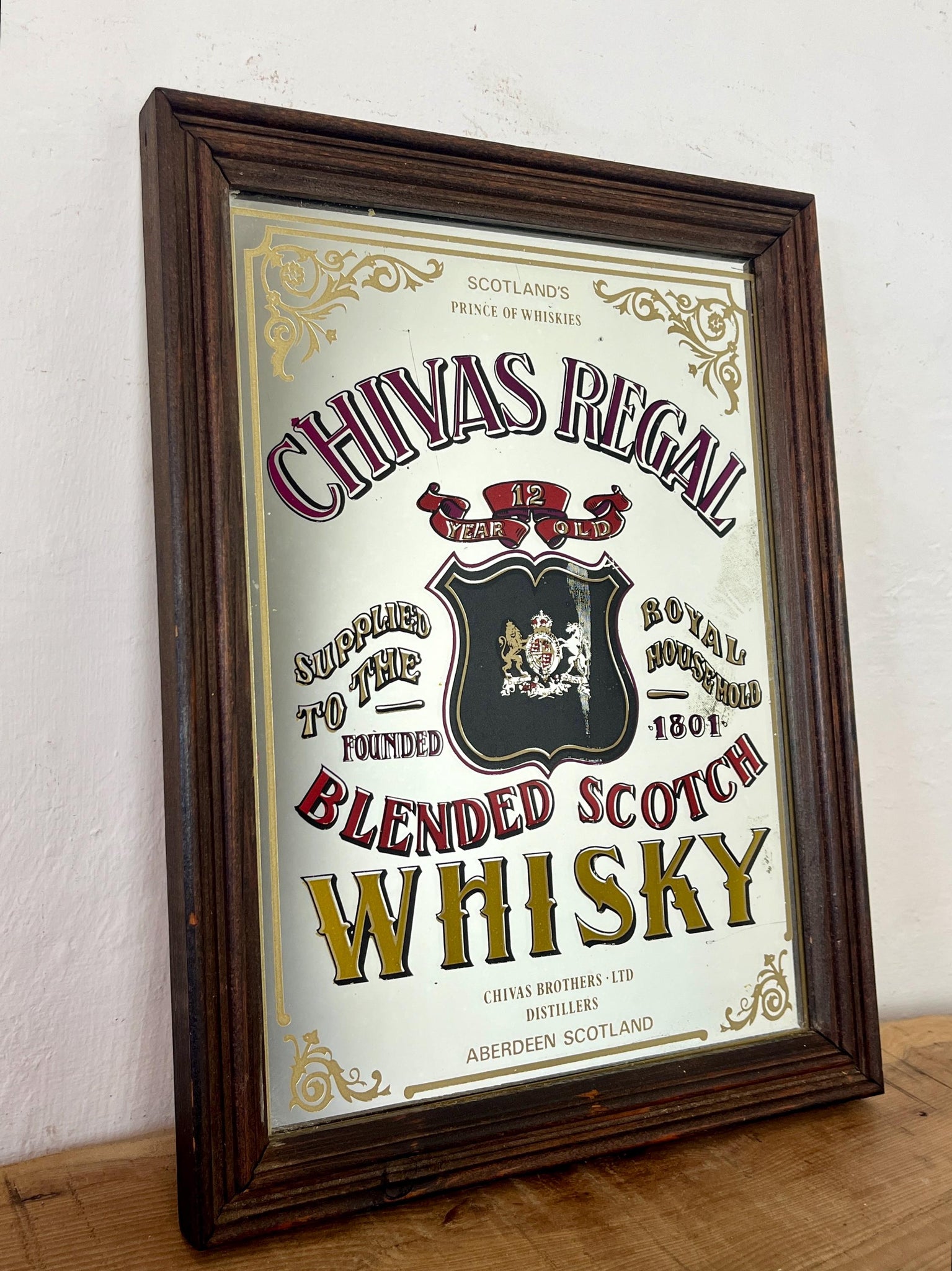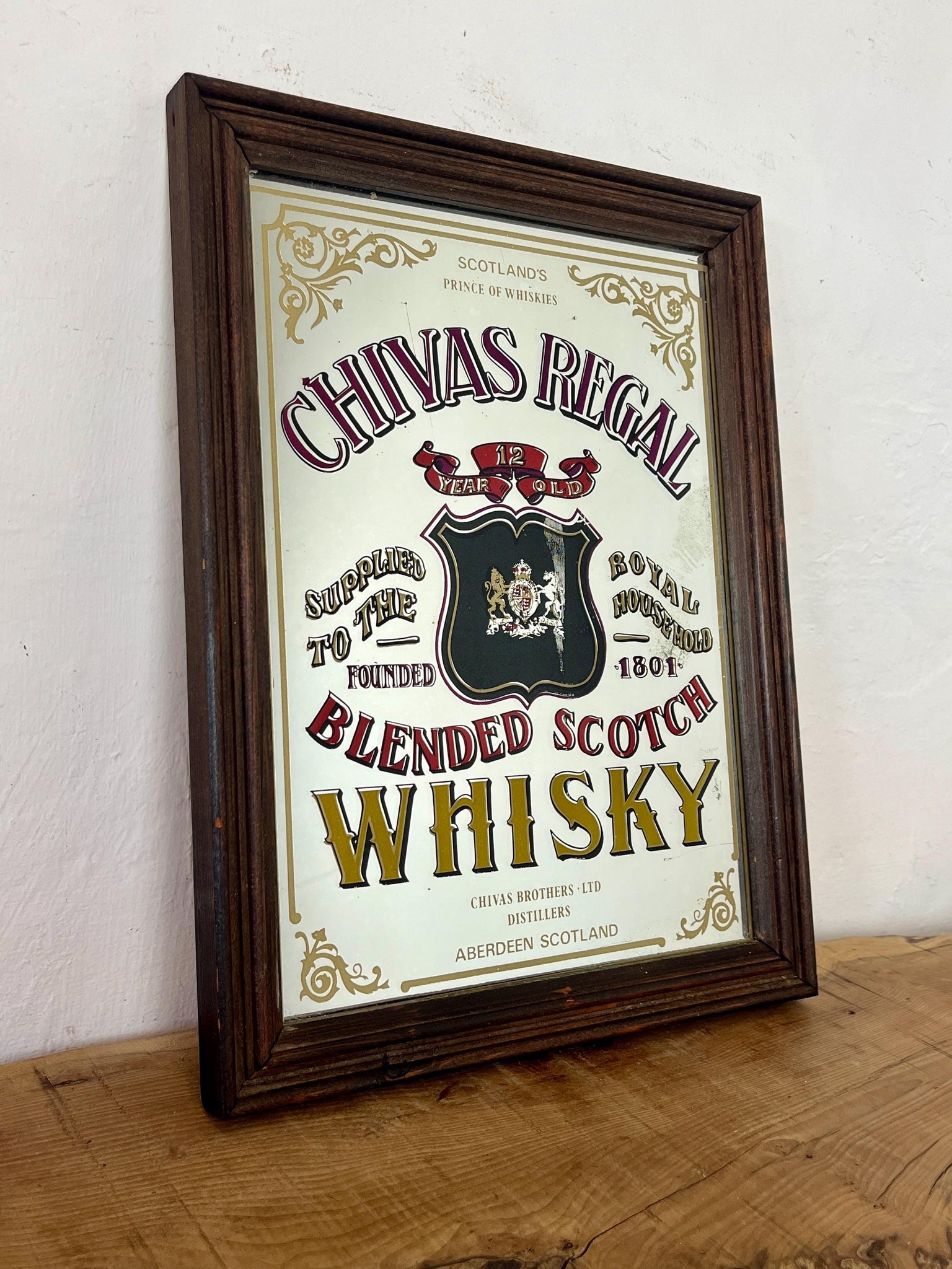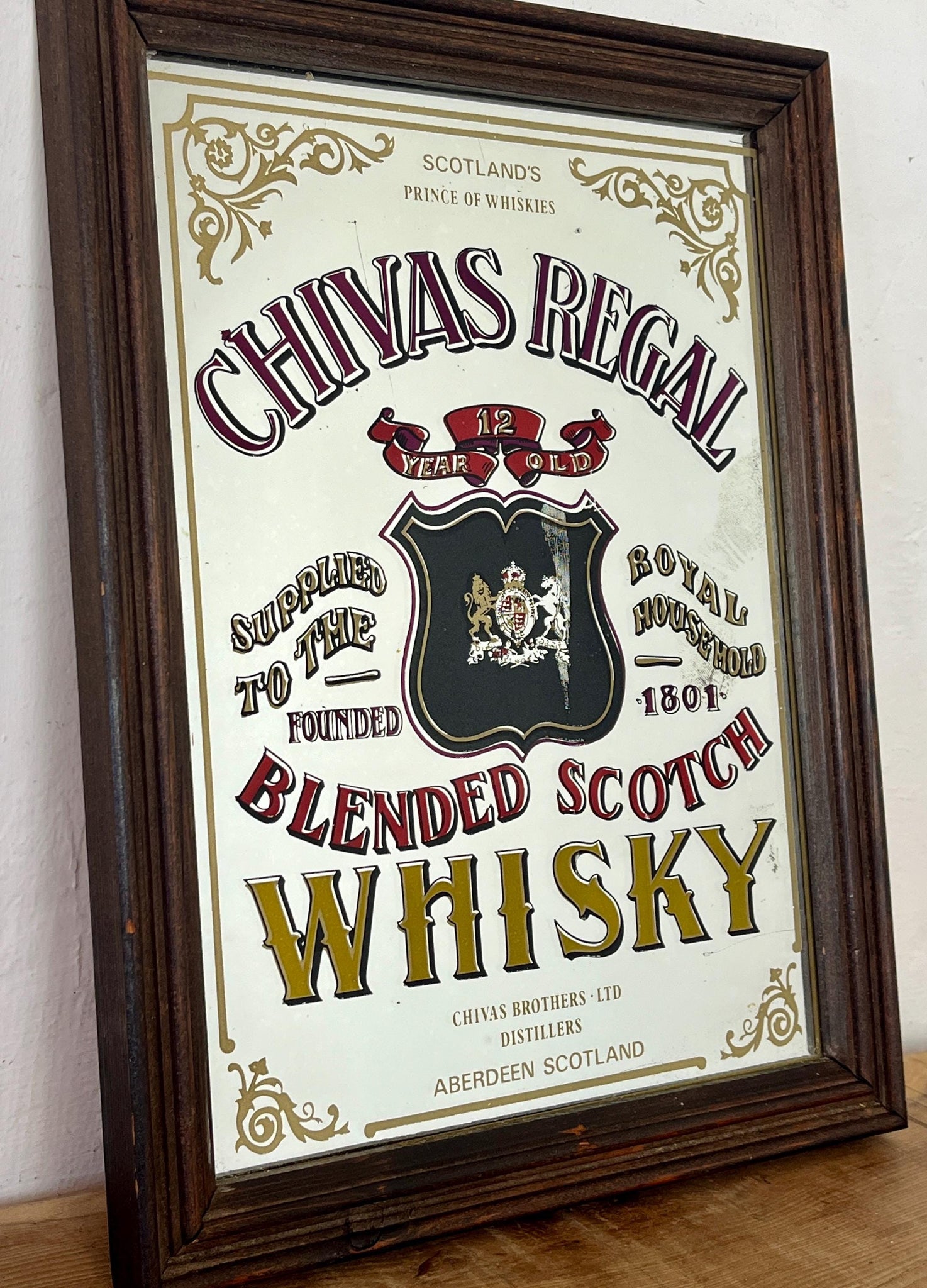 This stunning vintage mirror of Chivas Regal Scotch whisky can be used as an advertising piece or wall art in a bar or pub. The piece is a collectible item and comes from the distillery in Aberdeen, Scotland.