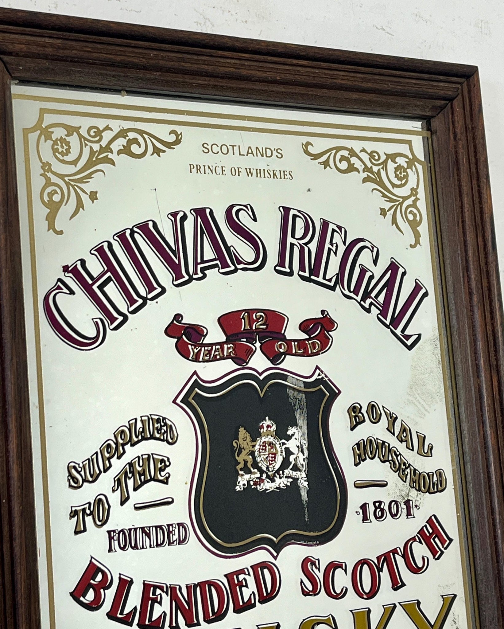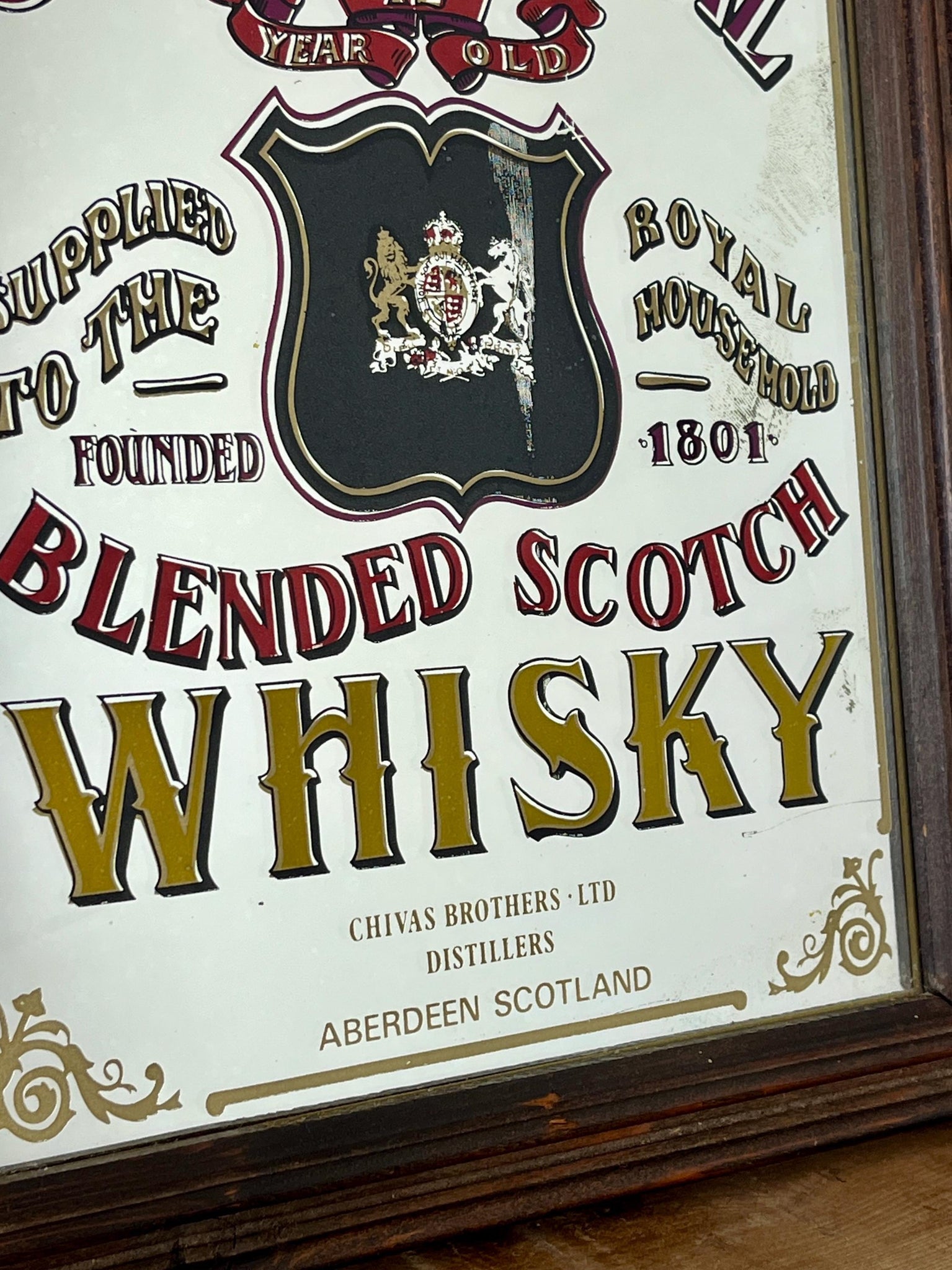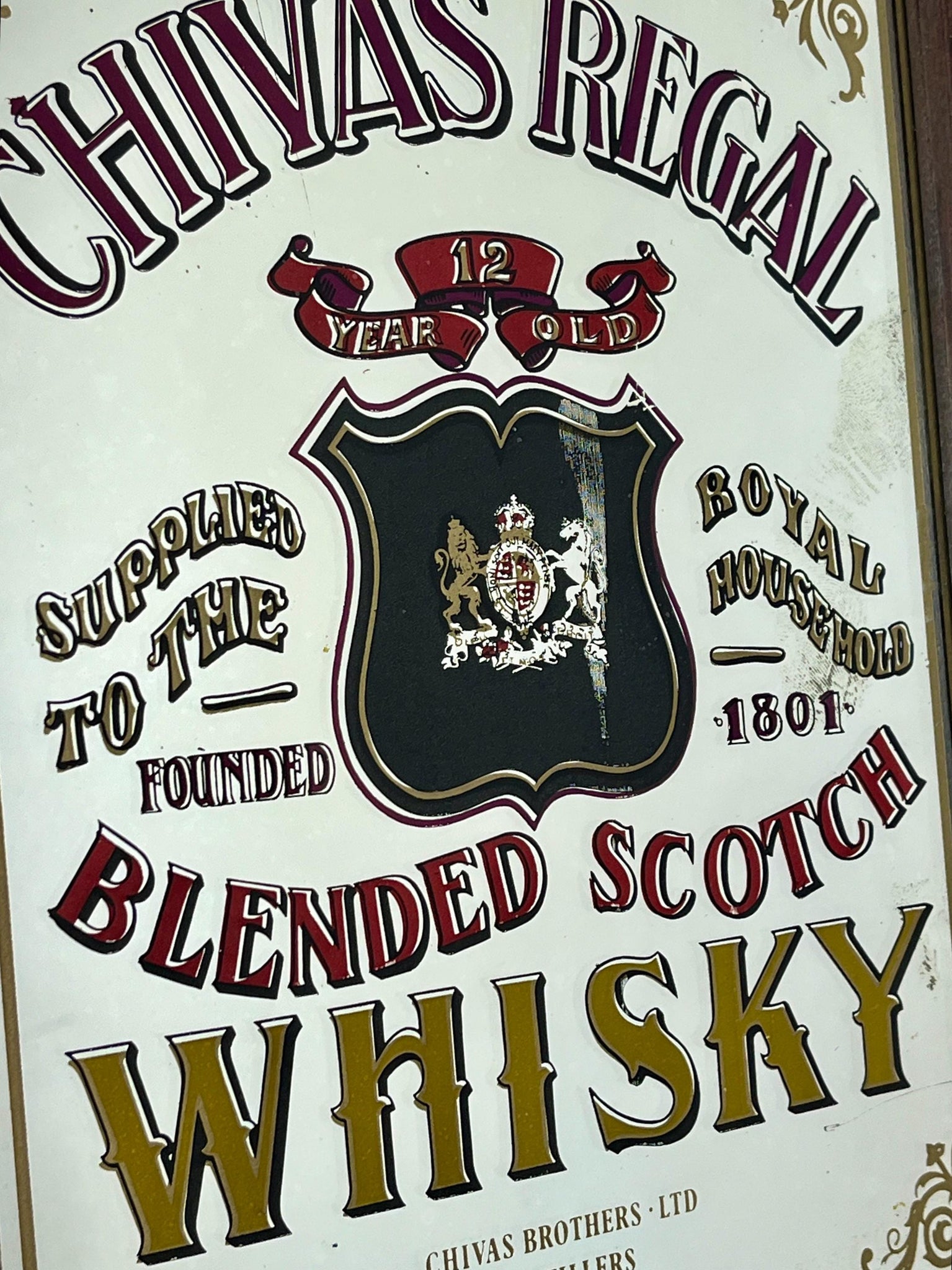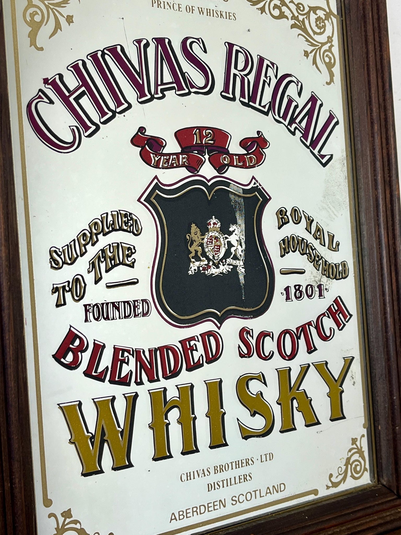 This stunning vintage mirror of Chivas Regal Scotch whisky can be used as an advertising piece or wall art in a bar or pub. The piece is a collectible item and comes from the distillery in Aberdeen, Scotland.