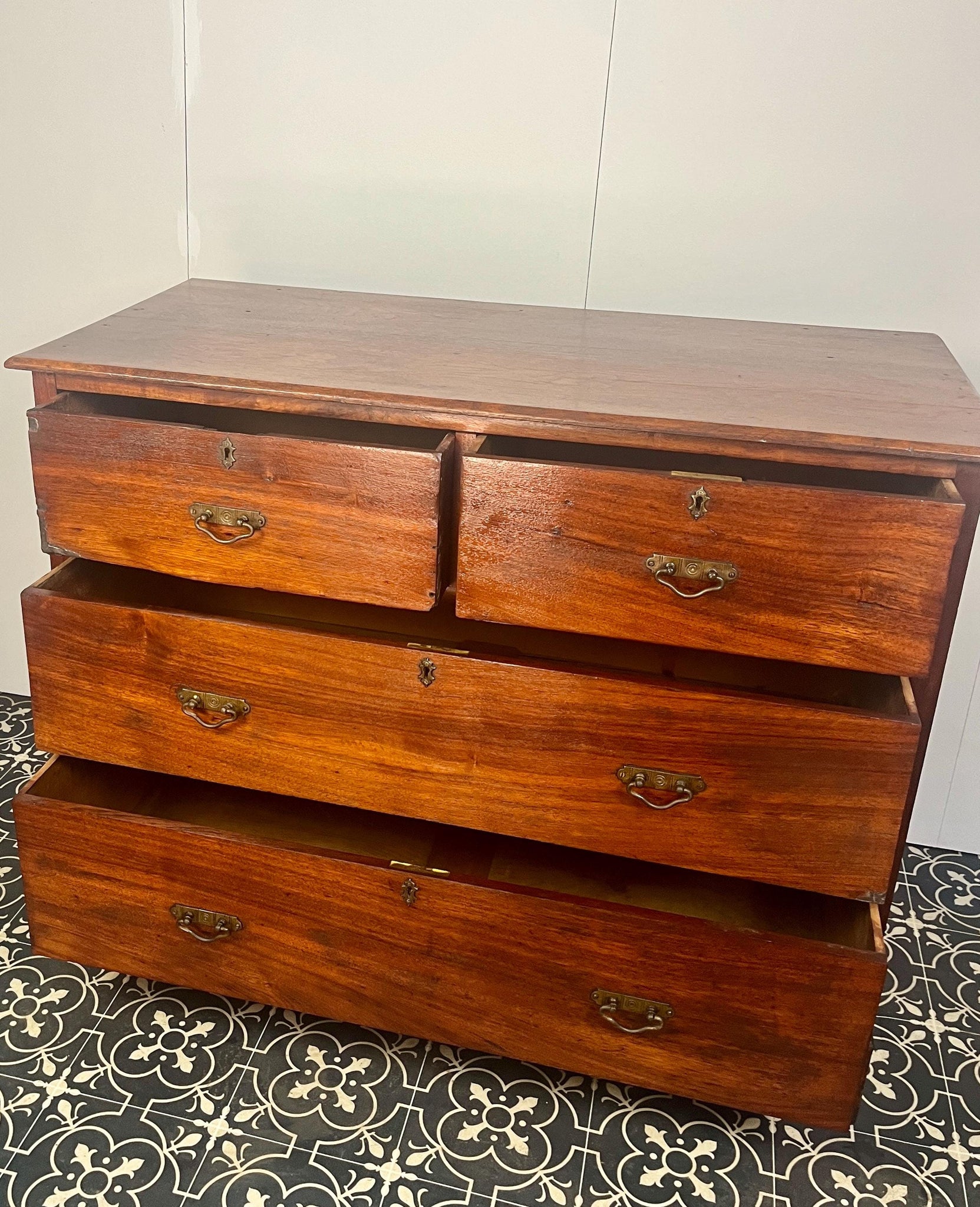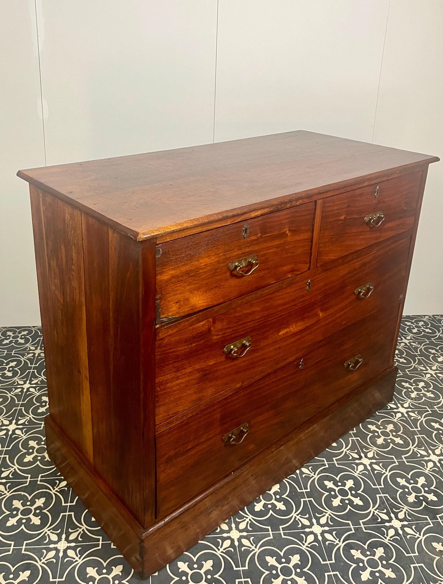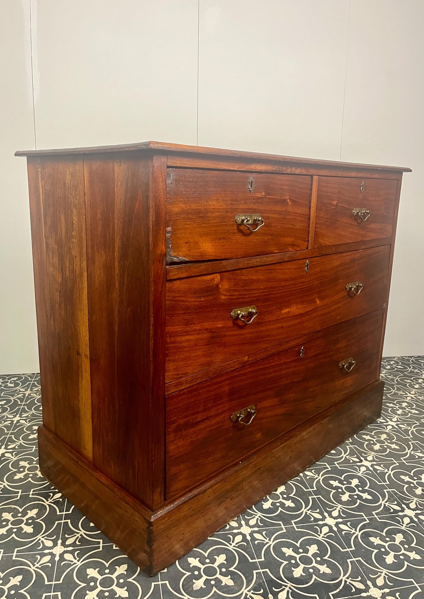 An Edwardian Arts and Crafts chest of drawers made in mahogany with brass handles and a plinth base.