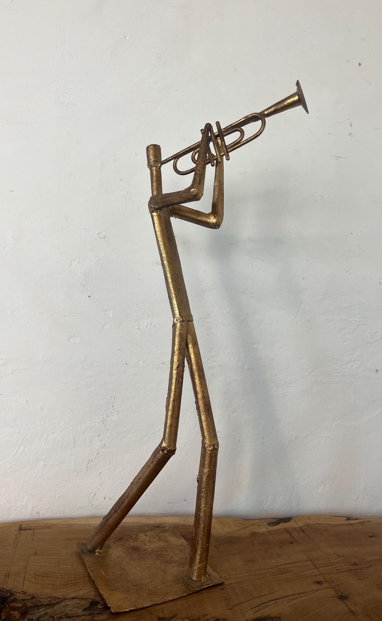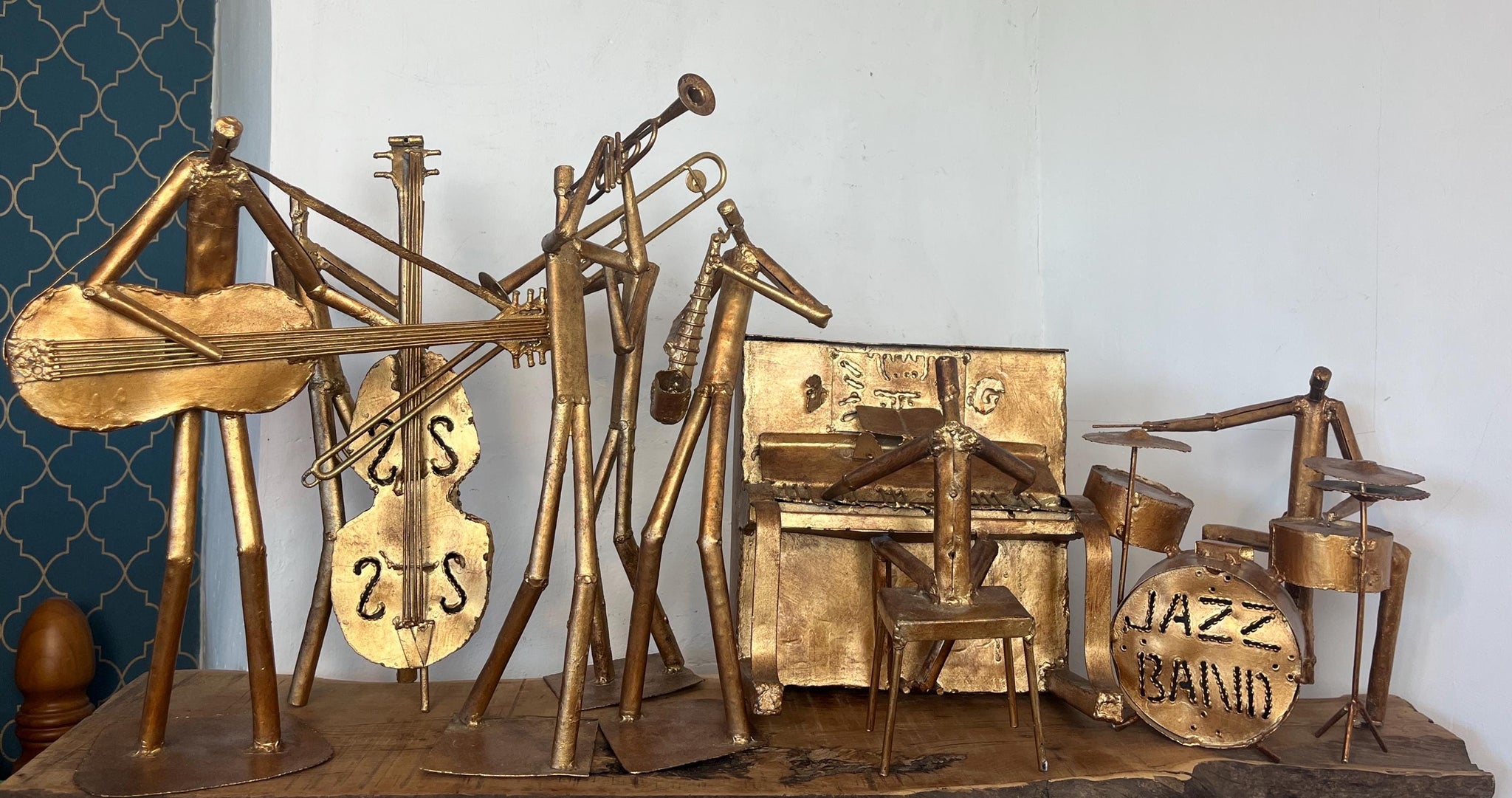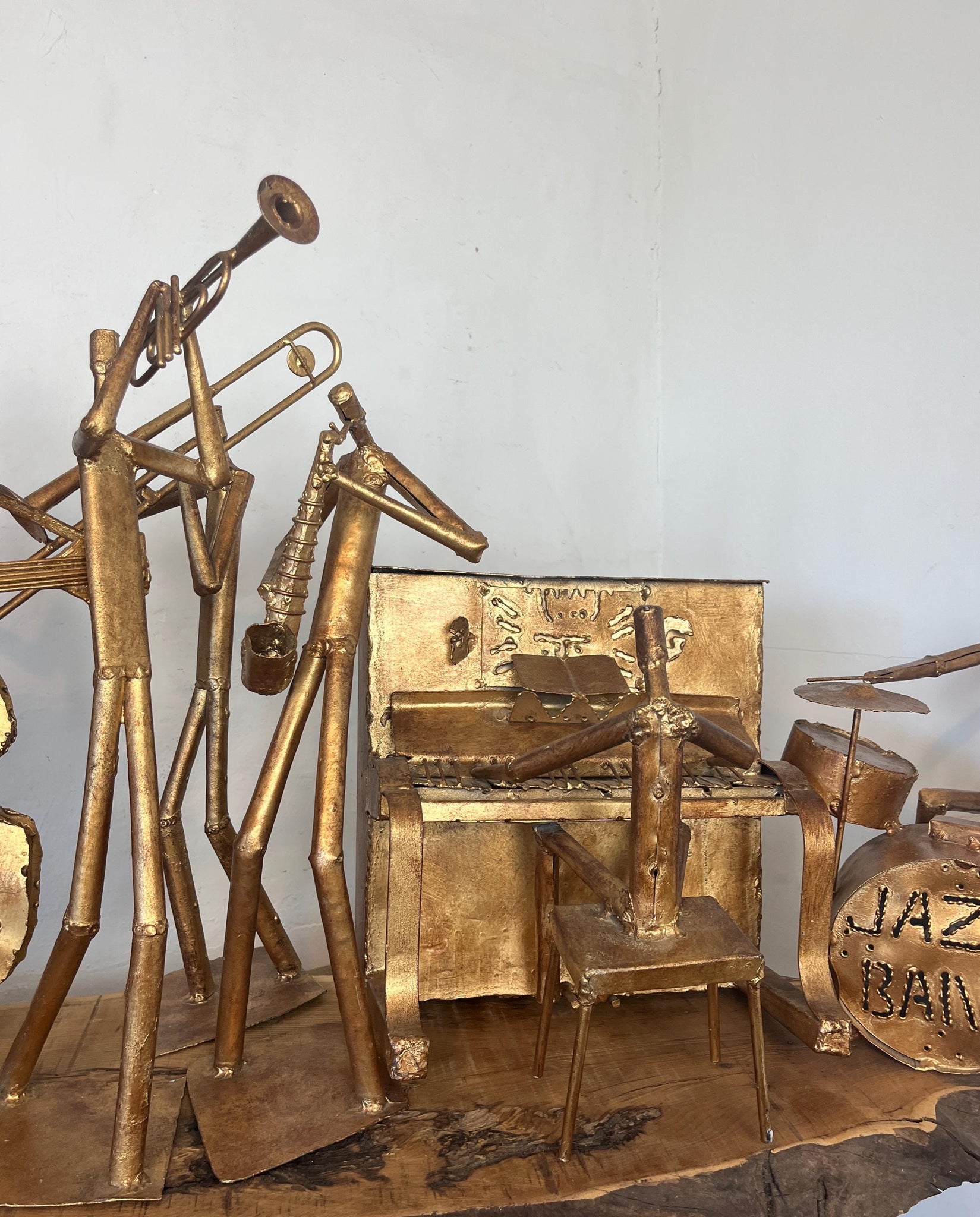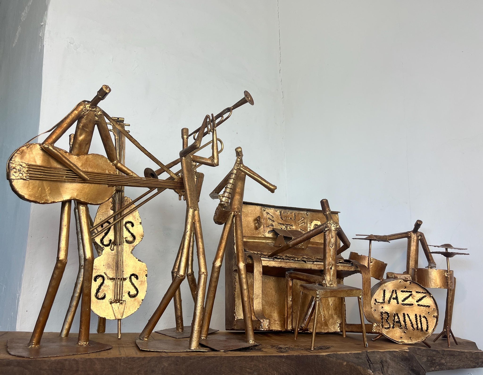 Joyful set of large, handcrafted metal folk art sculptures of a jazz band, decorative art piece unique work by a specific artist.