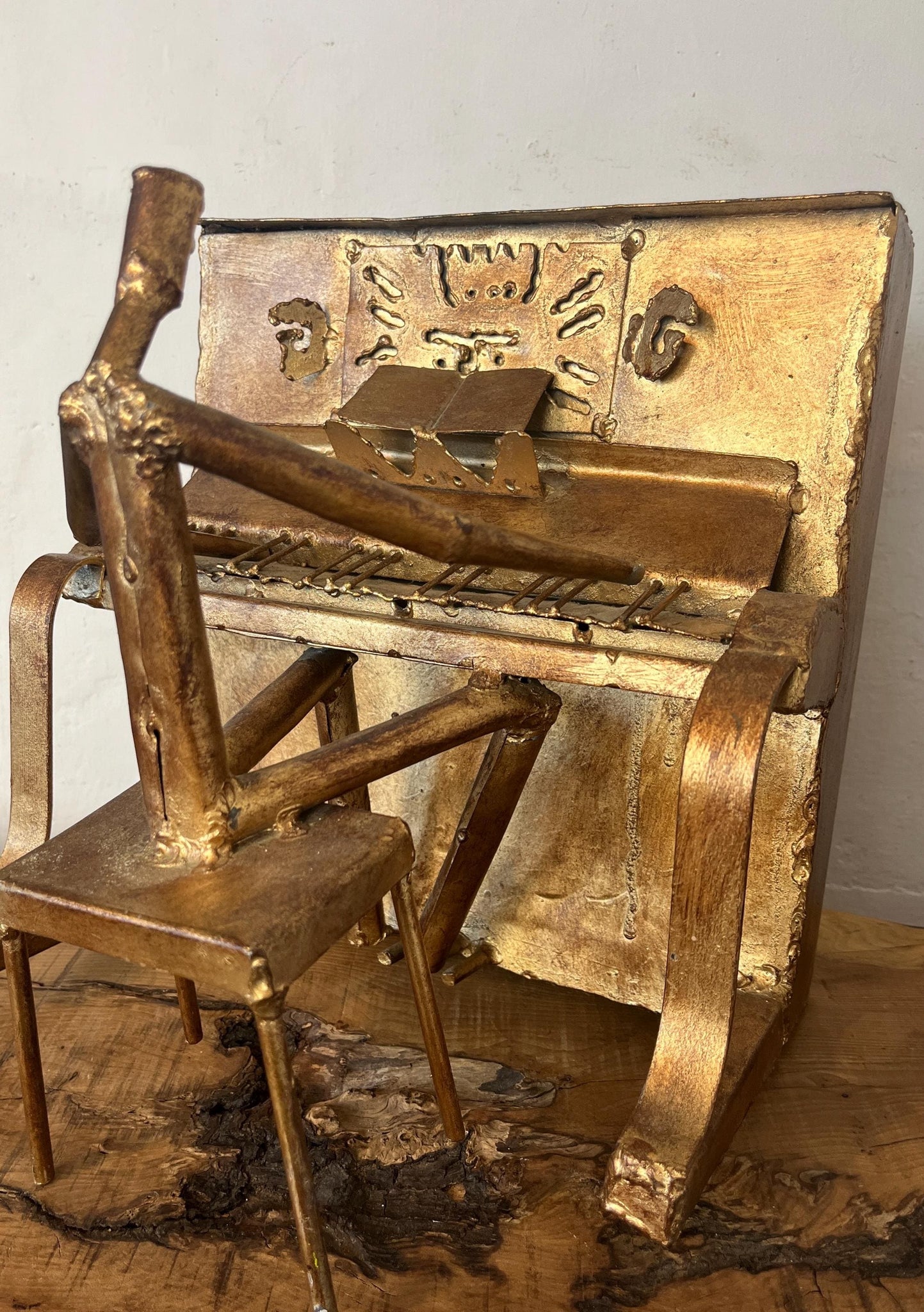 The sculptures are made of metal, possibly mix of brass, steel, or iron, with a gold or bronze finish. The sculptures are crafted from metal tubing and sheeting,