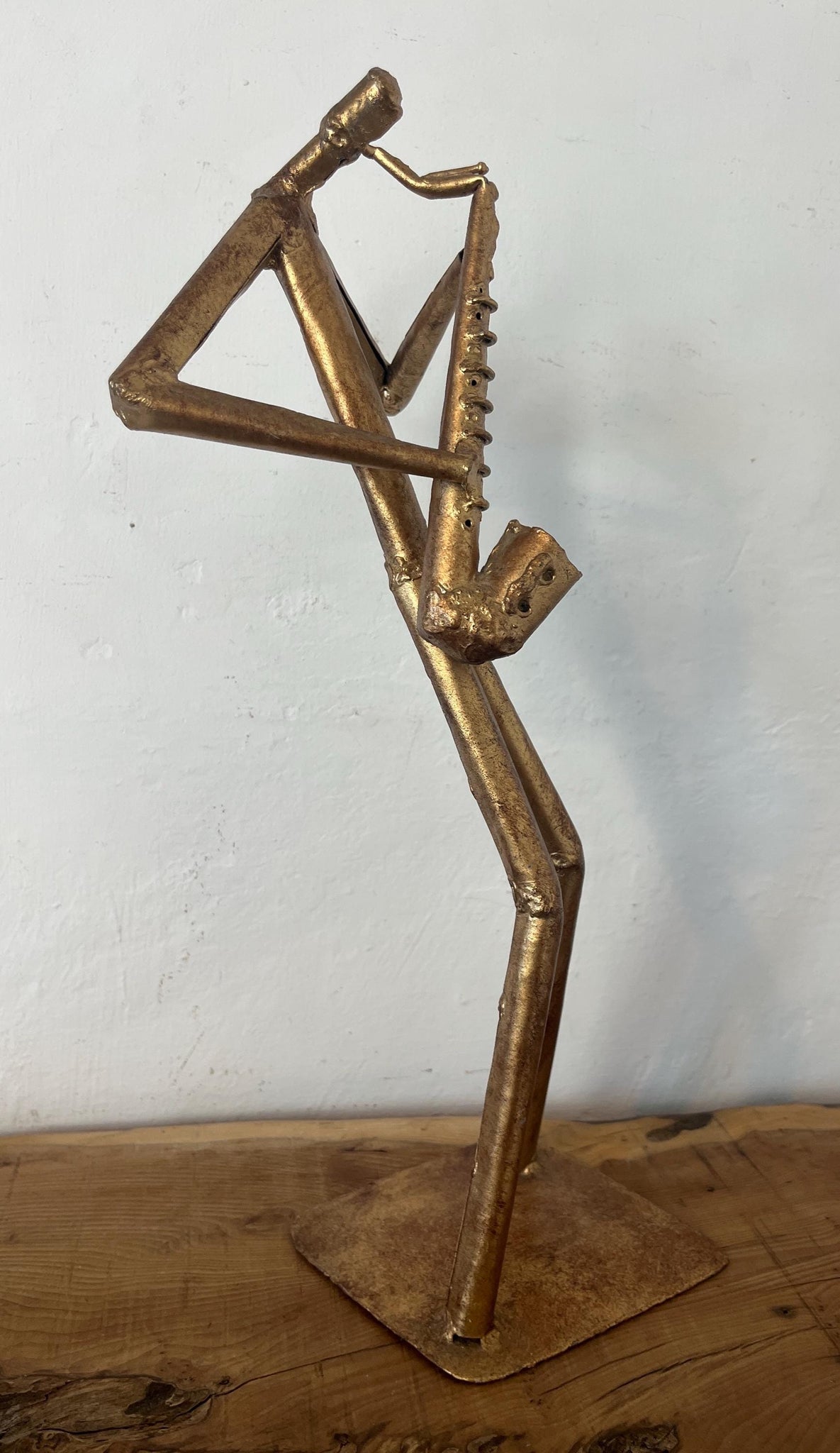The distinctive style, often referred to as "tube" or "brutalist" metal art, is popular for its abstract, elongated figures.