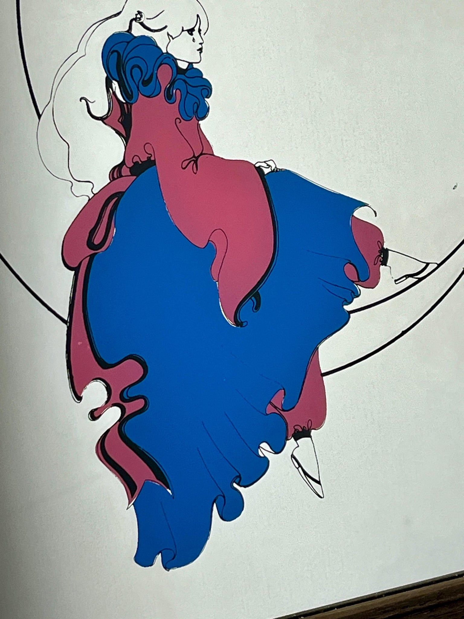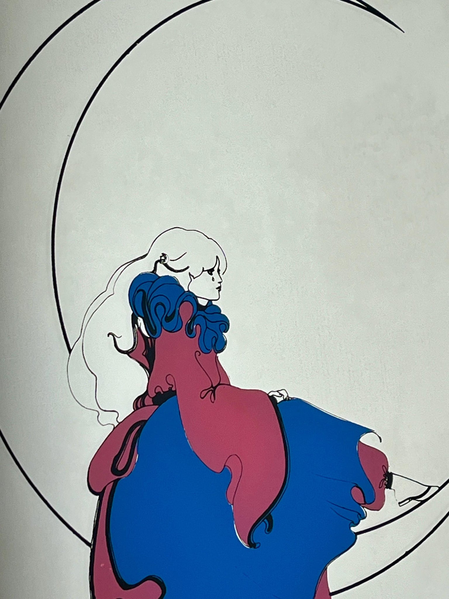 The piece exhibits characteristics of the Art Deco movement, which was popular in the 1920s and 30s, featuring stylised female figures and celestial motifs. It depicts a woman with long, flowing white hair, wearing a pink and blue dress, seated on an extensive black crescent moon outline.