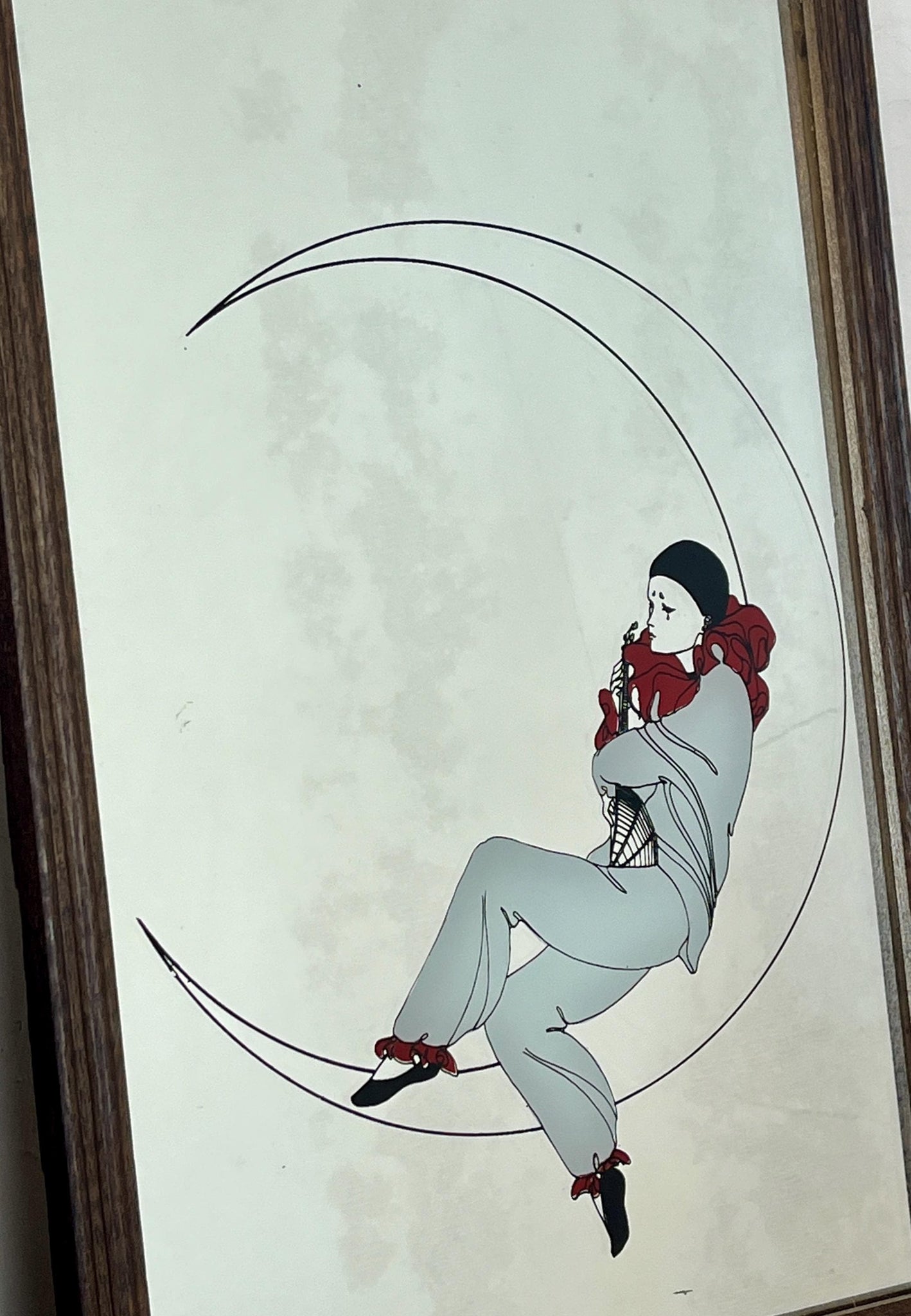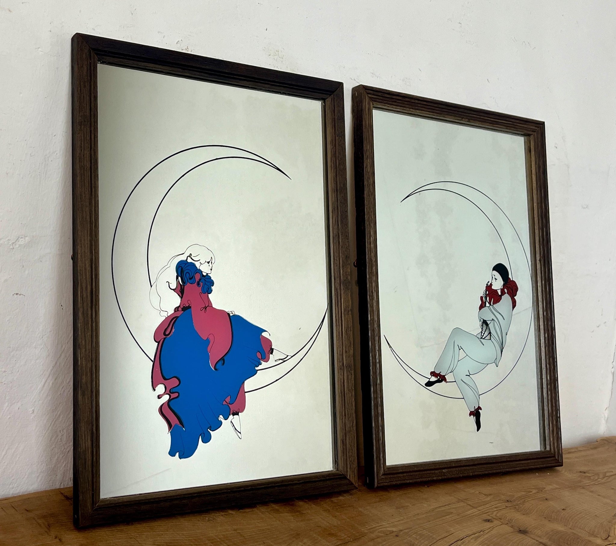This pair of stunning Art Deco mirrors depicting a Pierrot or Harlequin on a crescent moon is an illustration, first and foremost, of a woman in an Art Deco style, vintage from the mid-20th century.