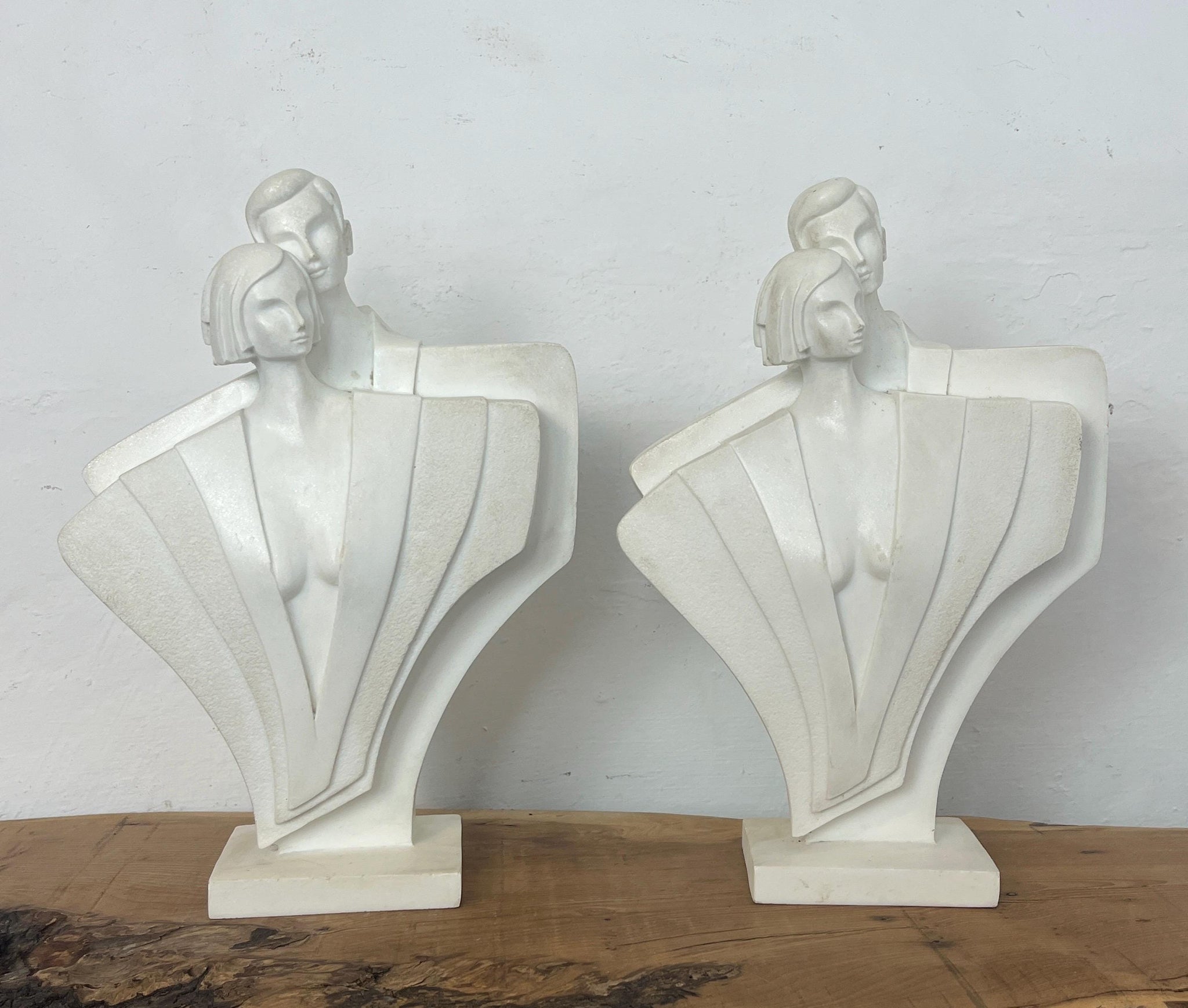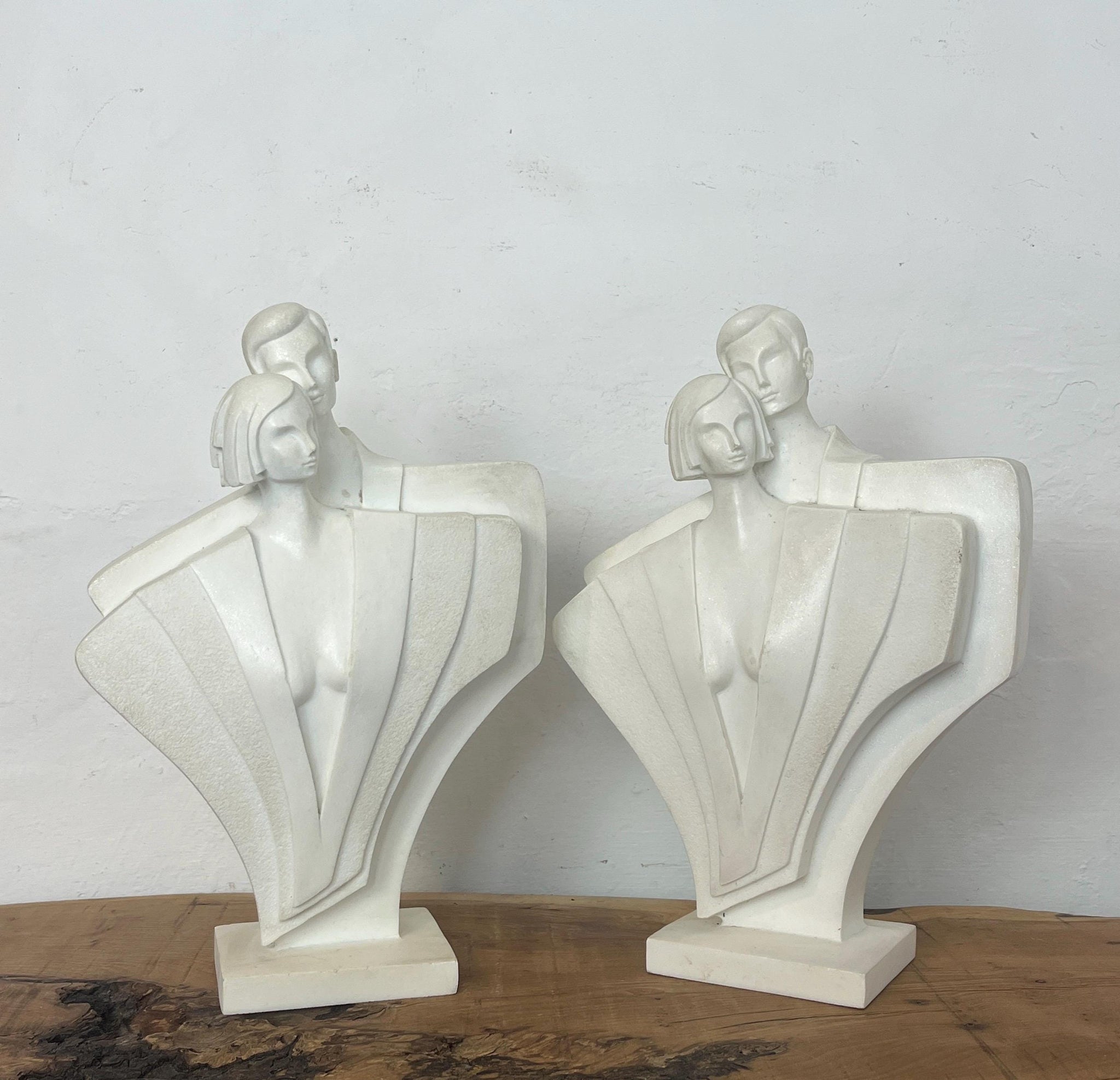 The sculptures depict a man and a woman in stylised, fashionable poses. The woman features a sharp bob haircut and flowing lines that suggest clothing or a fan, while the man appears behind her with a sleek, abstract appearance.