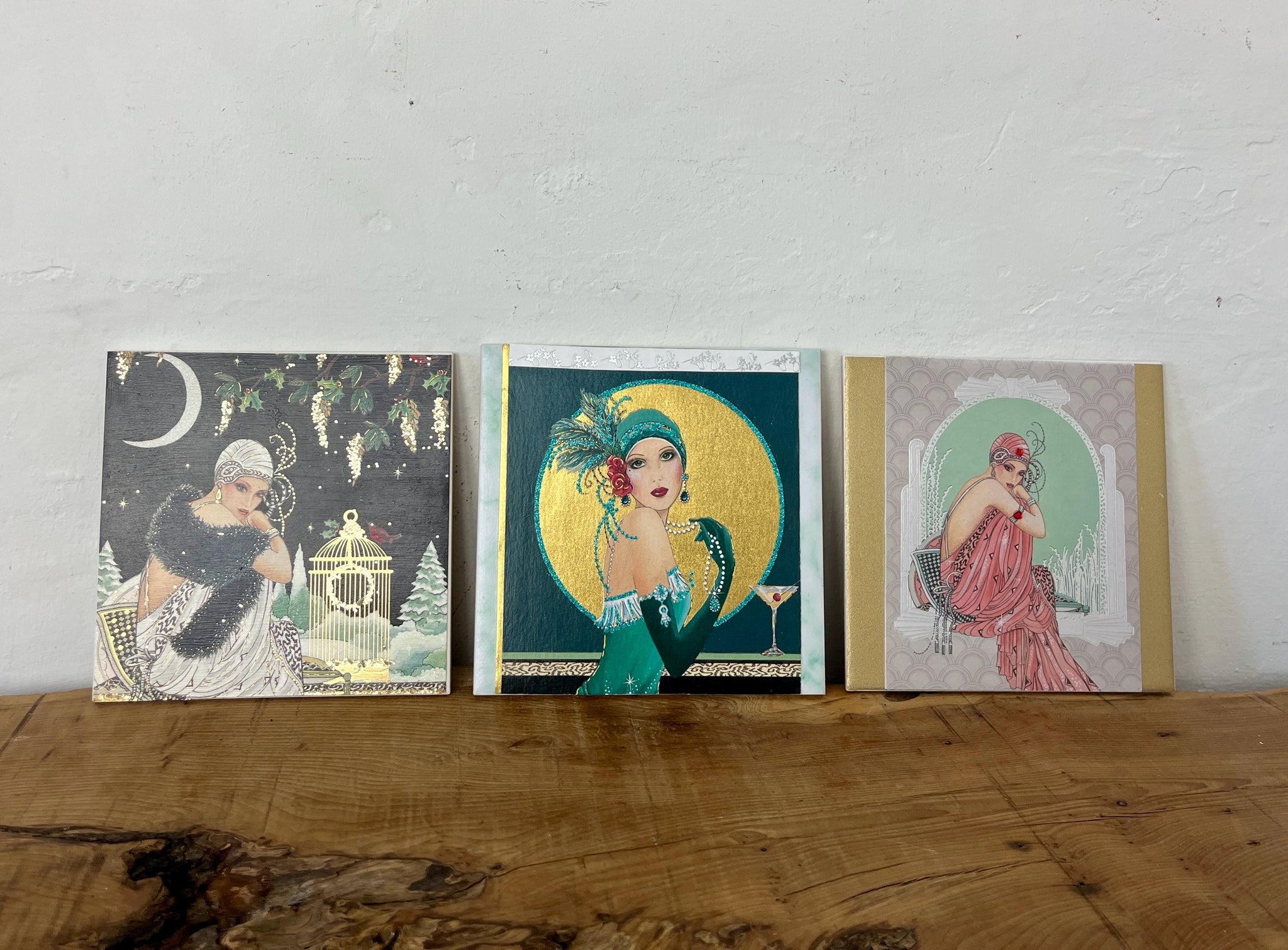 The last Art Deco-style picture features an illustration of a woman in a pink dress sitting in a chair against a background with architectural elements.