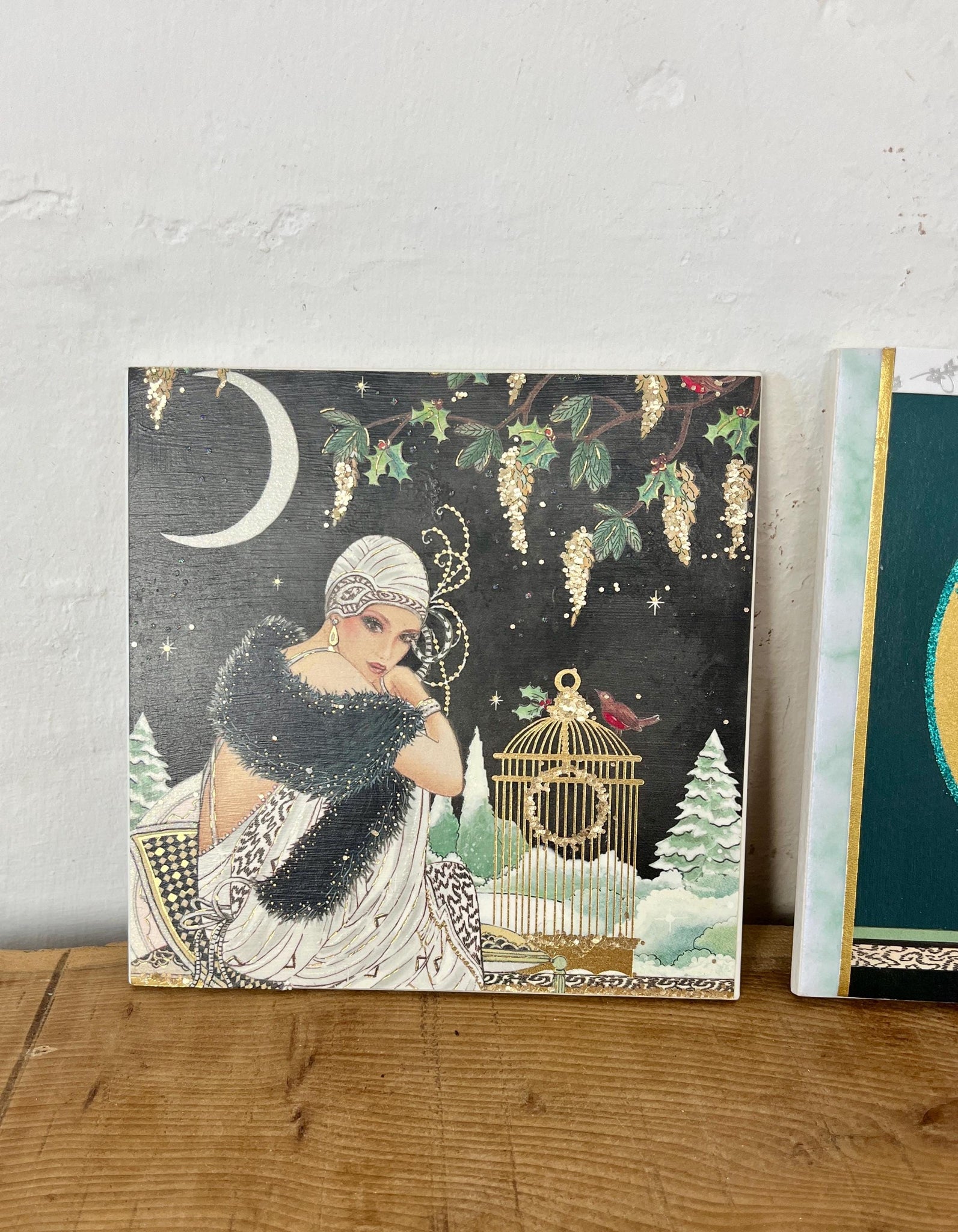 Art Deco-style artwork featuring a woman in a white dress and a black fur stole, sitting next to a gilded birdcage under a crescent moon and wisteria.