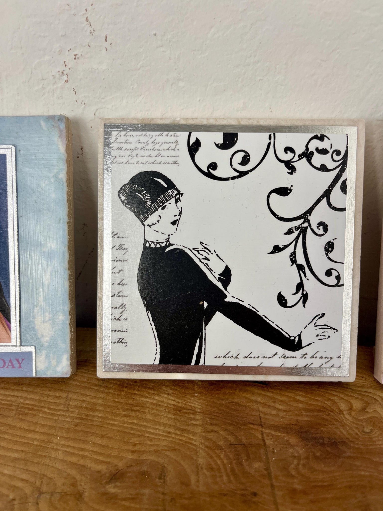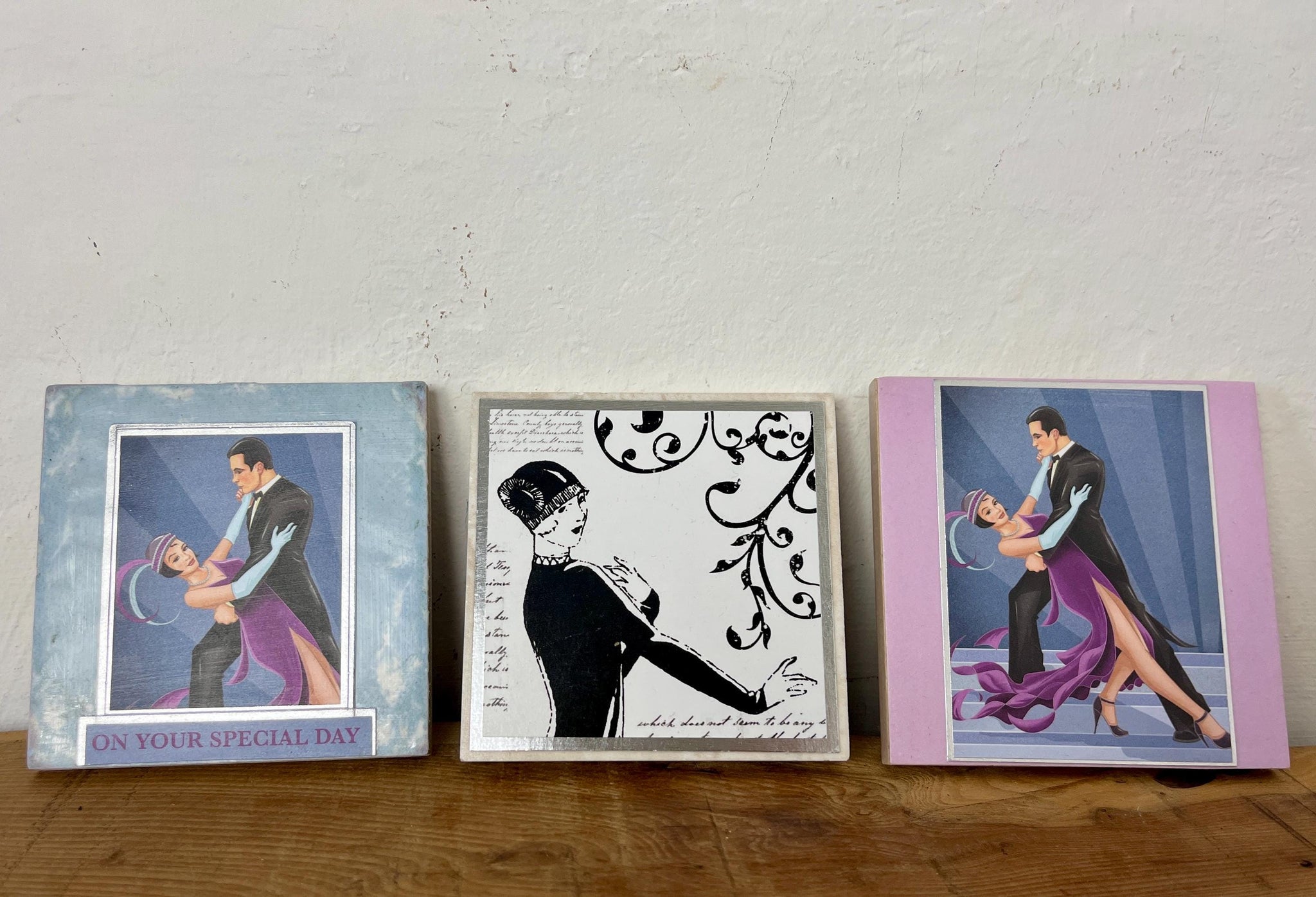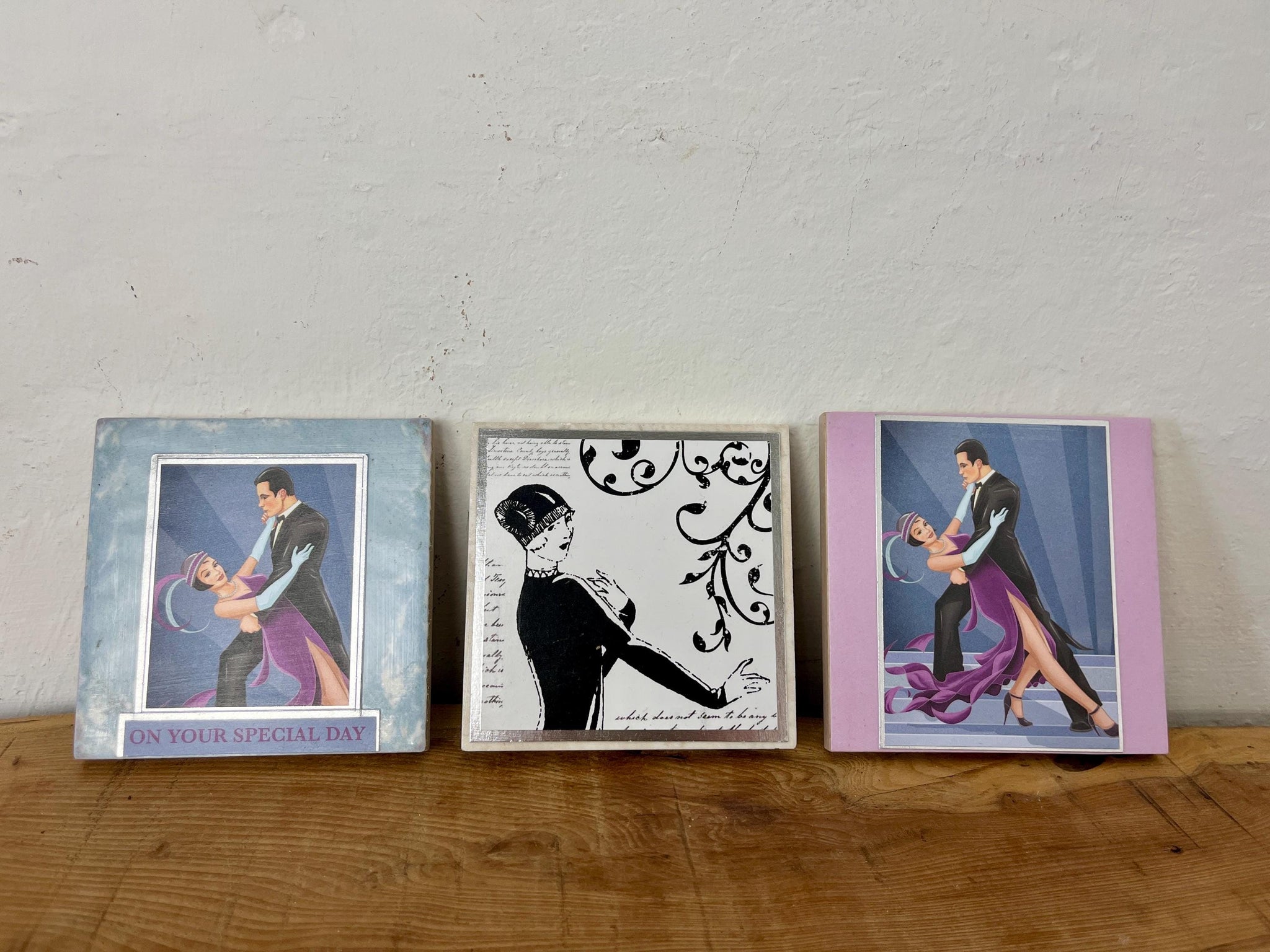 Lovely set of 3 Art Deco-style framed pictures, decorative tiles, featuring illustrations of a couple dancing and a flapper girl.
