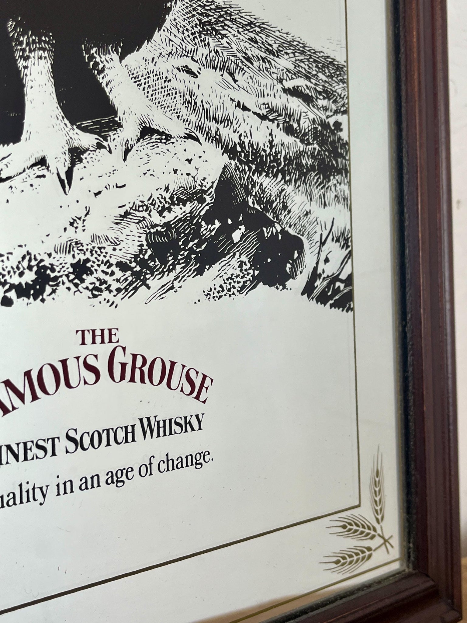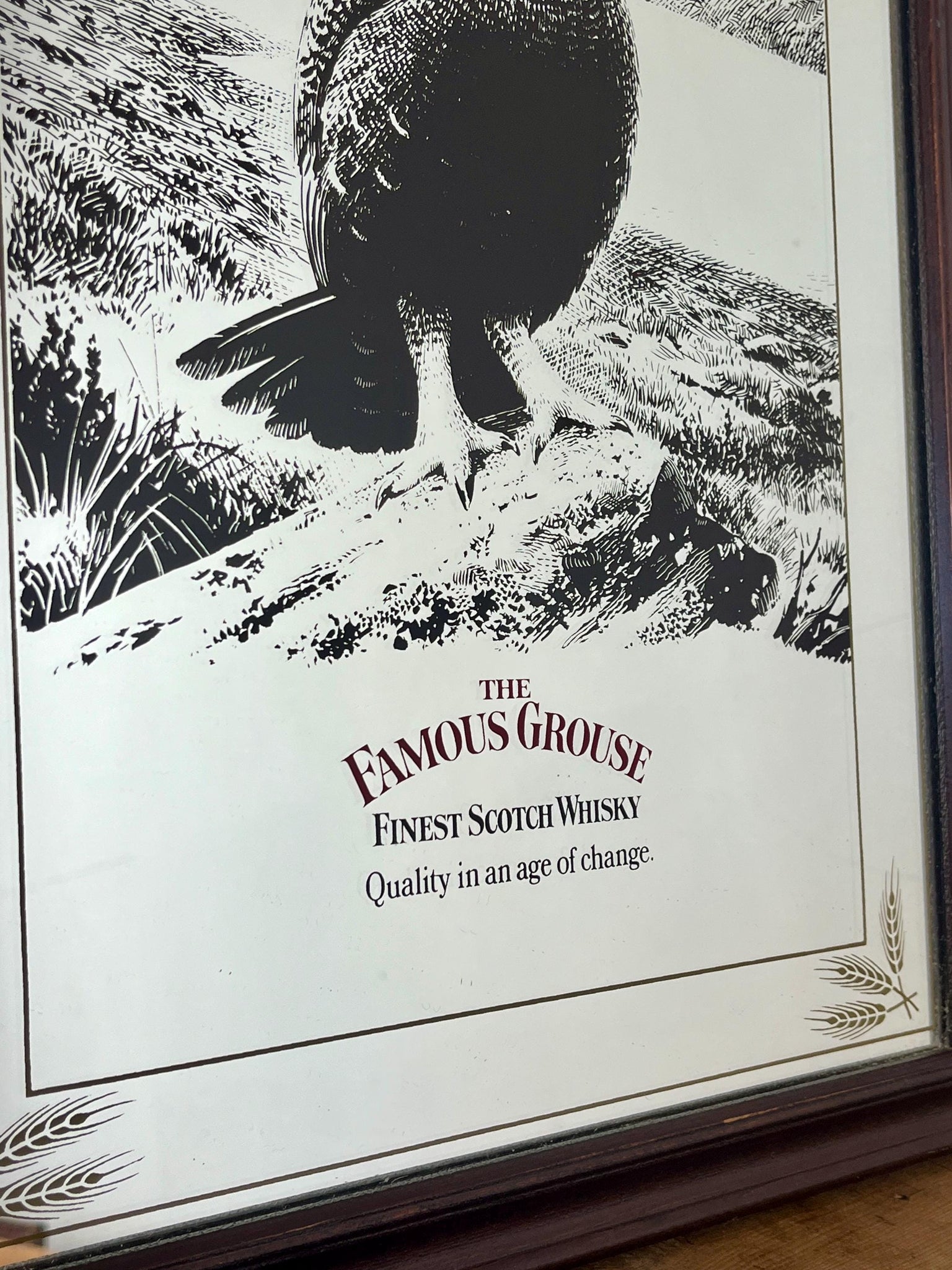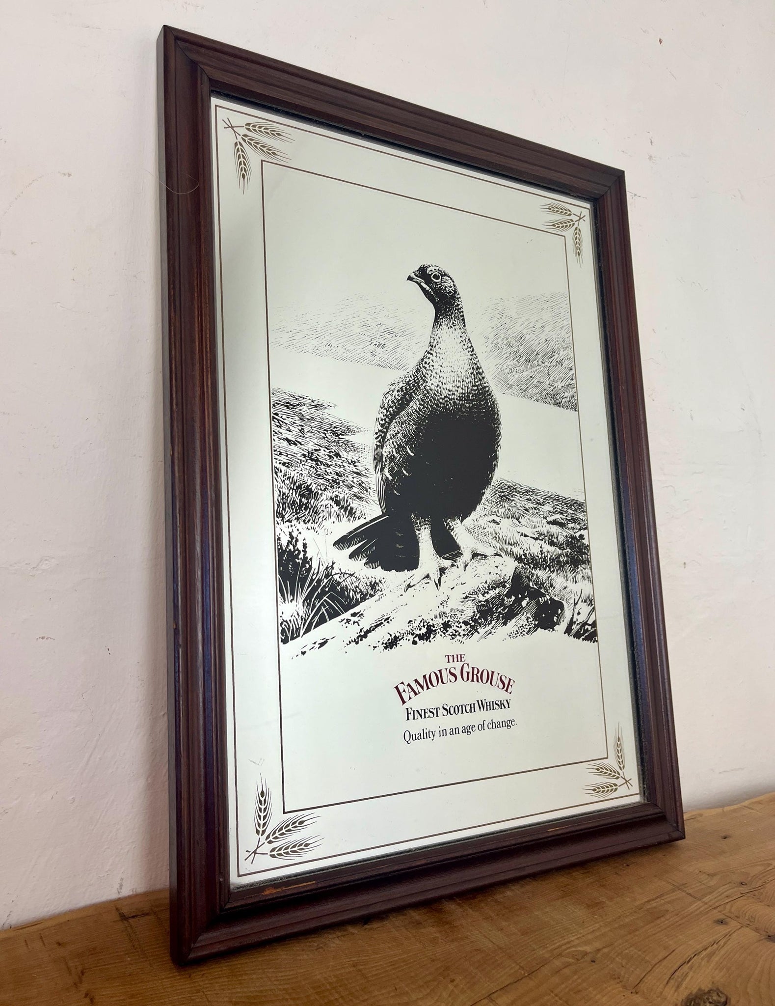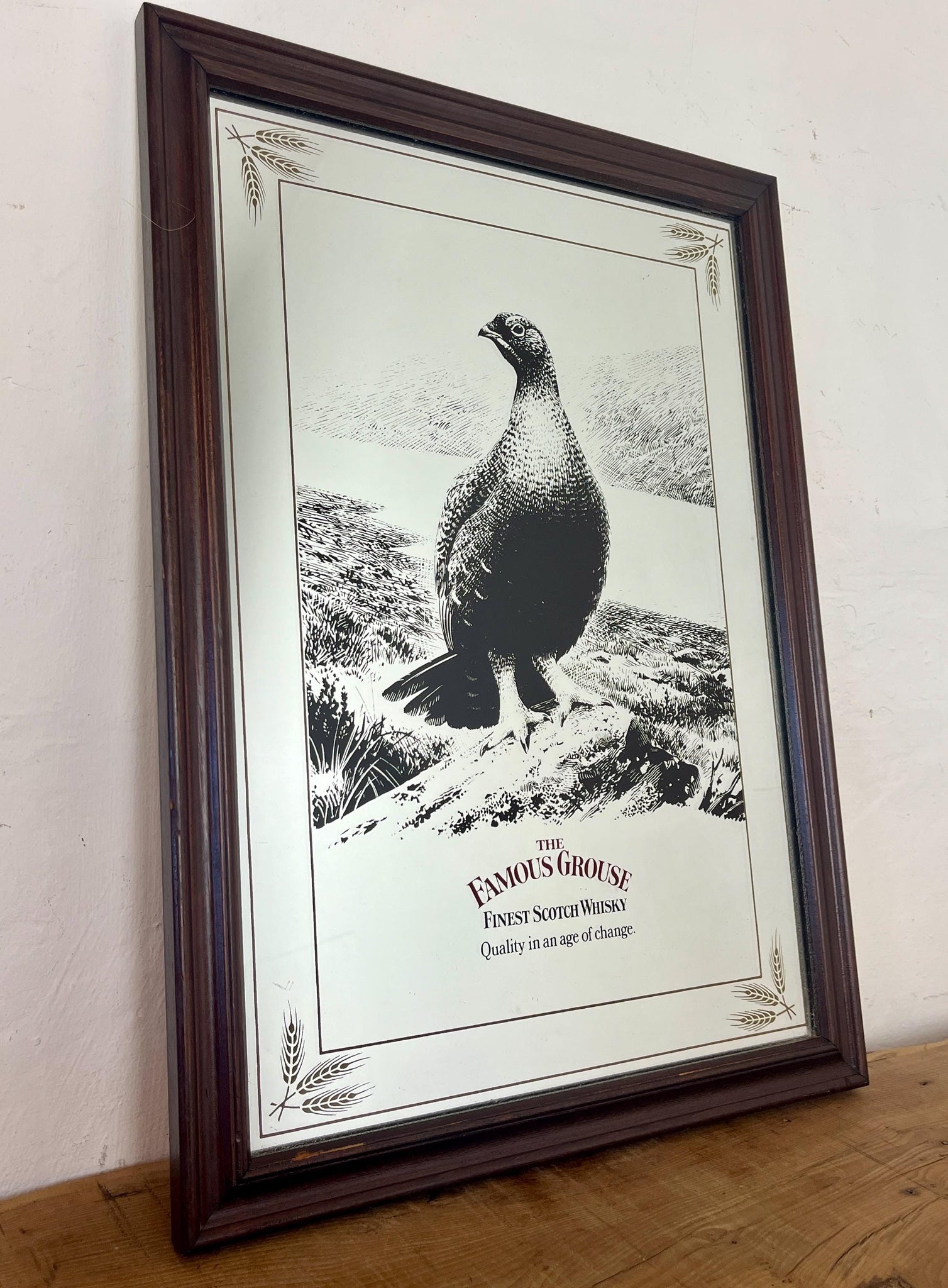The Famous Grouse advertising wall mirror featuring the brand's iconic red grouse image and the slogan "Quality in an age of change"