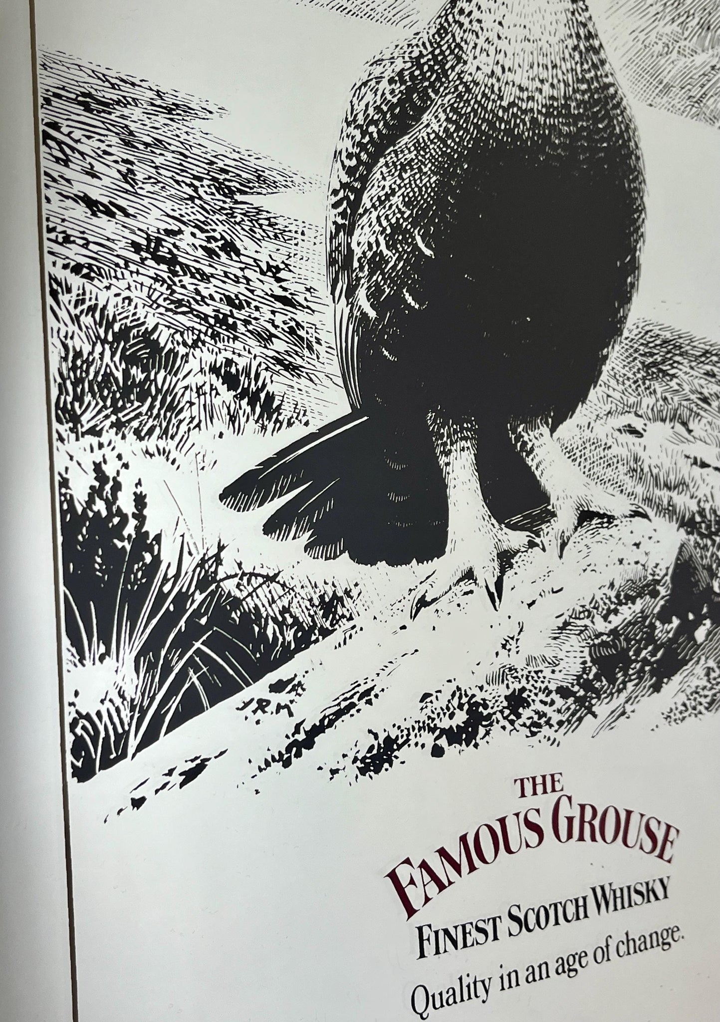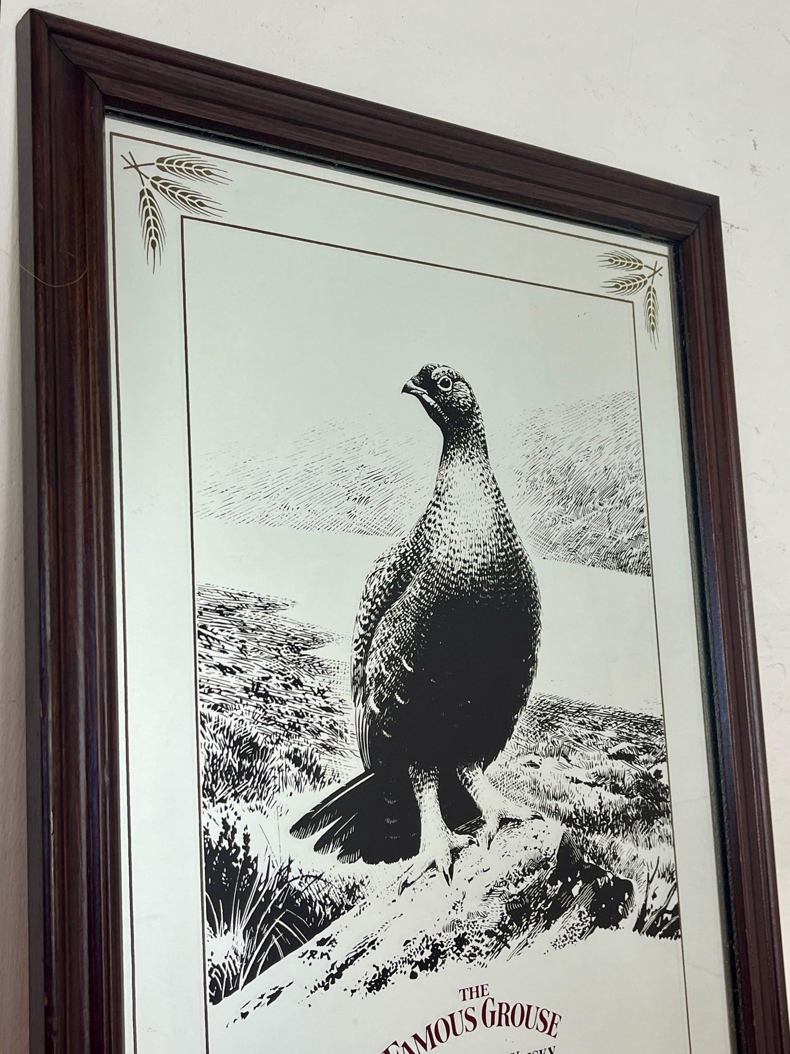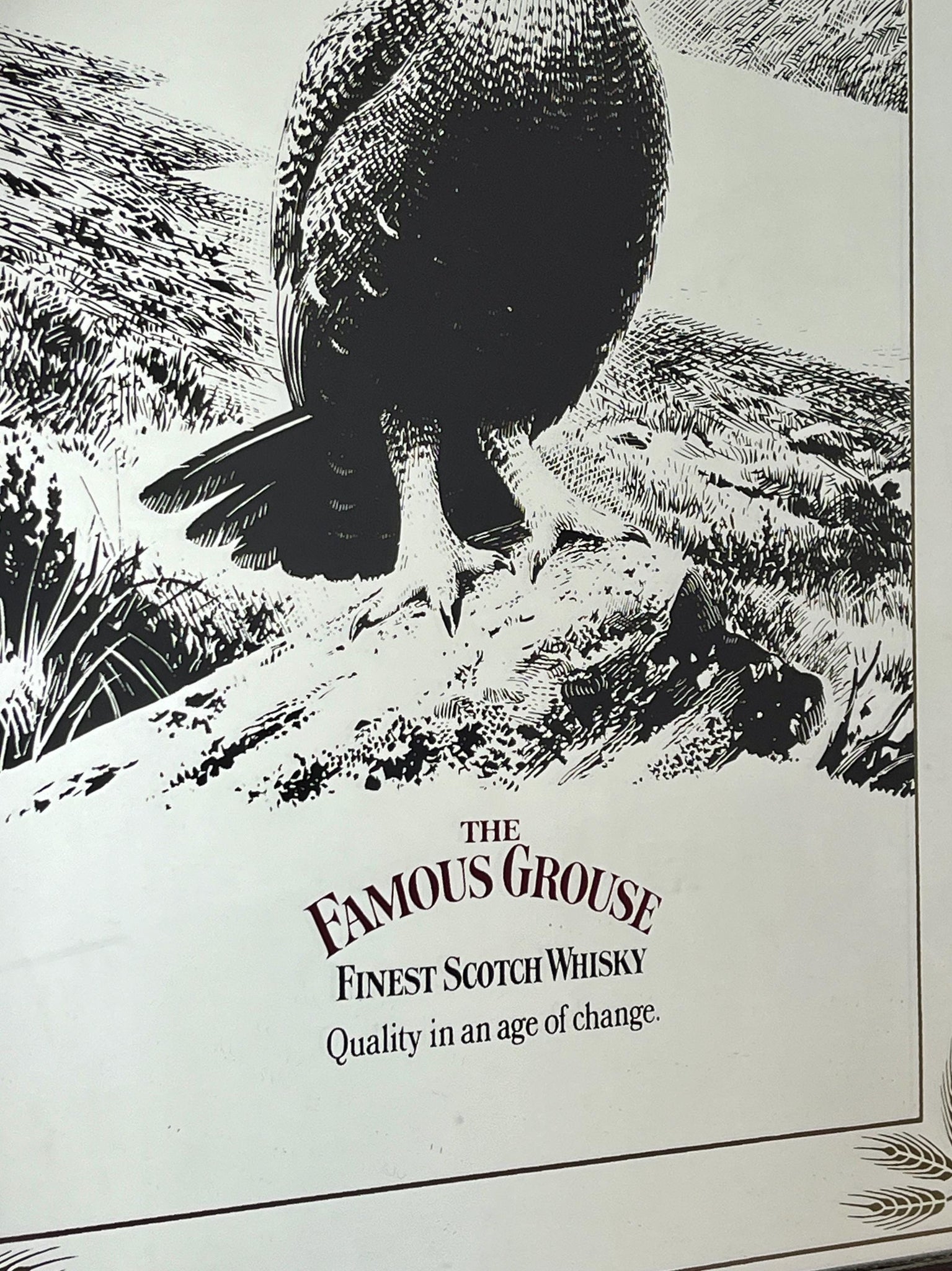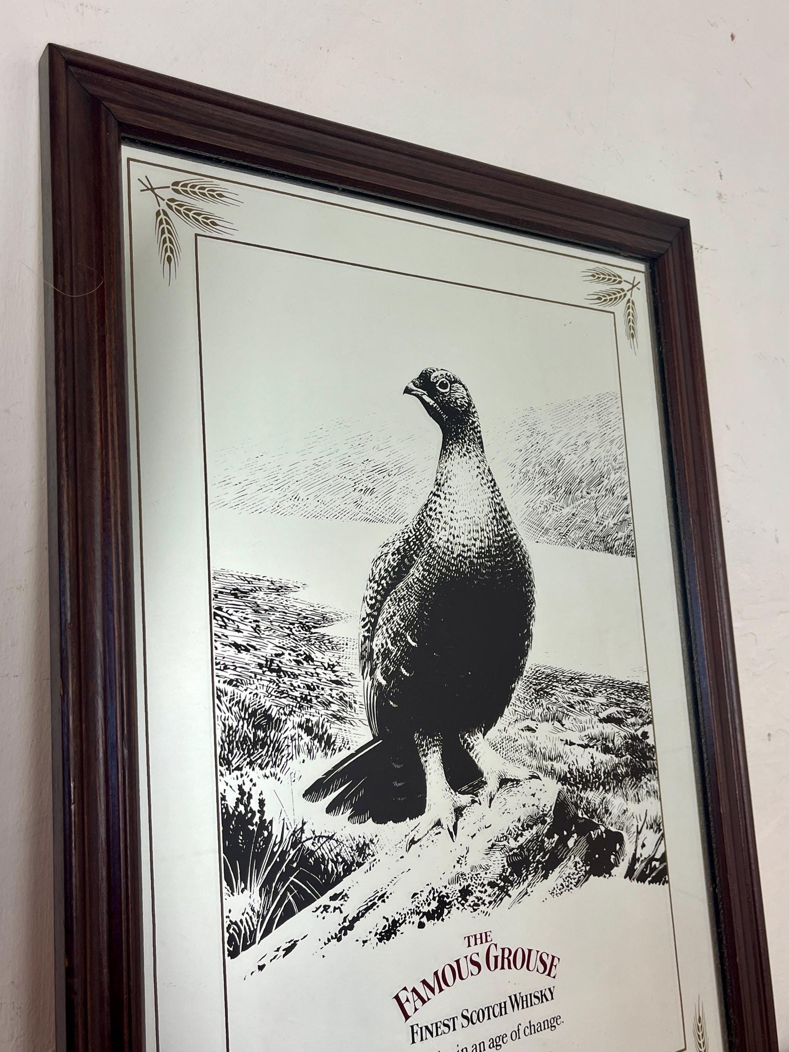 The Famous Grouse advertising wall mirror featuring the brand's iconic red grouse image and the slogan "Quality in an age of change"