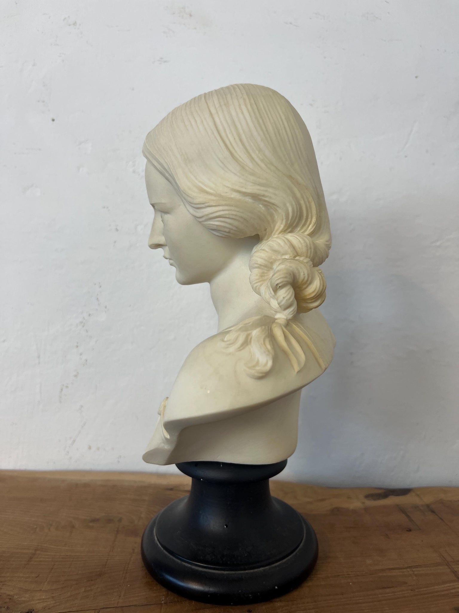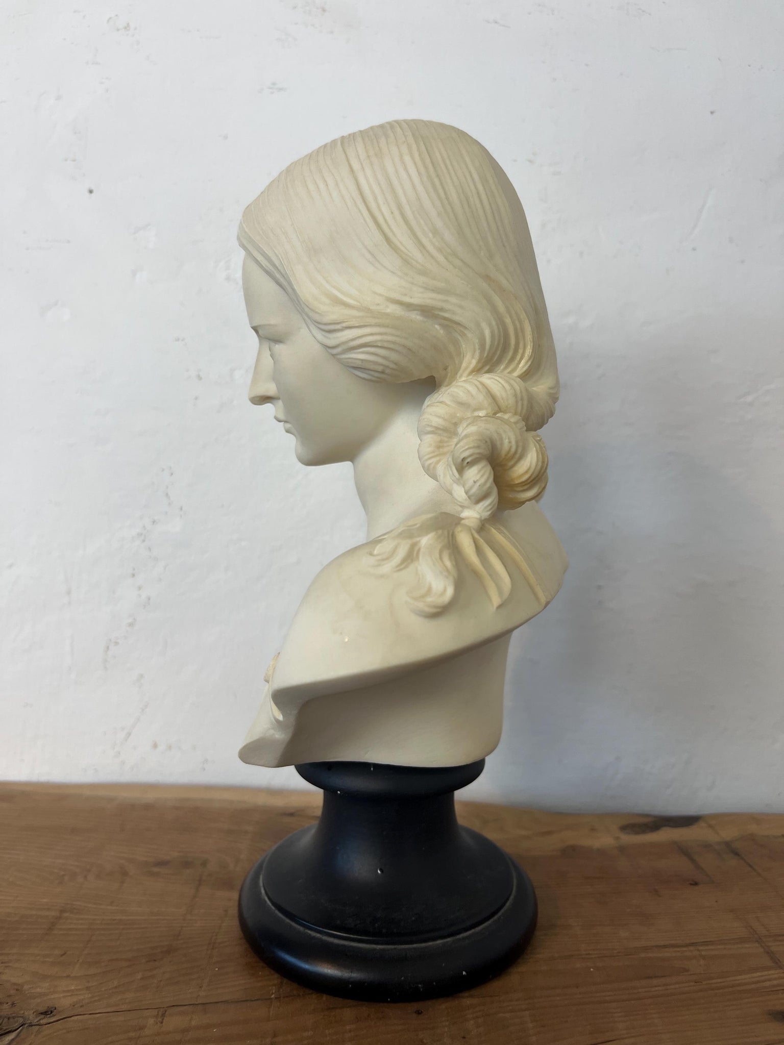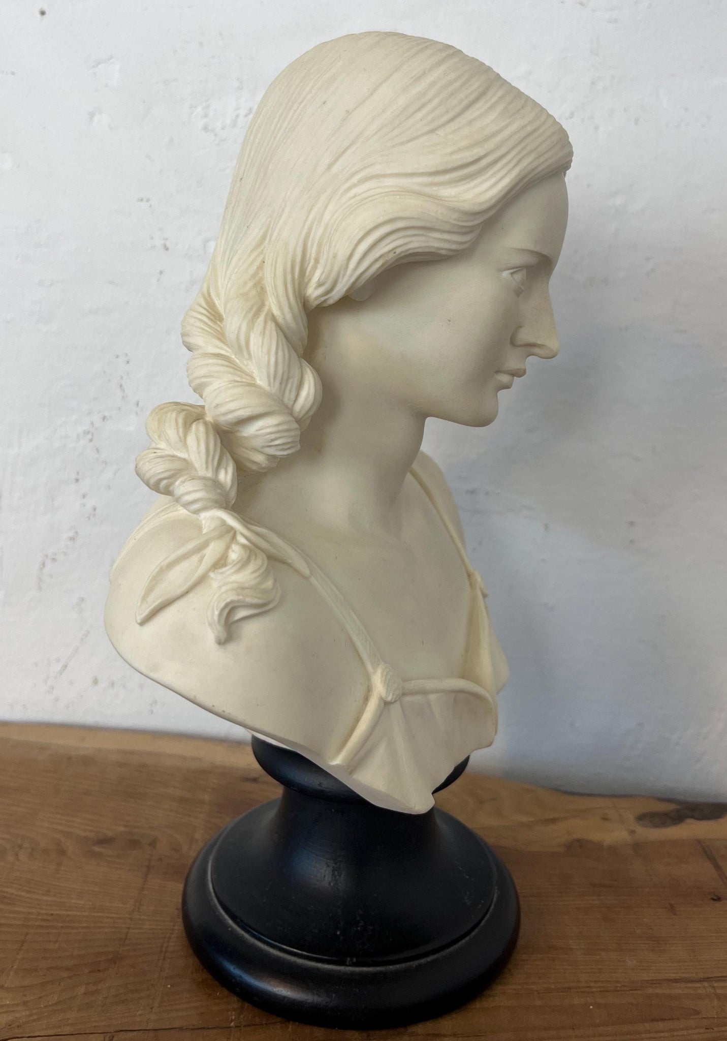 The bust has an antiqued white or ivory finish and is mounted on a separate, round, ebonised (black) base.