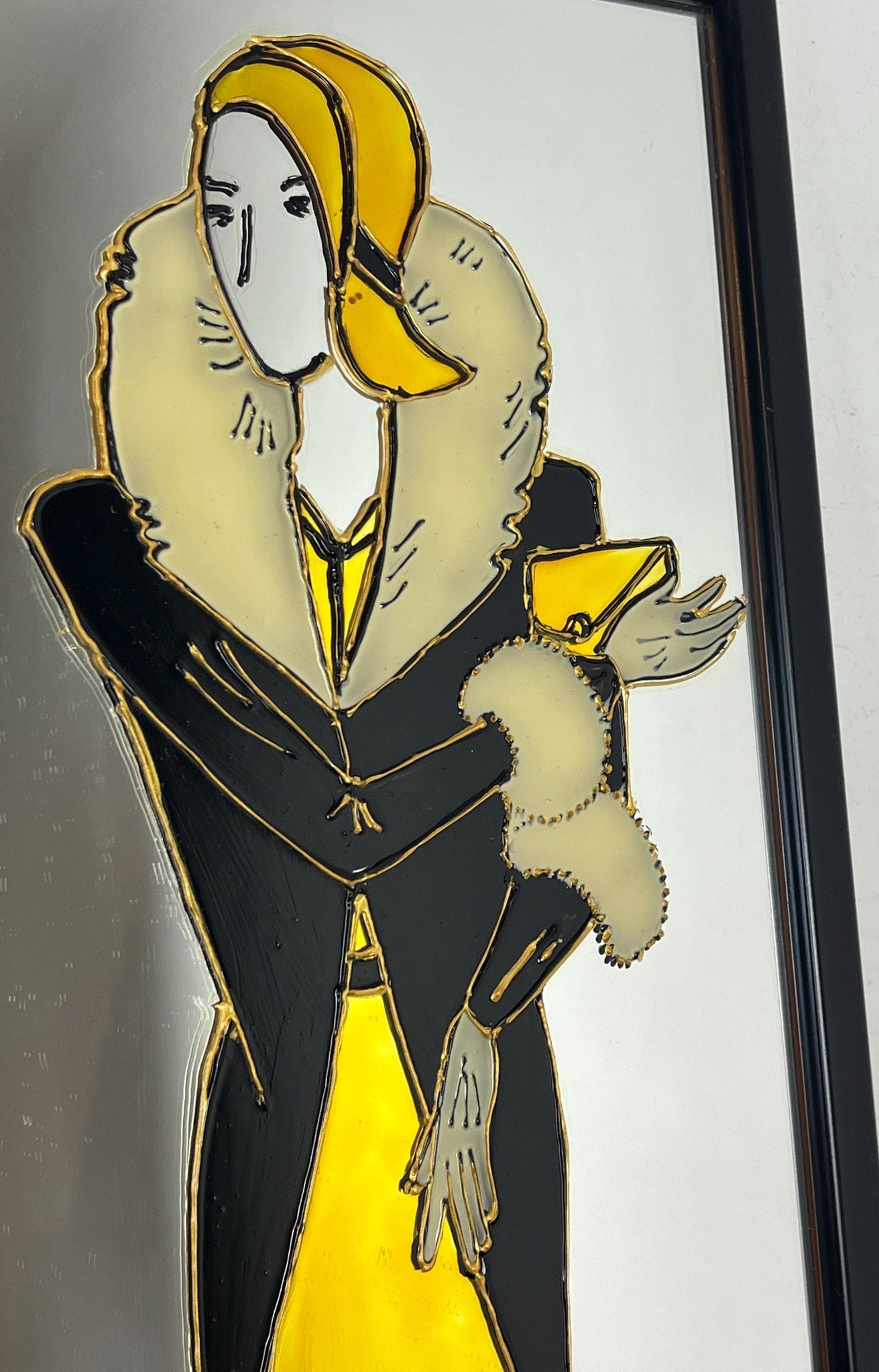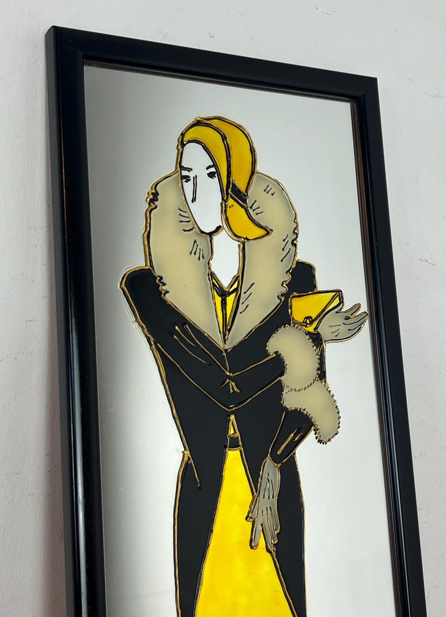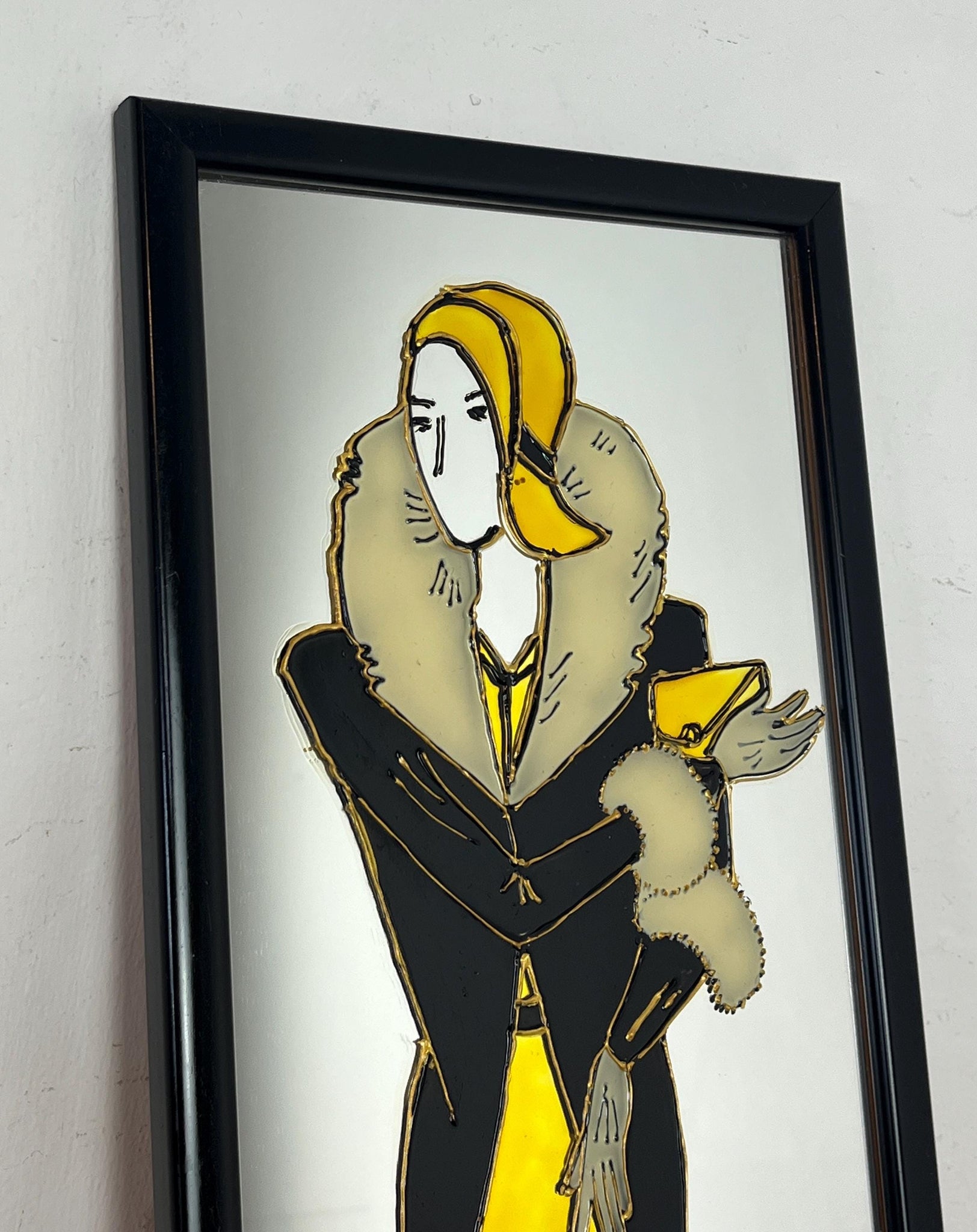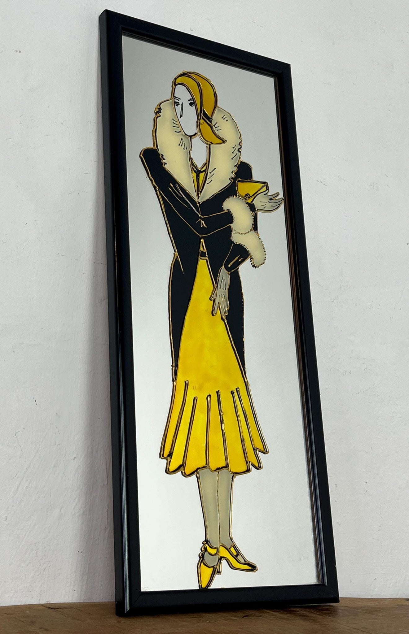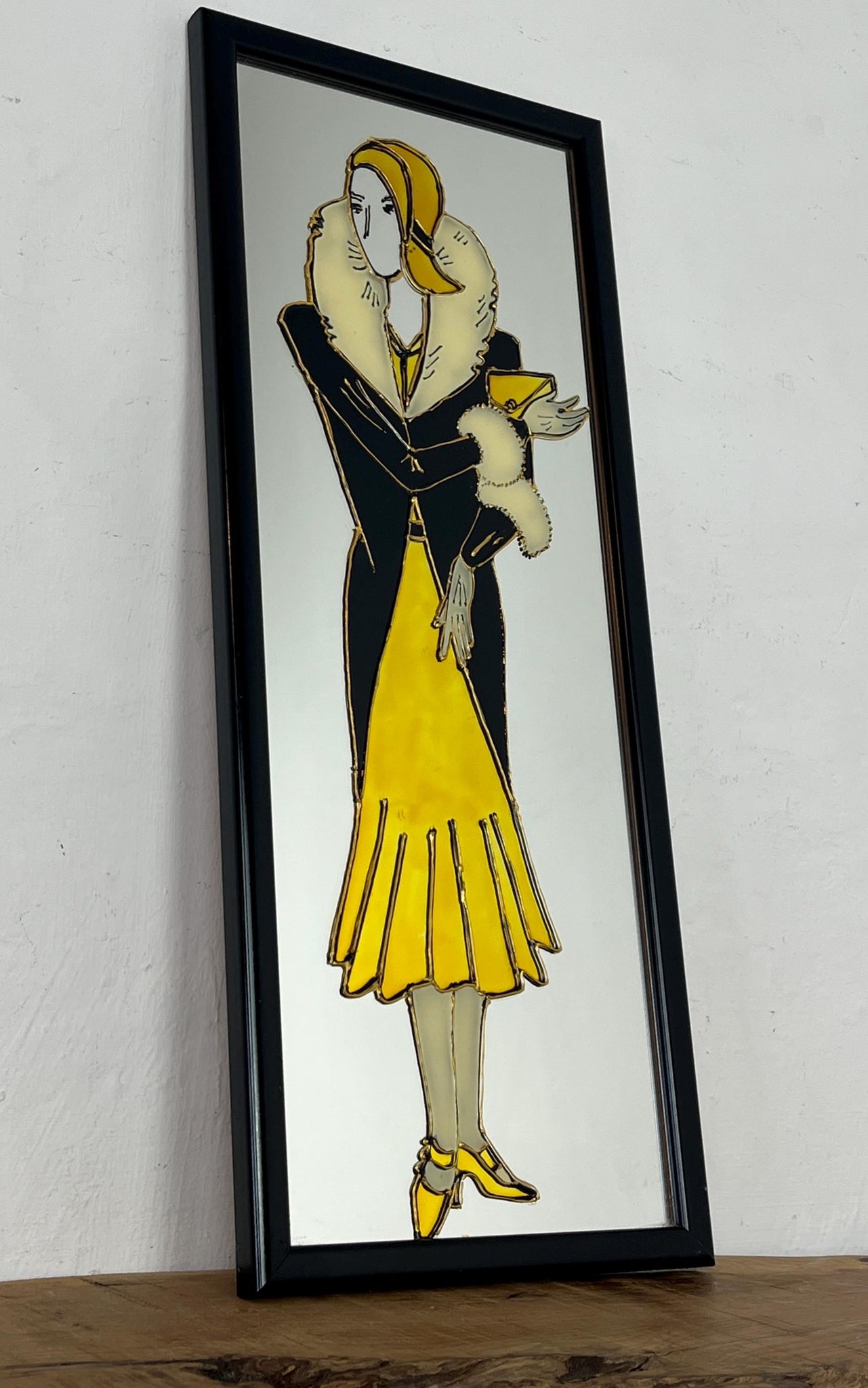 Vintage Art Deco mirror featuring an elegant lady illustration, often referred to as a "Flapper Girl" mirror due to the distinctive 1920s fashion depicted.