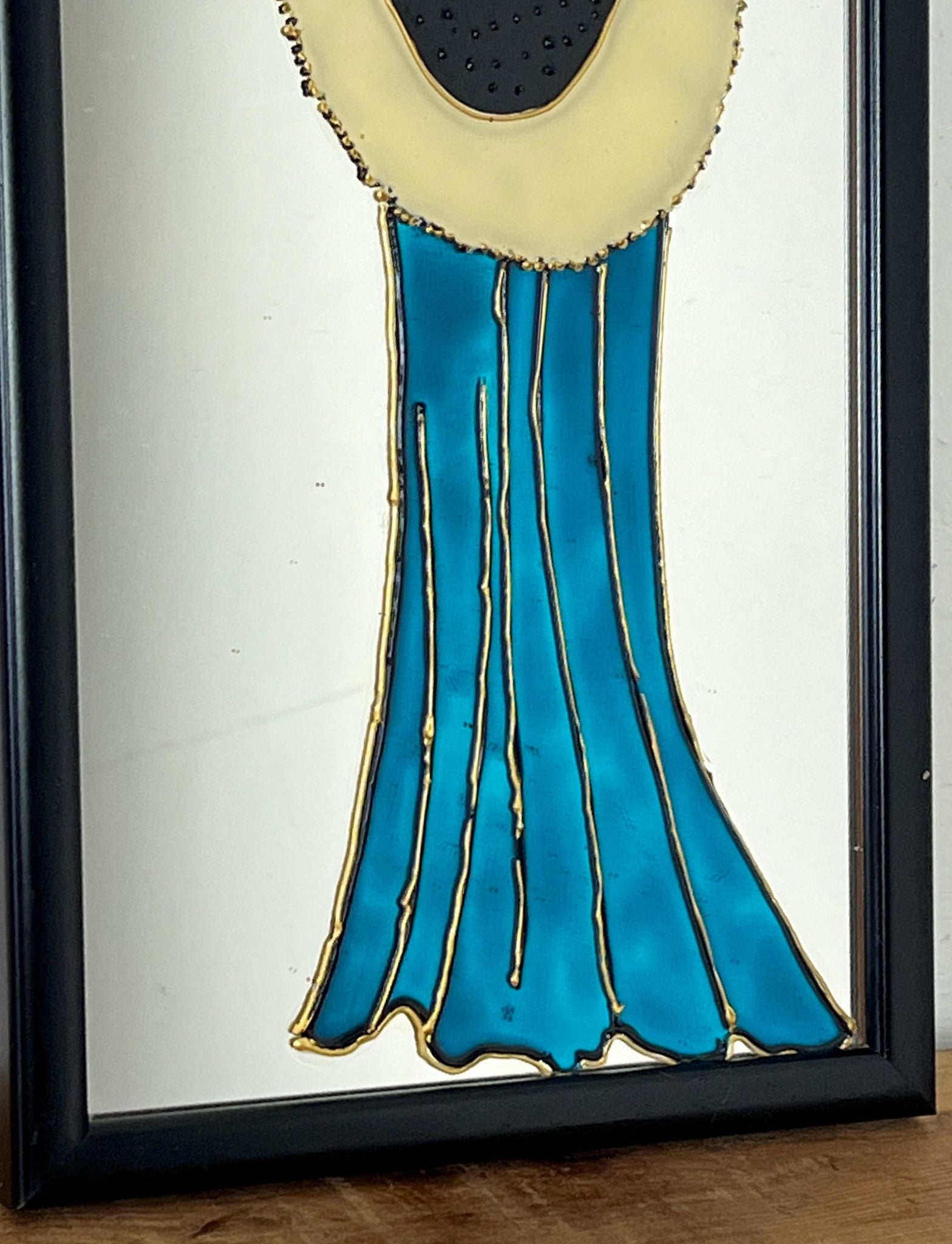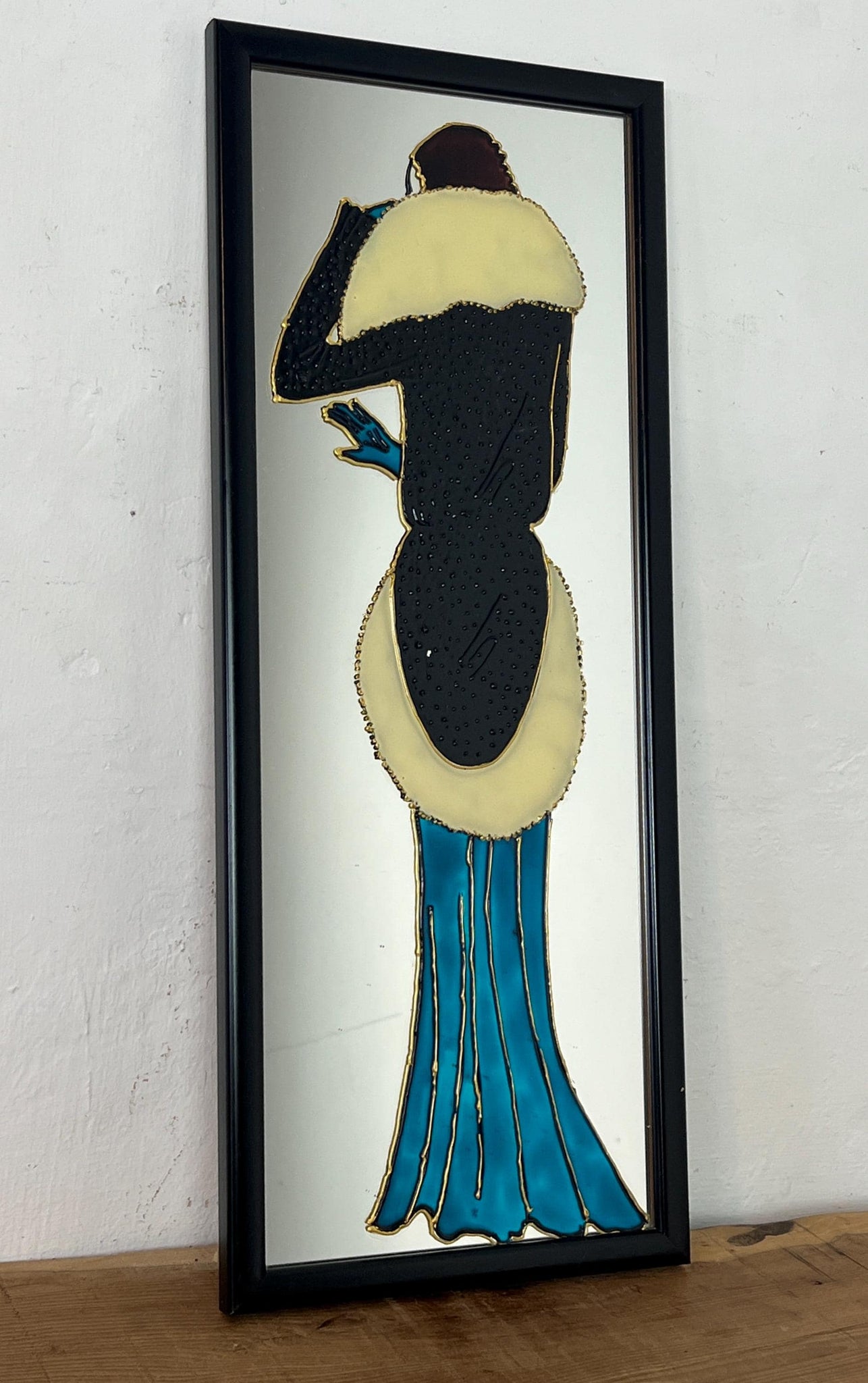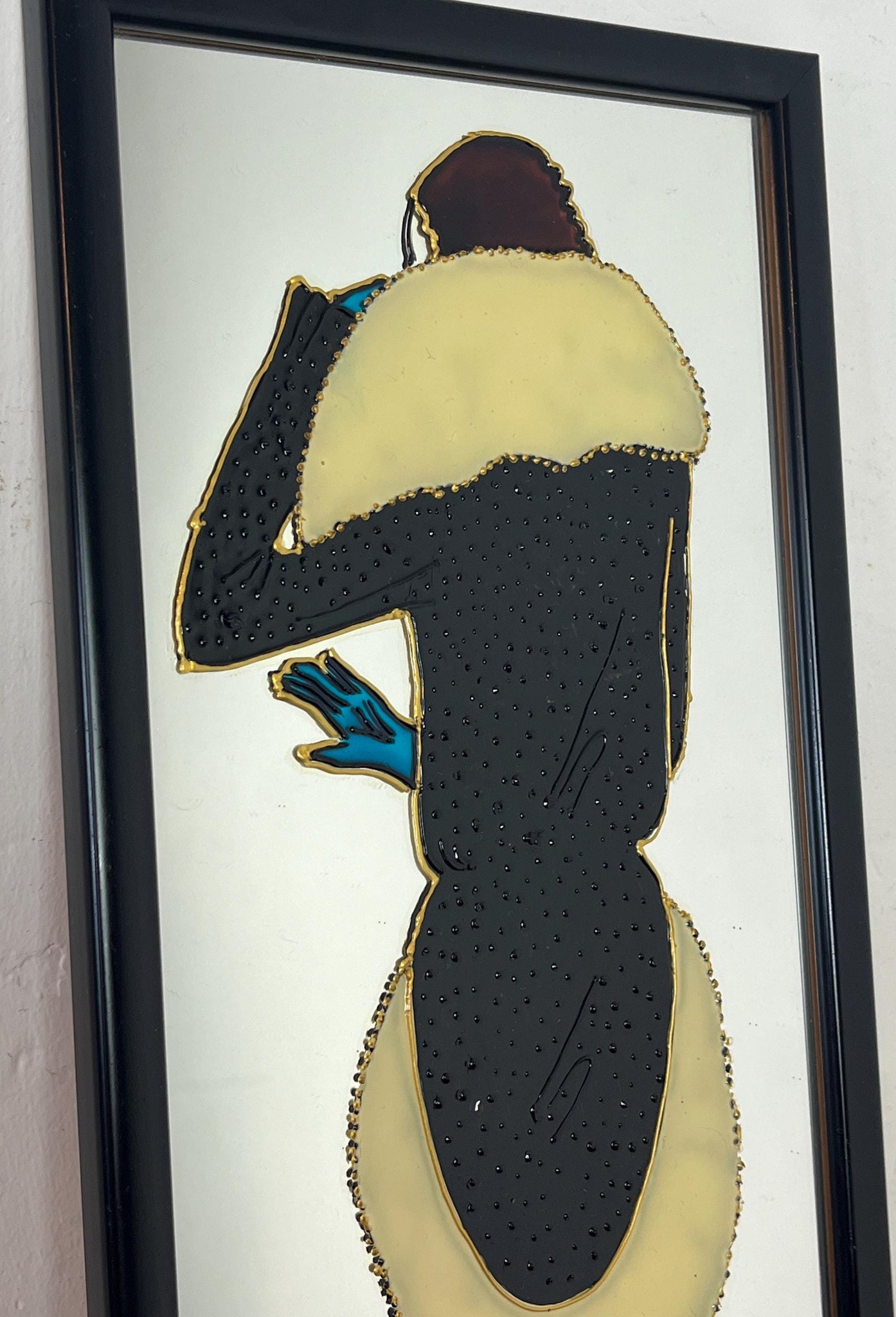 The artwork is further enhanced by the addition of raised, textured elements, outlines of the figure and details of the dress and fur collar. This creates a tactile, three-dimensional quality to the piece, contrasting with the smooth mirrored surface.