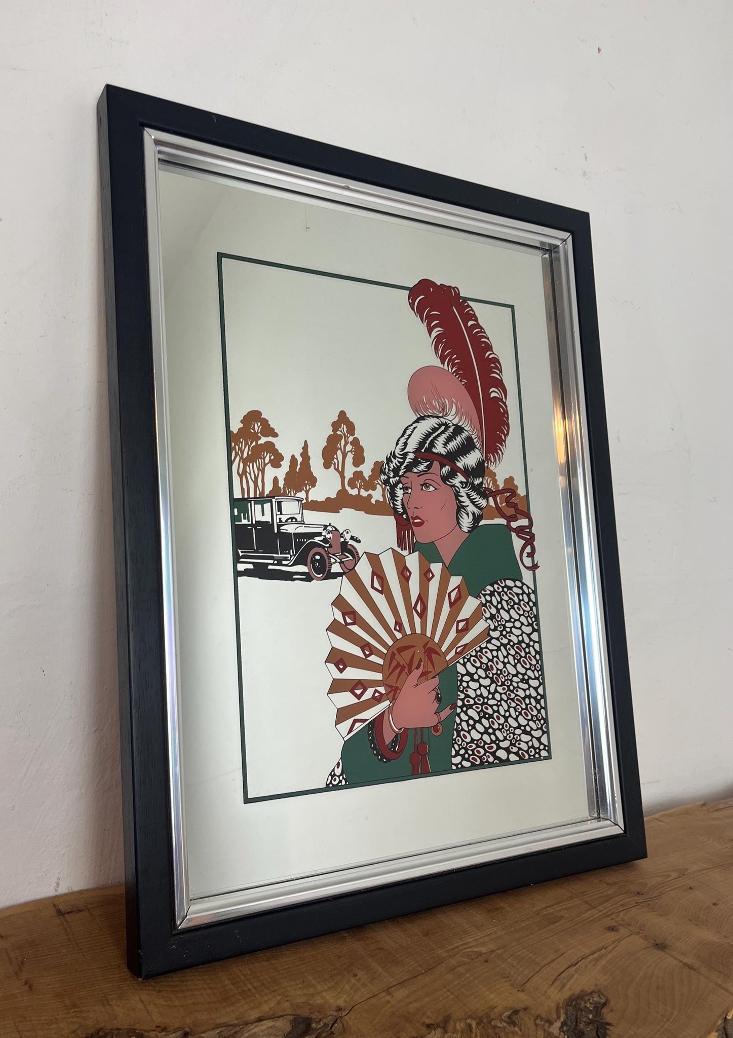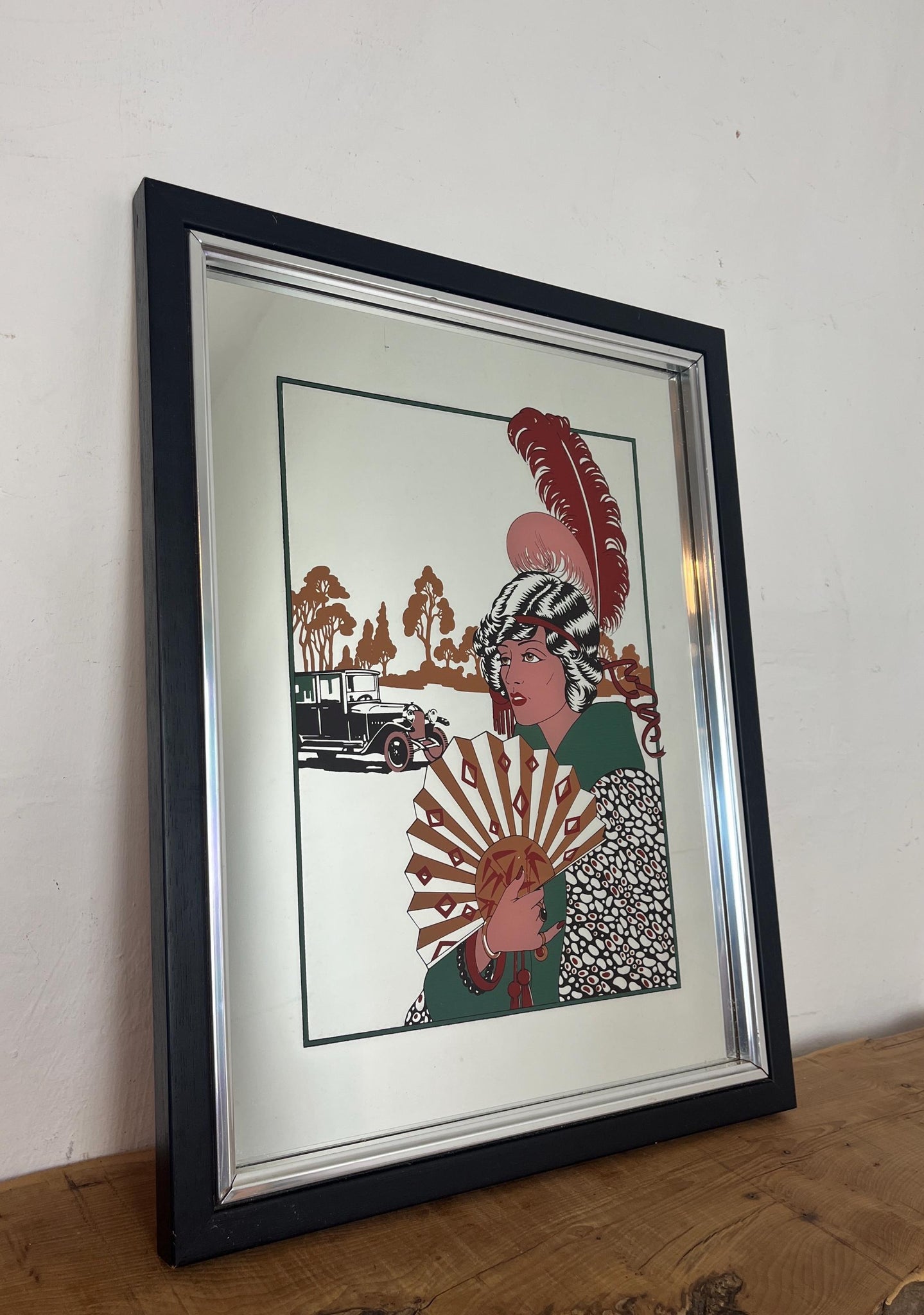 The artwork mirror is titled "Au Revoir" and it is a famous Art Deco fashion illustration by the French artist George Barbier.