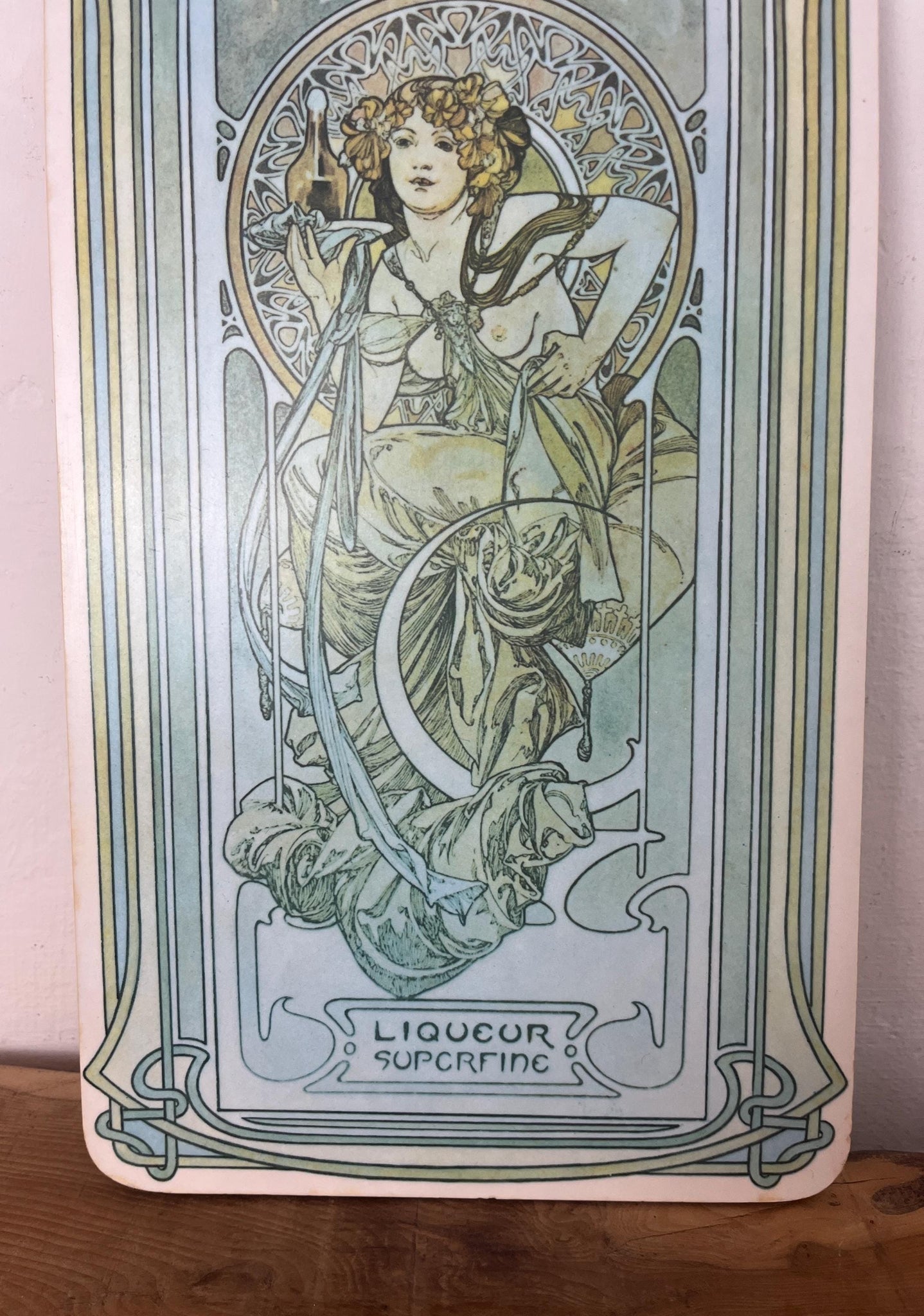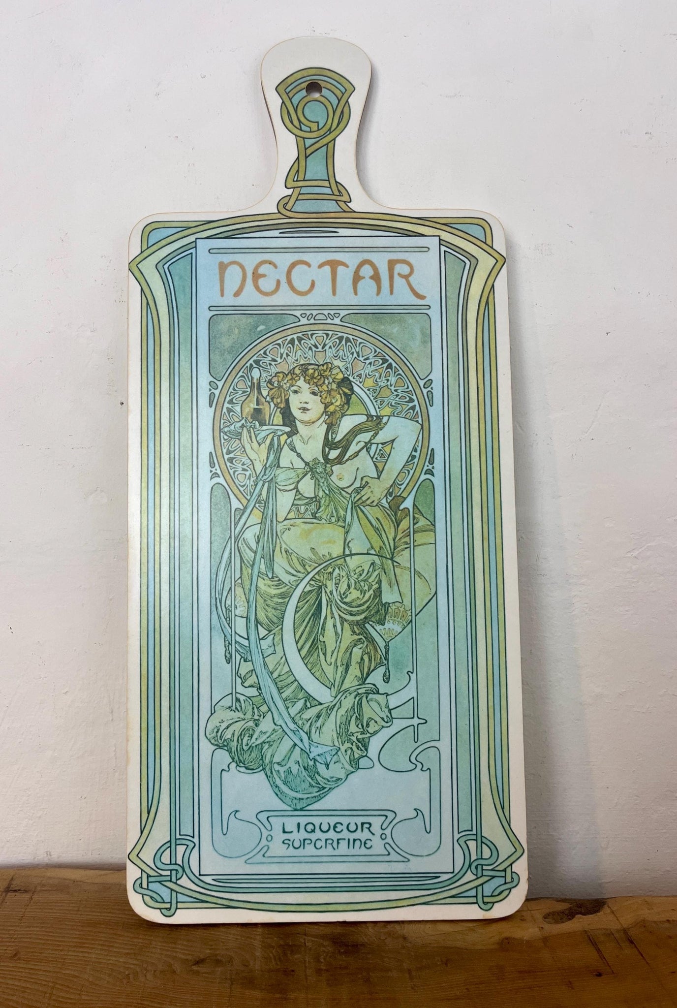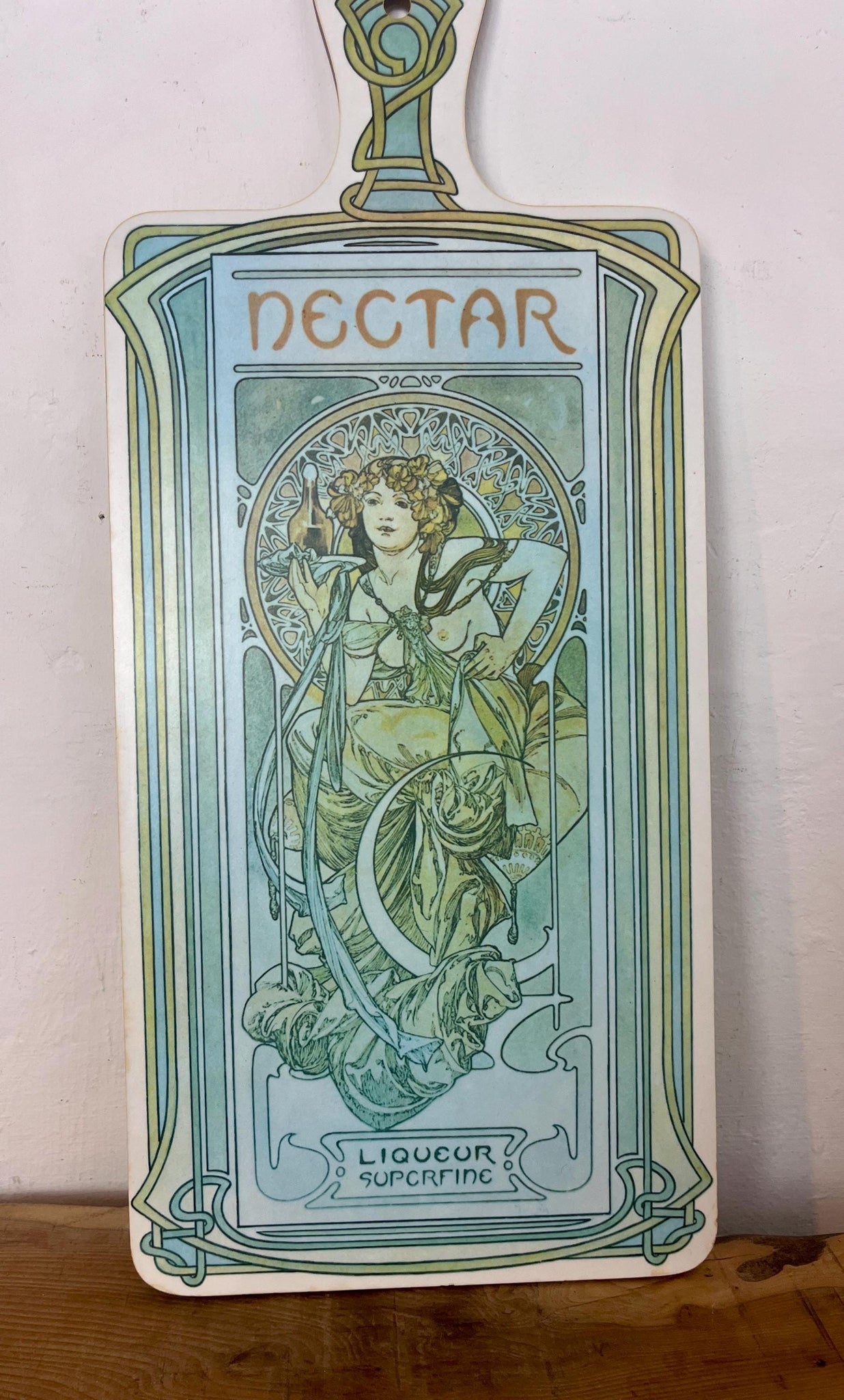 Beautiful vintage decorative cutting board featuring Alphonse Mucha's Art Nouveau design for "Nectar, Liqueur Superfine".