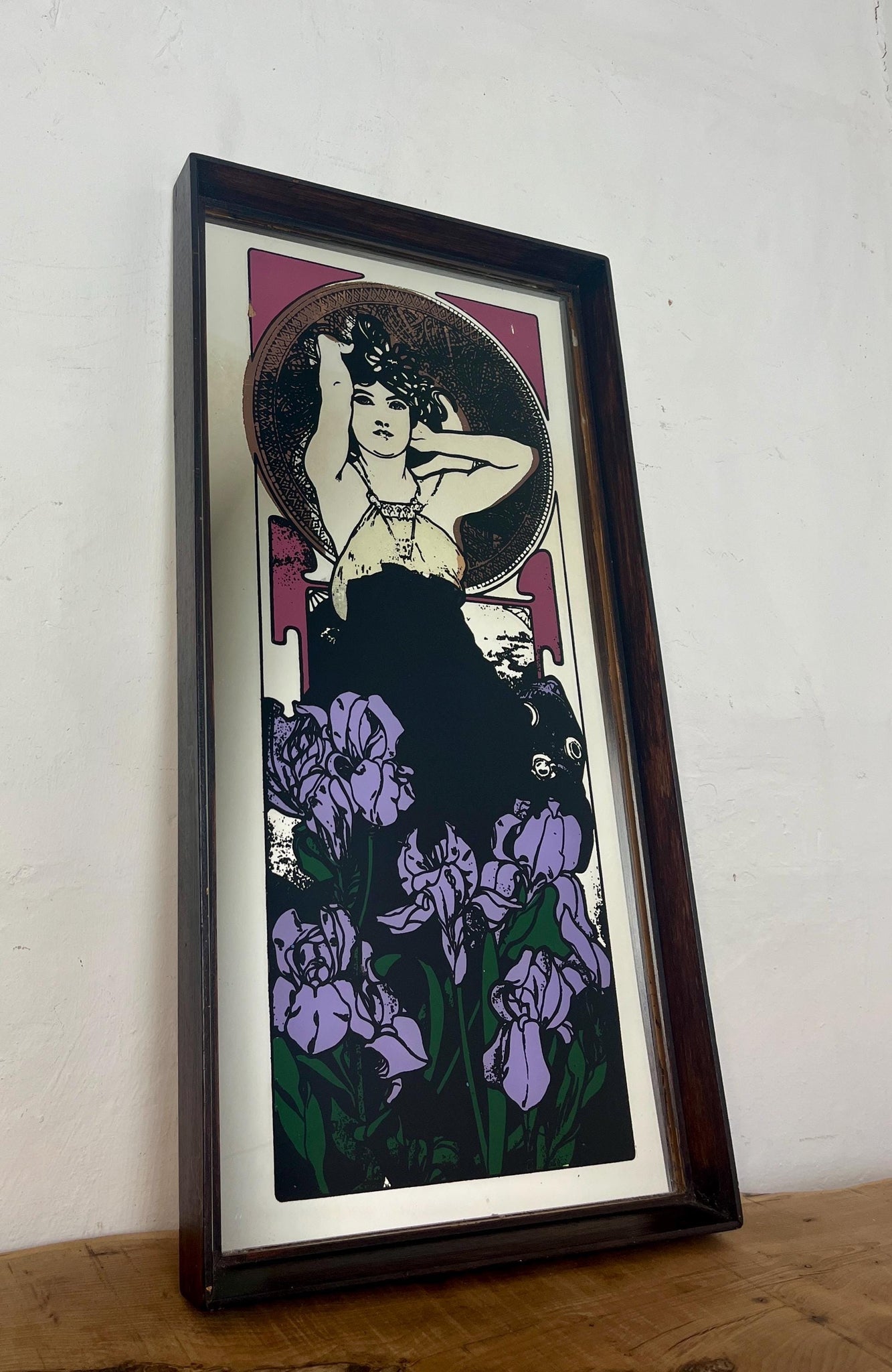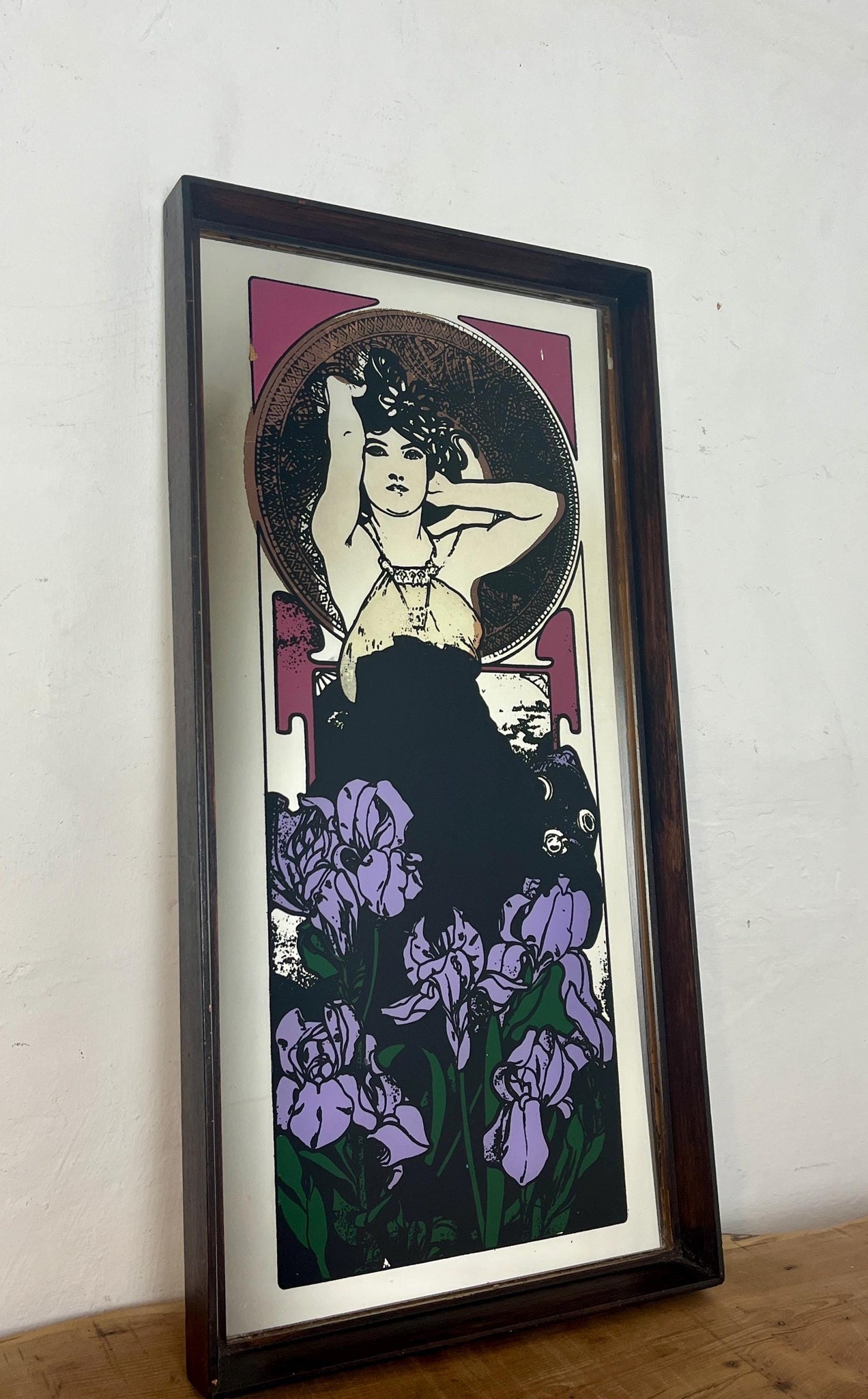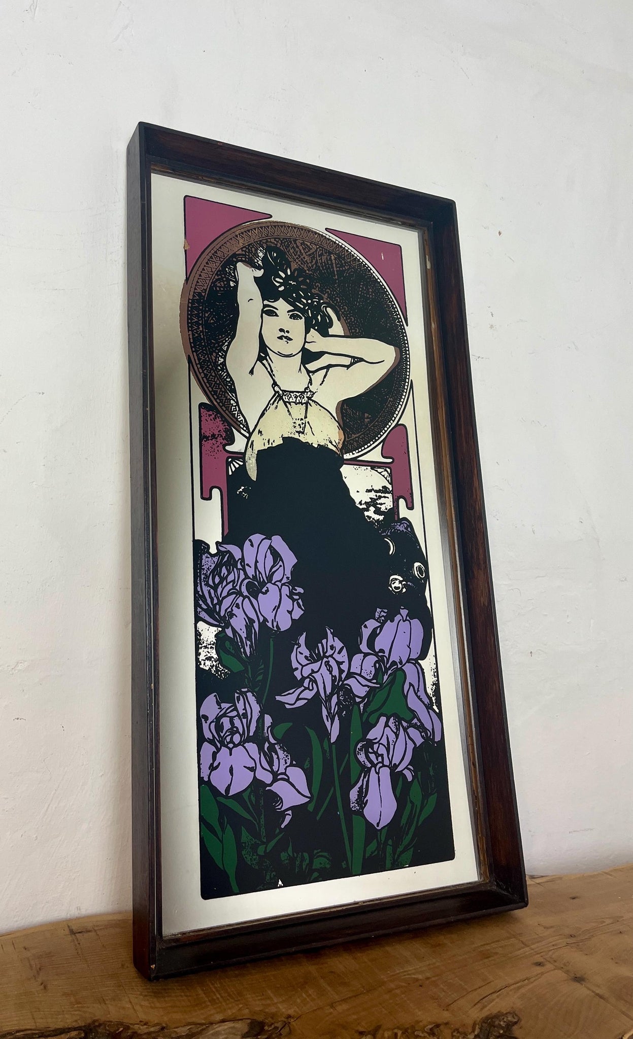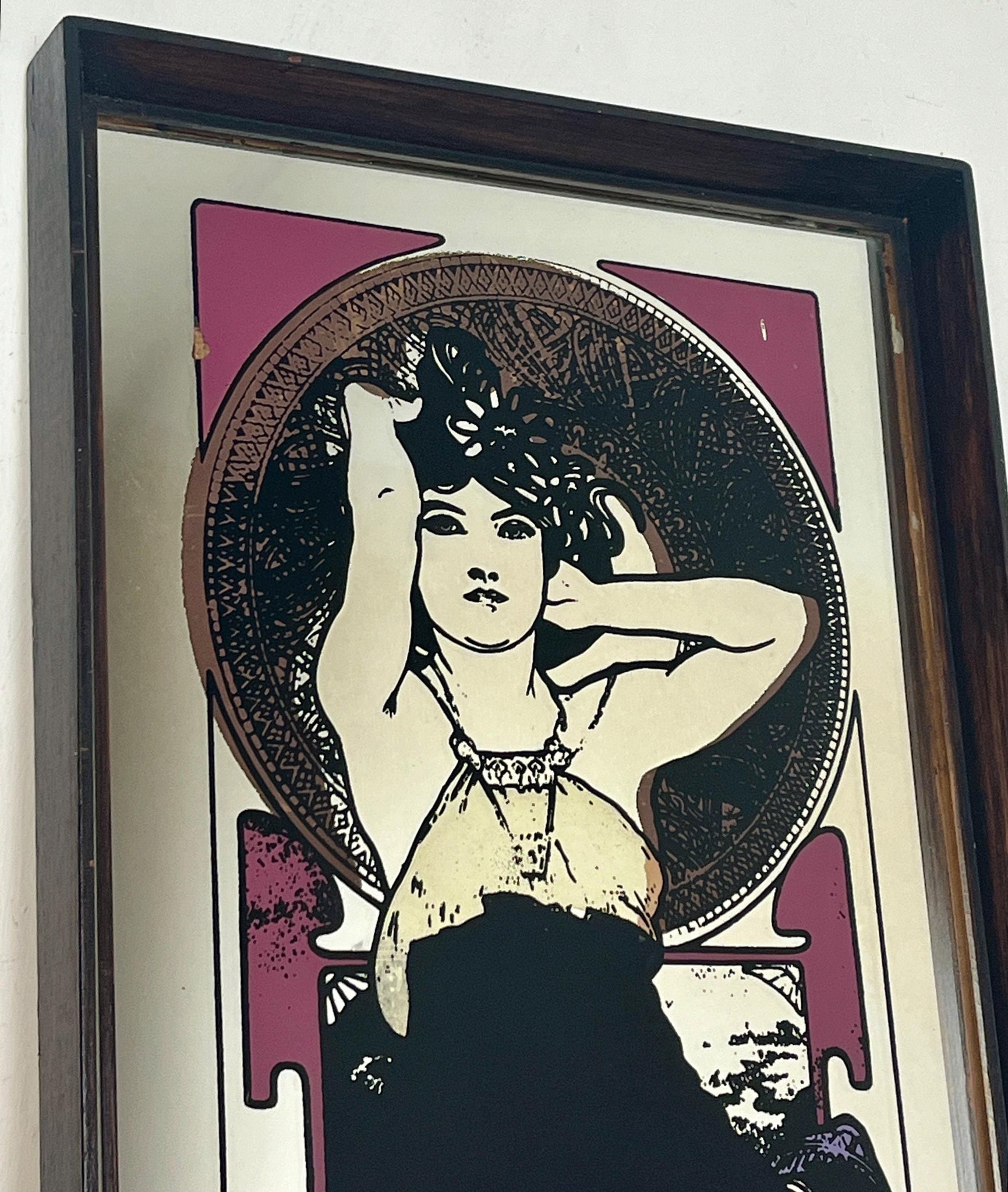 Beautiful vintage-framed mirror featuring an Art Nouveau illustration of a woman by the Czech artist Alphonse Mucha.