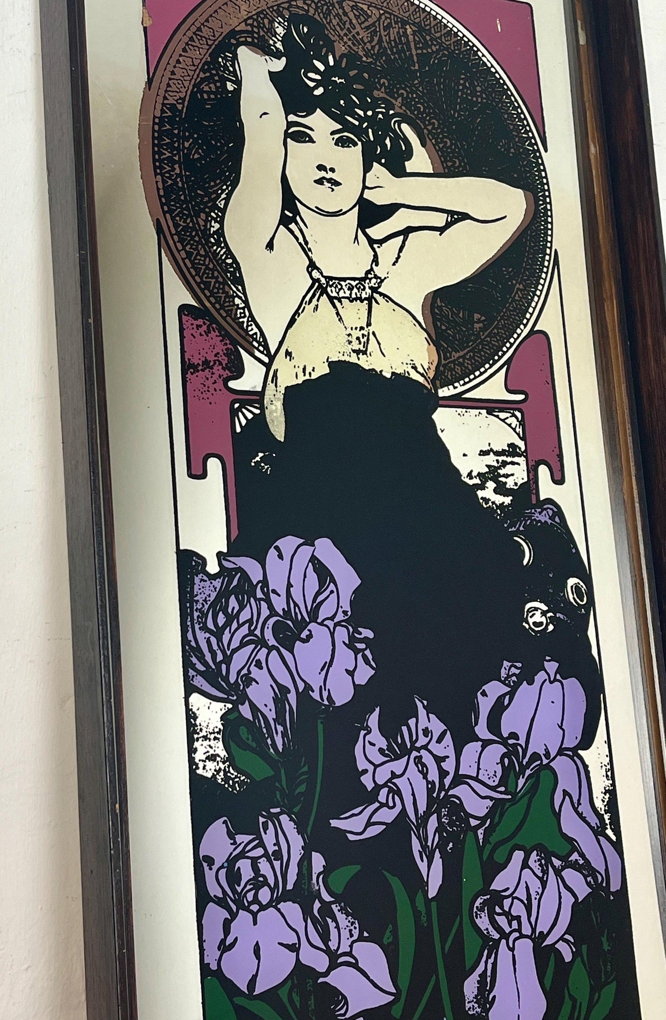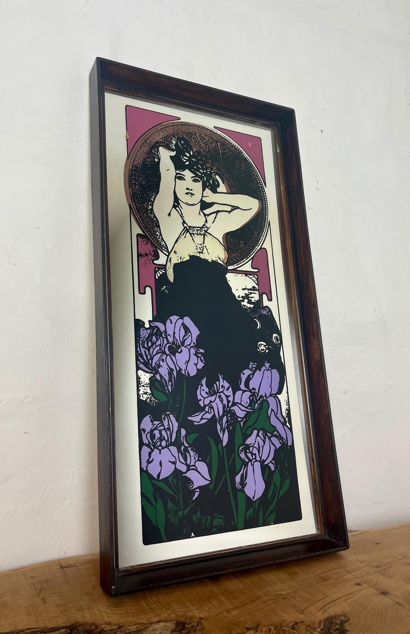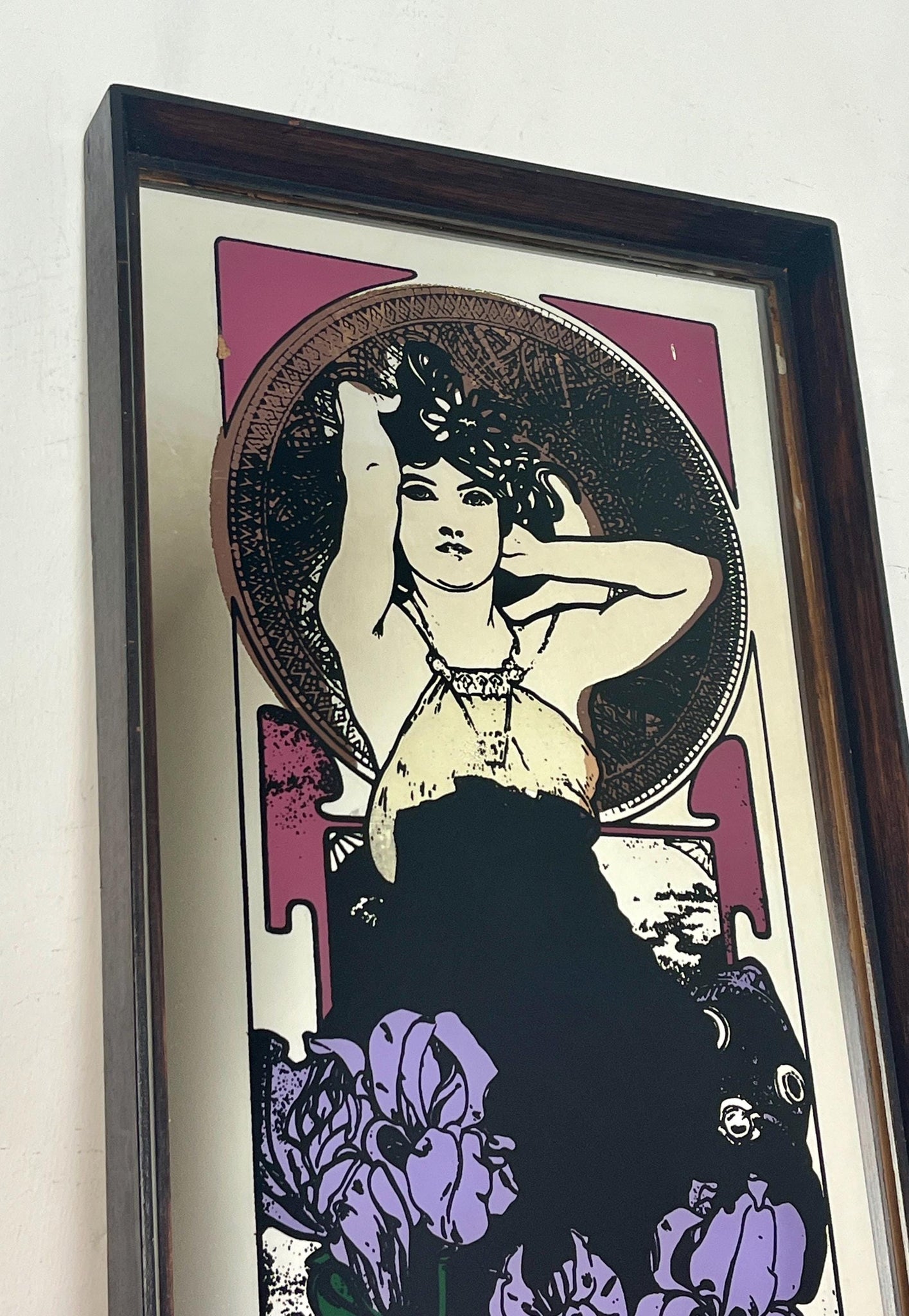 Beautiful vintage-framed mirror featuring an Art Nouveau illustration of a woman by the Czech artist Alphonse Mucha.