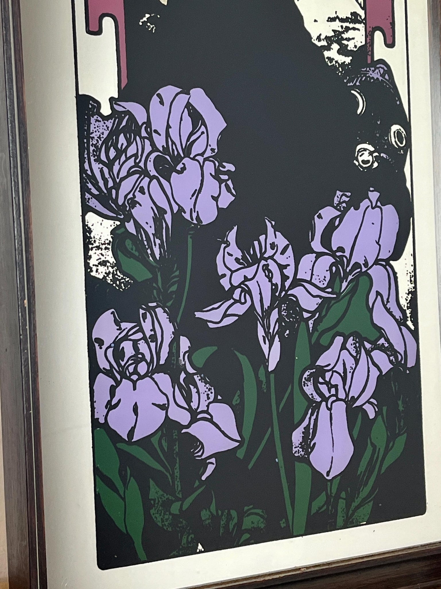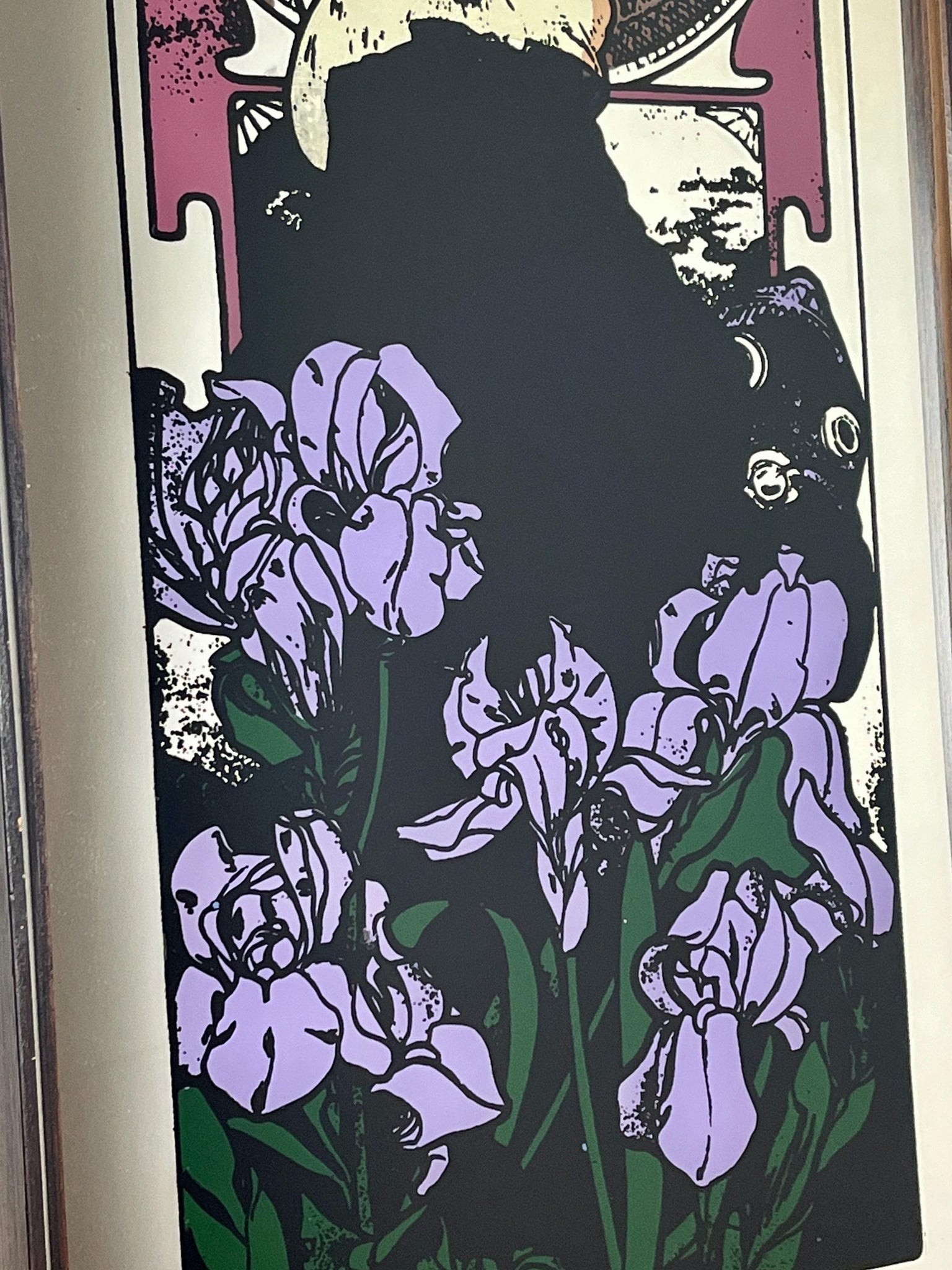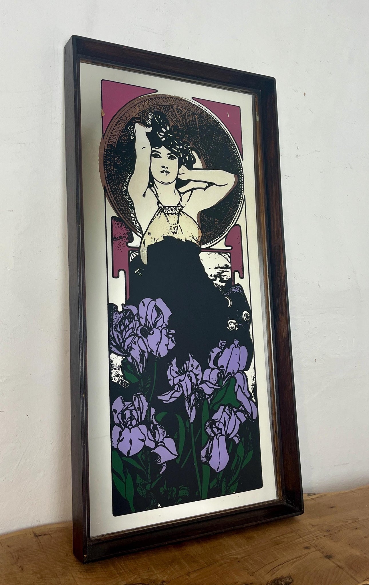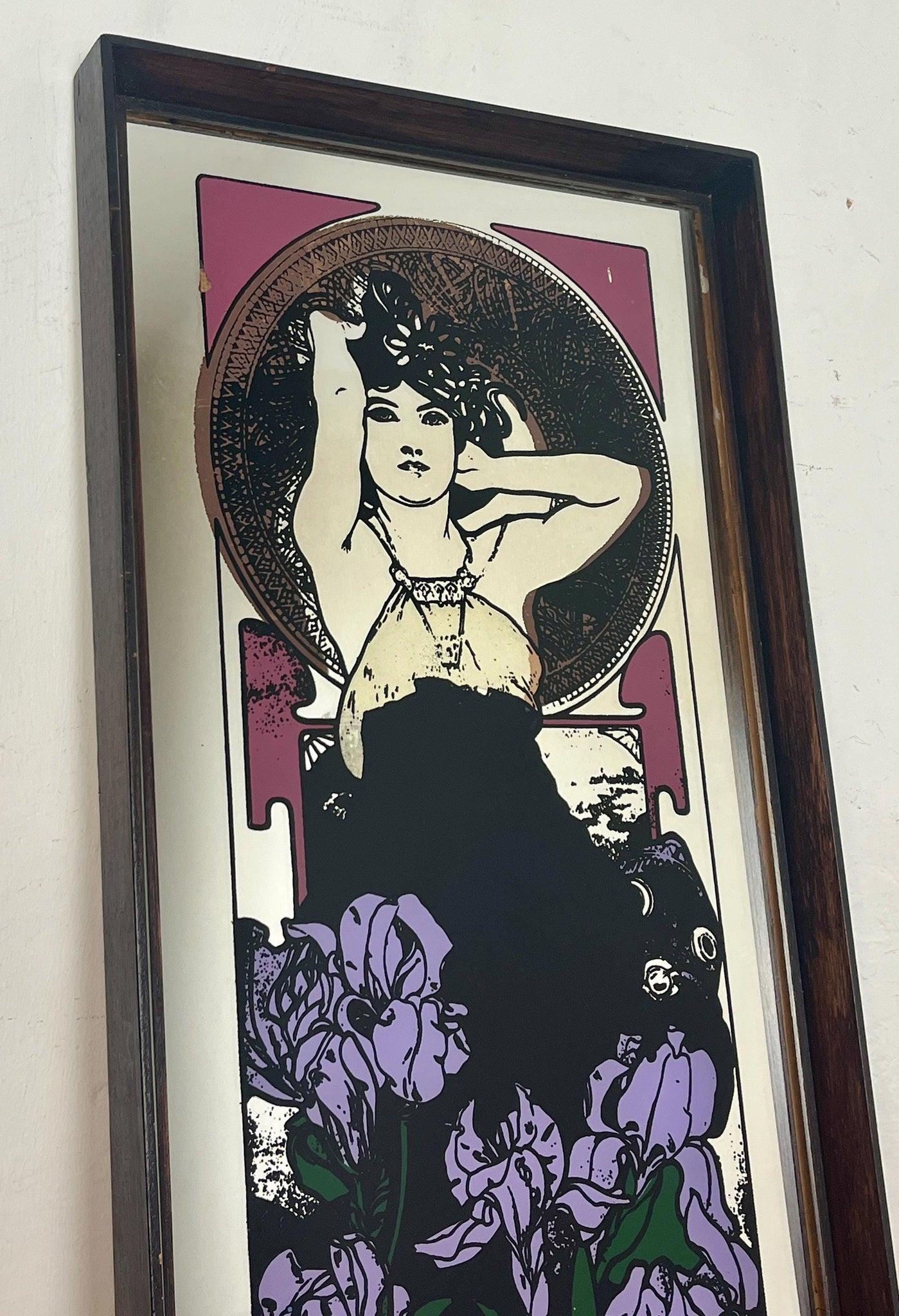 Beautiful vintage-framed mirror featuring an Art Nouveau illustration of a woman by the Czech artist Alphonse Mucha.