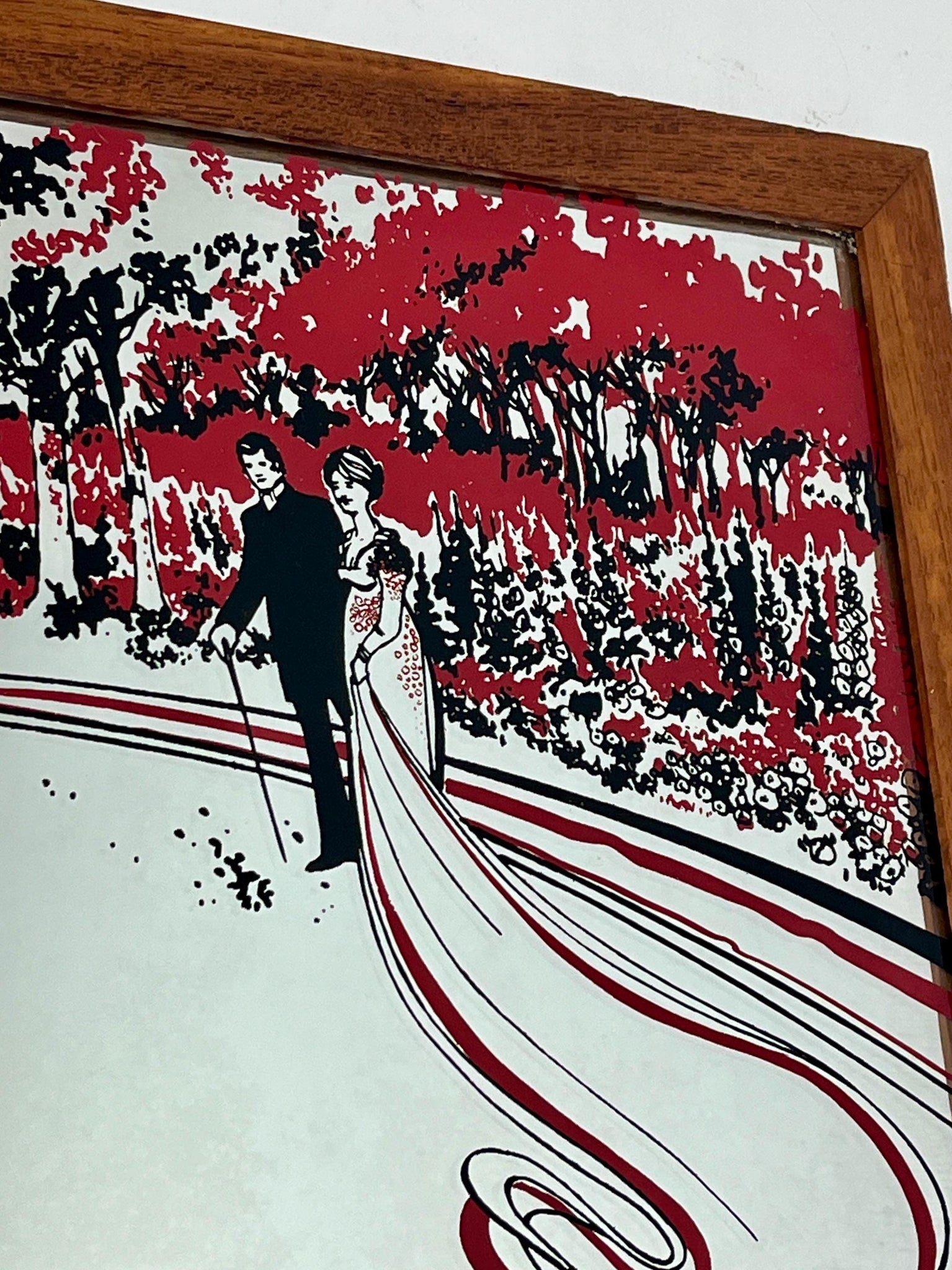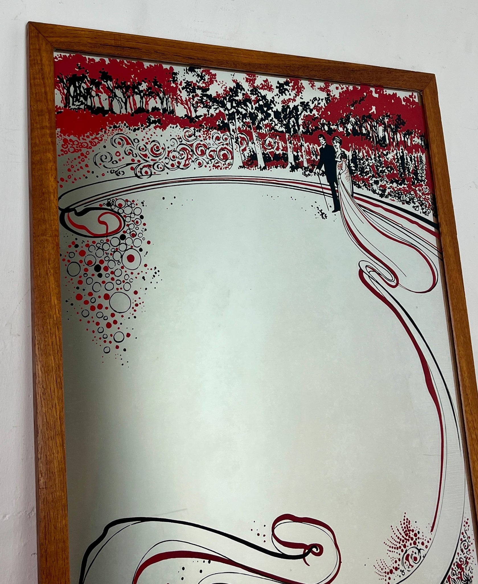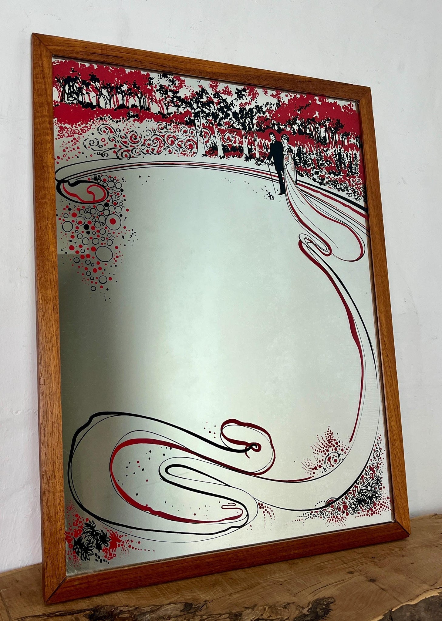 This beautiful piece shows a decorative Art Nouveau mirror featuring an illustration of a married couple under stylised trees with red and black accents, in a sleek wooden frame.