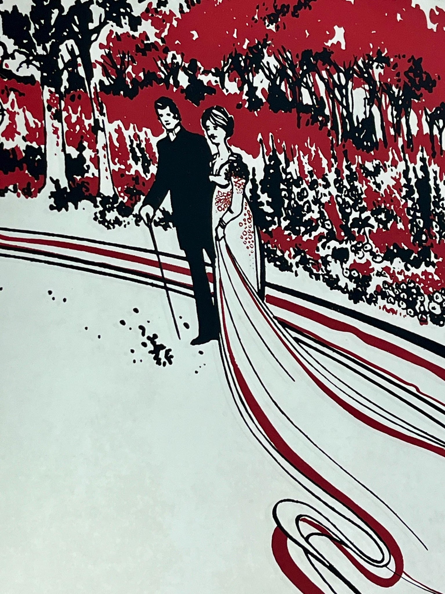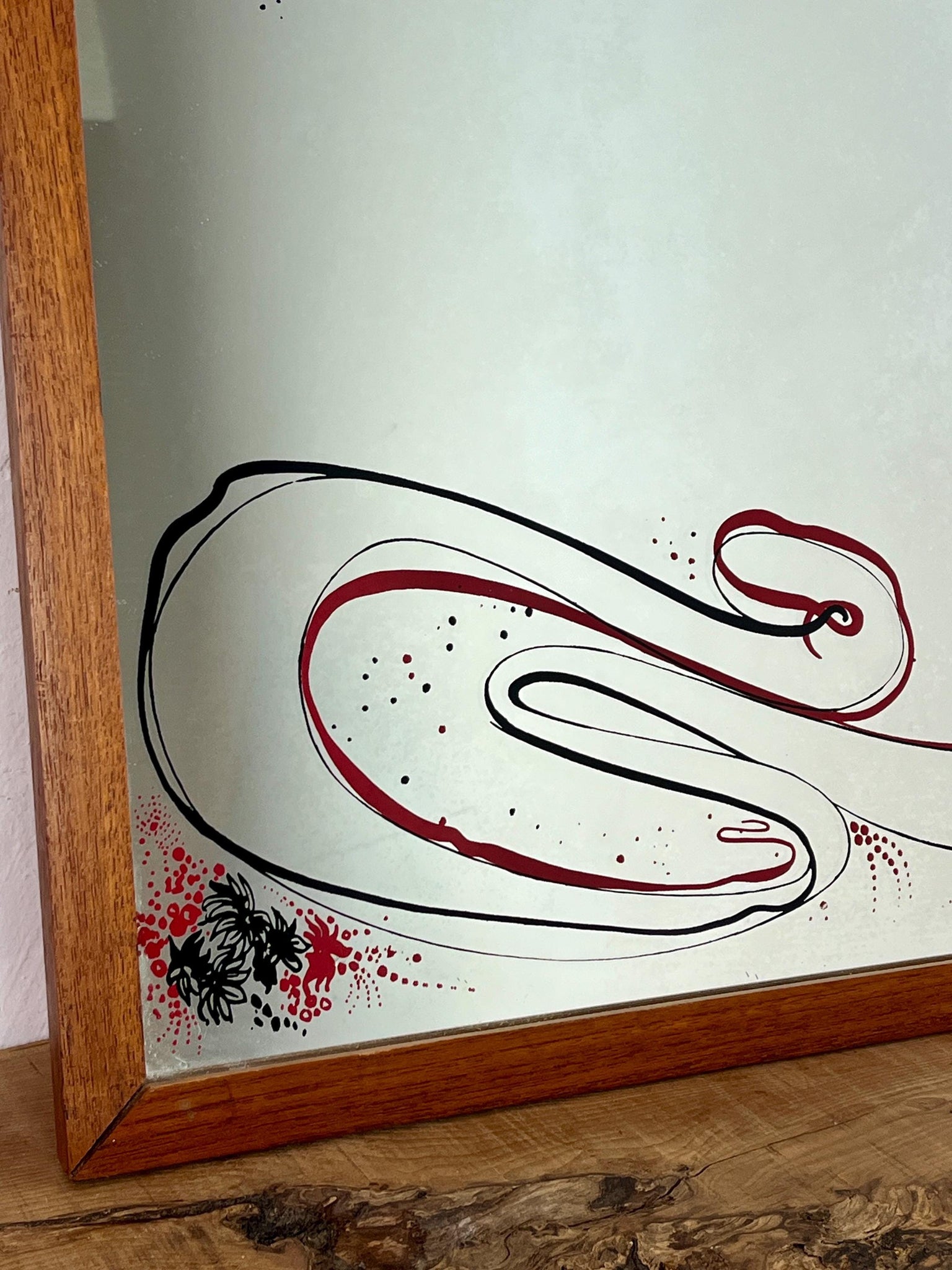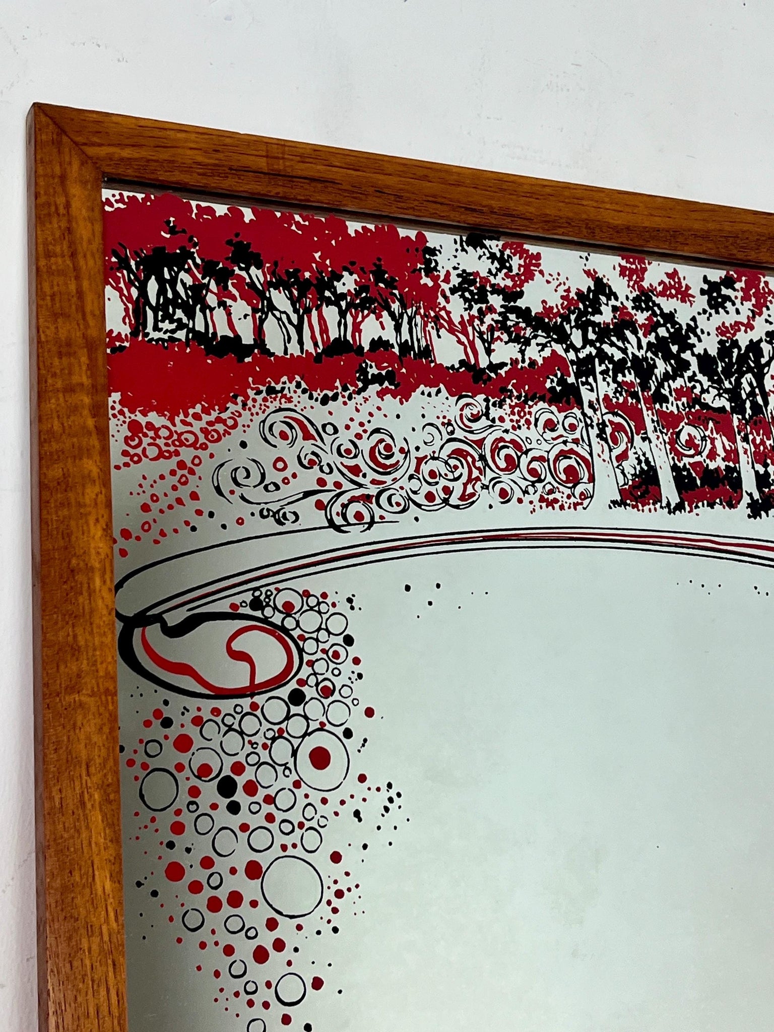 This beautiful piece shows a decorative Art Nouveau mirror featuring an illustration of a married couple under stylised trees with red and black accents, in a sleek wooden frame.