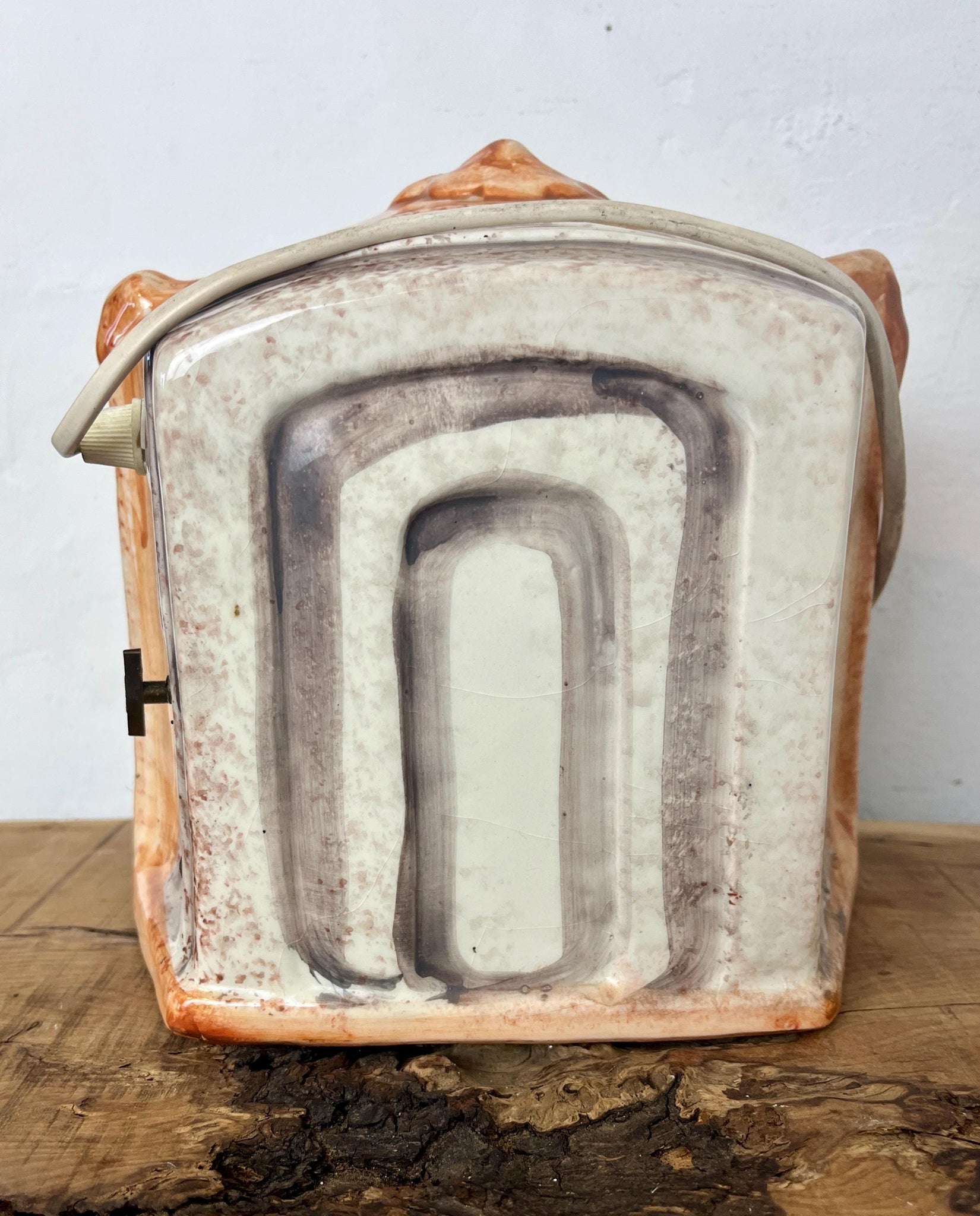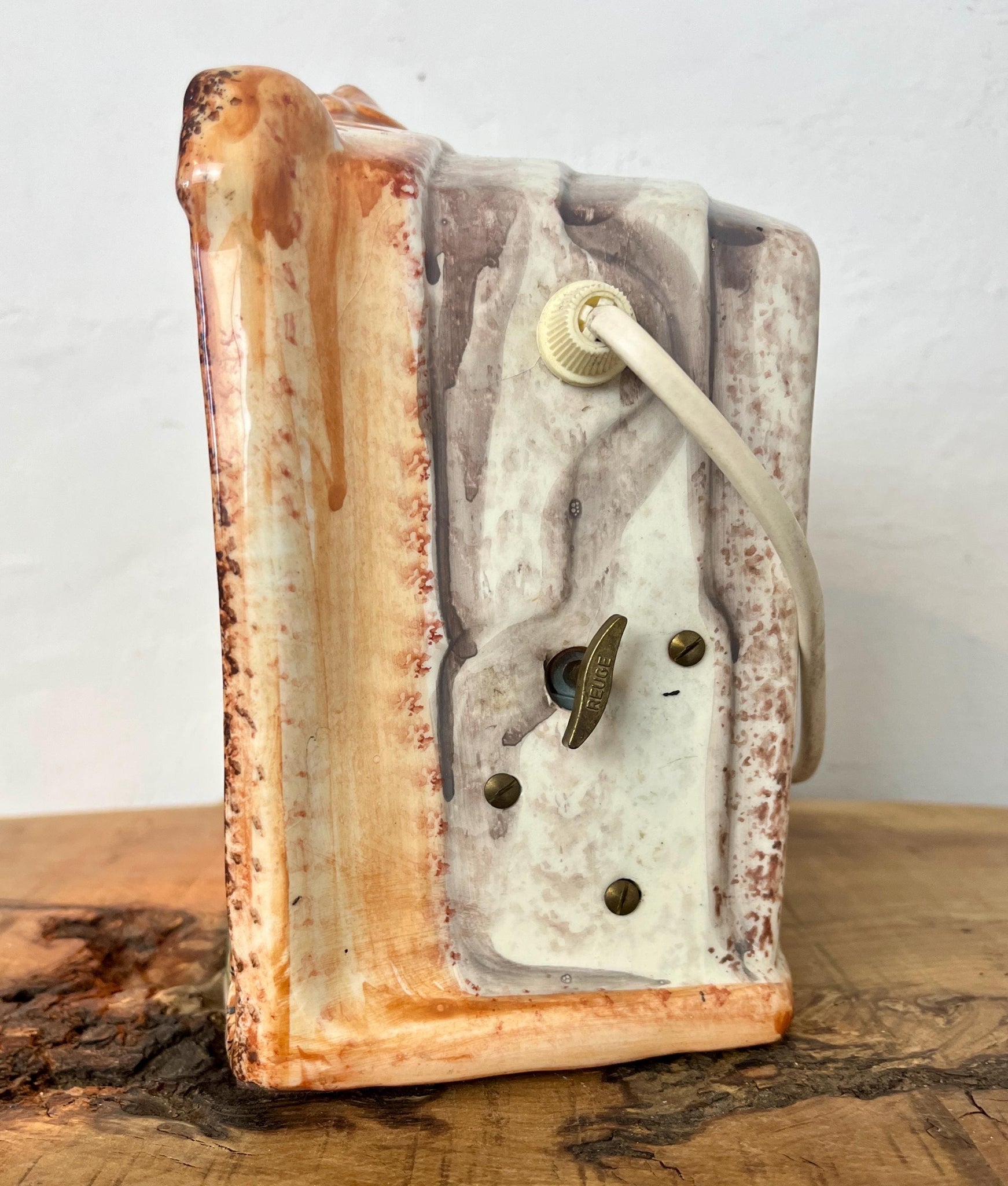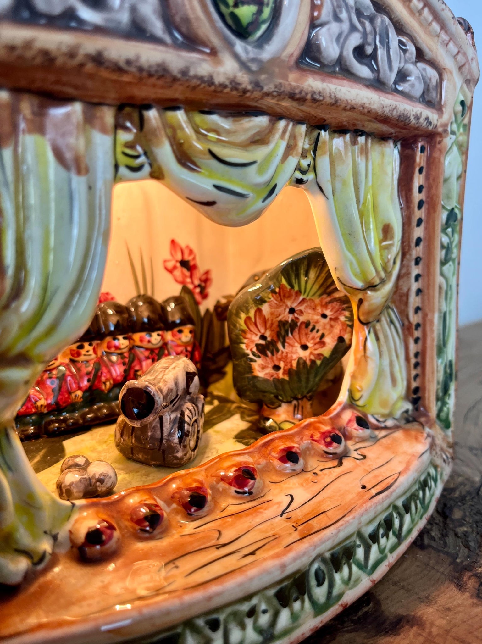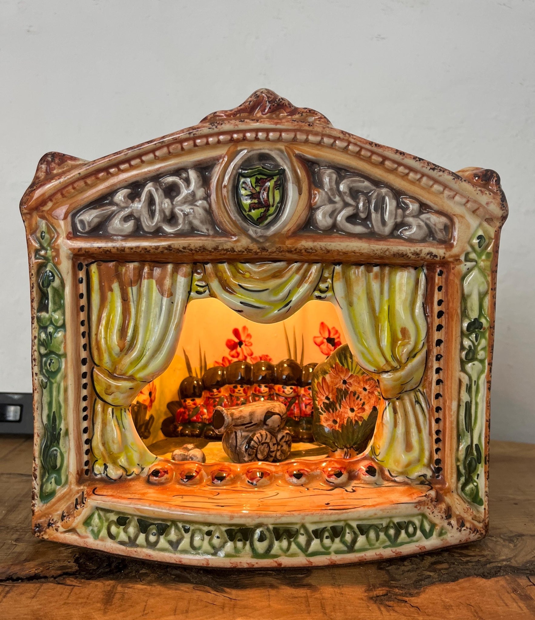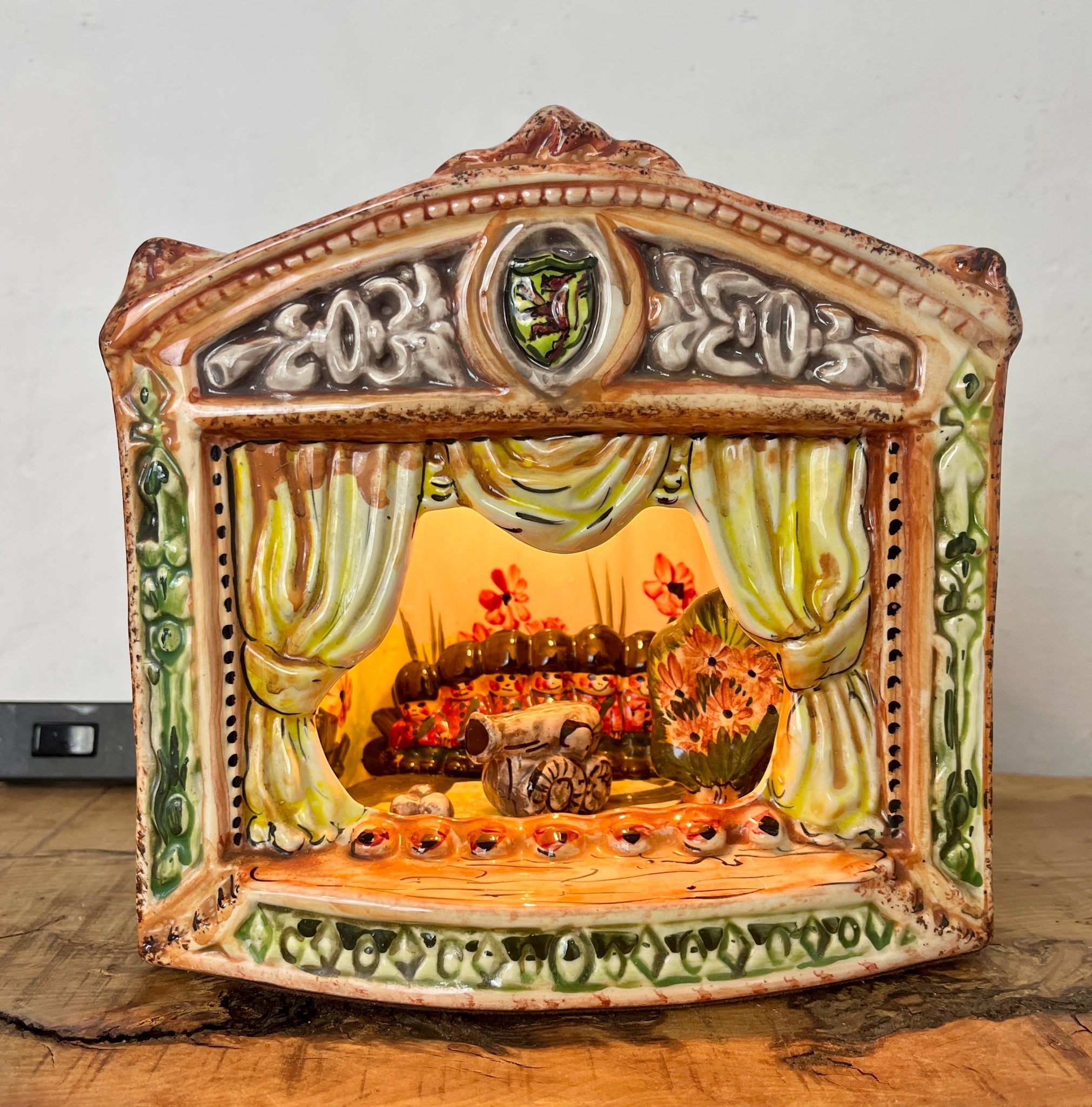Stunning vintage ceramic night light or table lamp designed as a miniature theatre stage diorama.