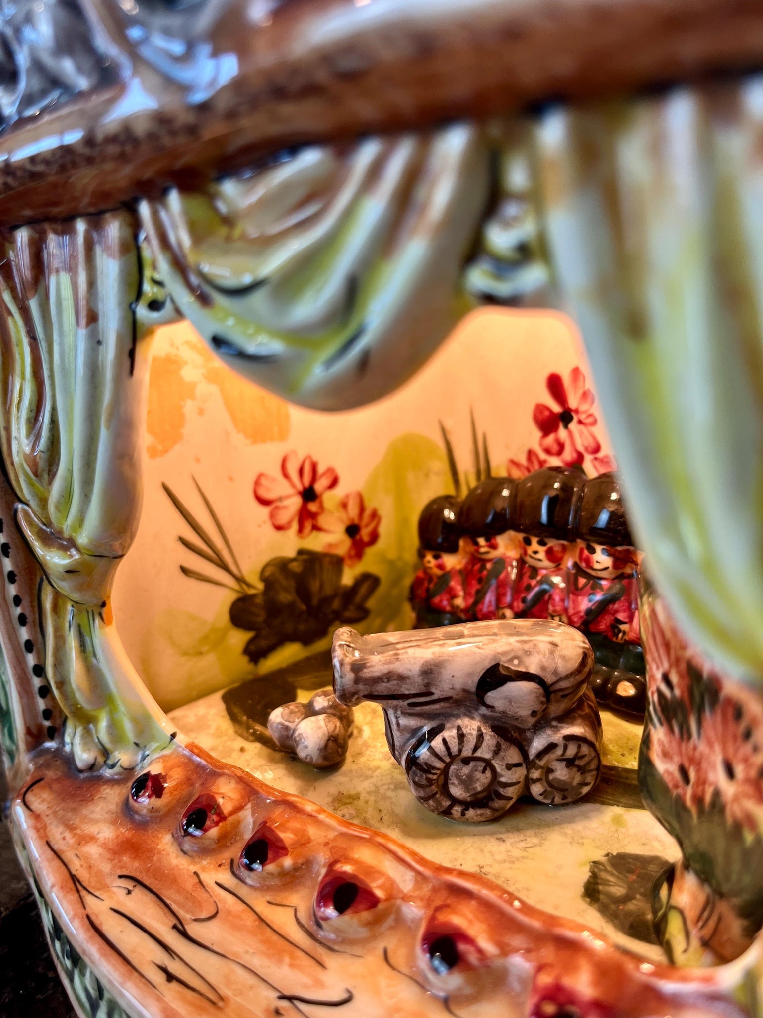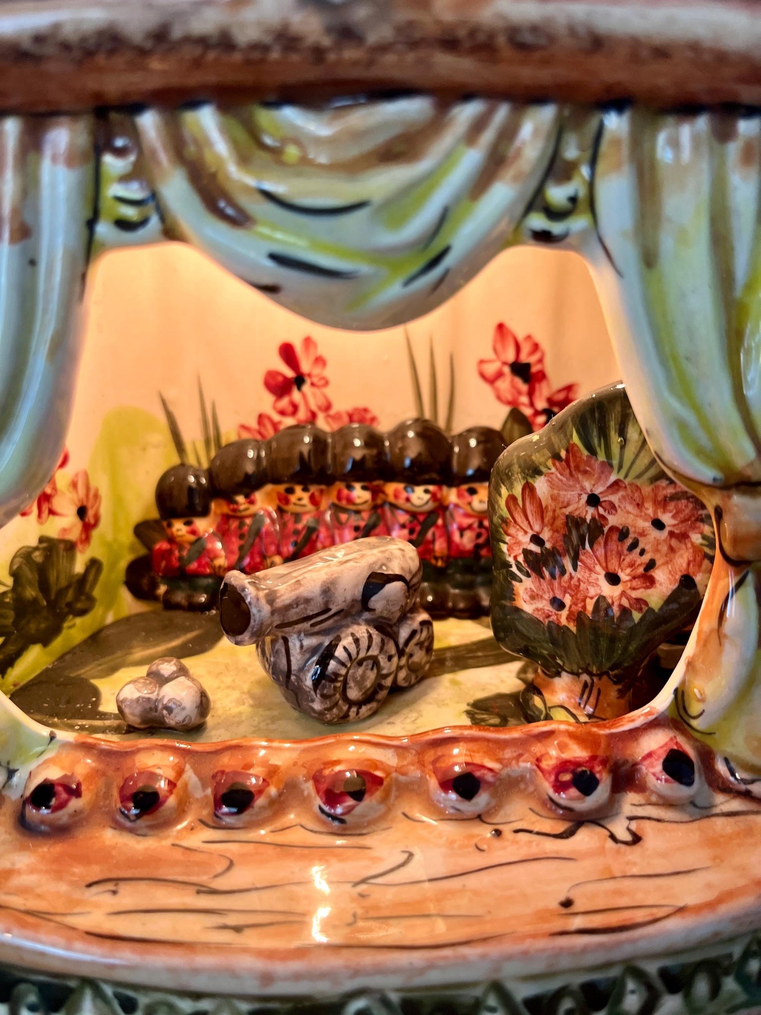 This style of hand-painted, glazed ceramic item, sometimes featuring floral designs or specific scenes, has a whimsical, hand-painted design with a military theme, incorporating several small seated toy figures and a cannon figurine.