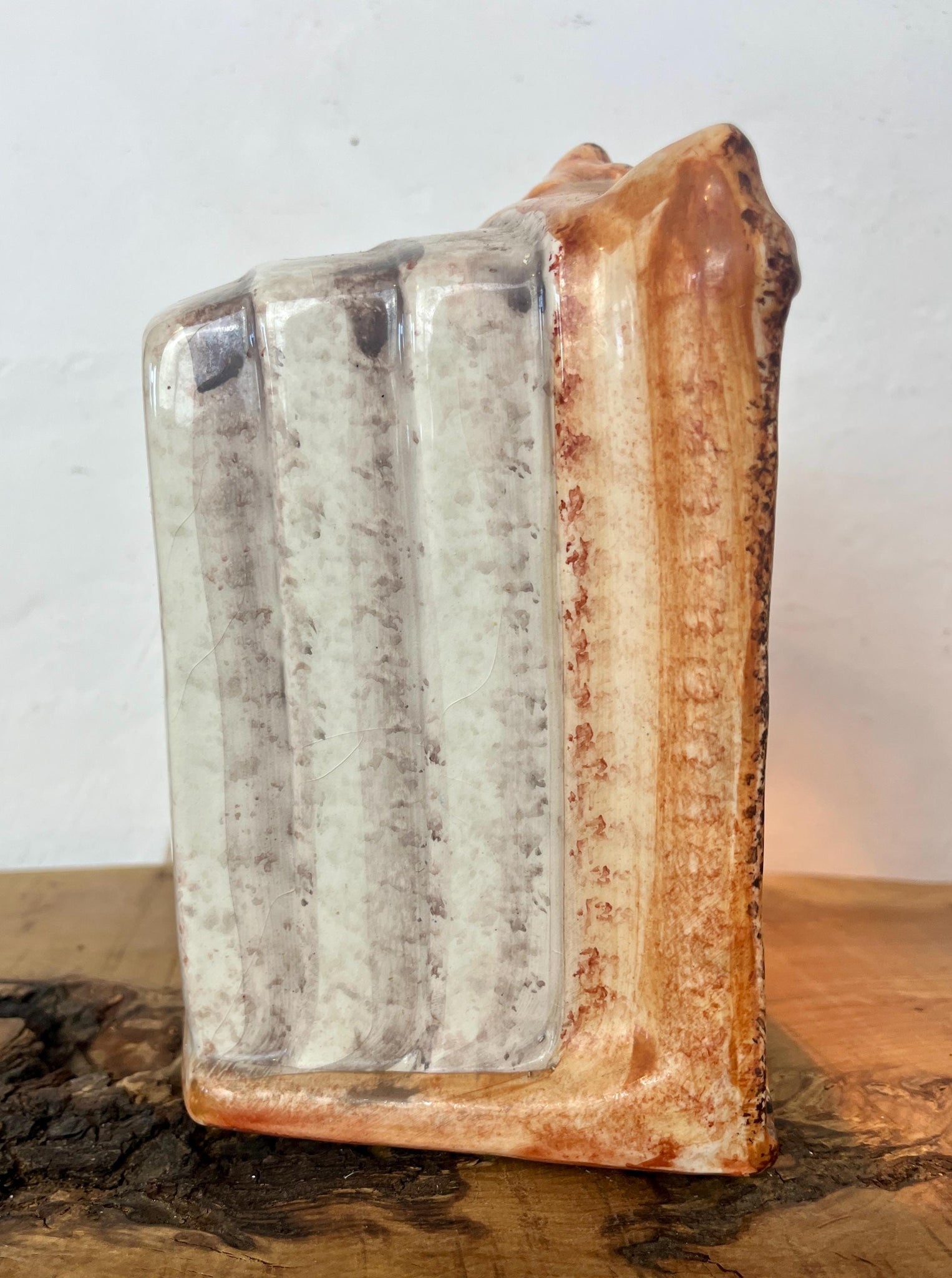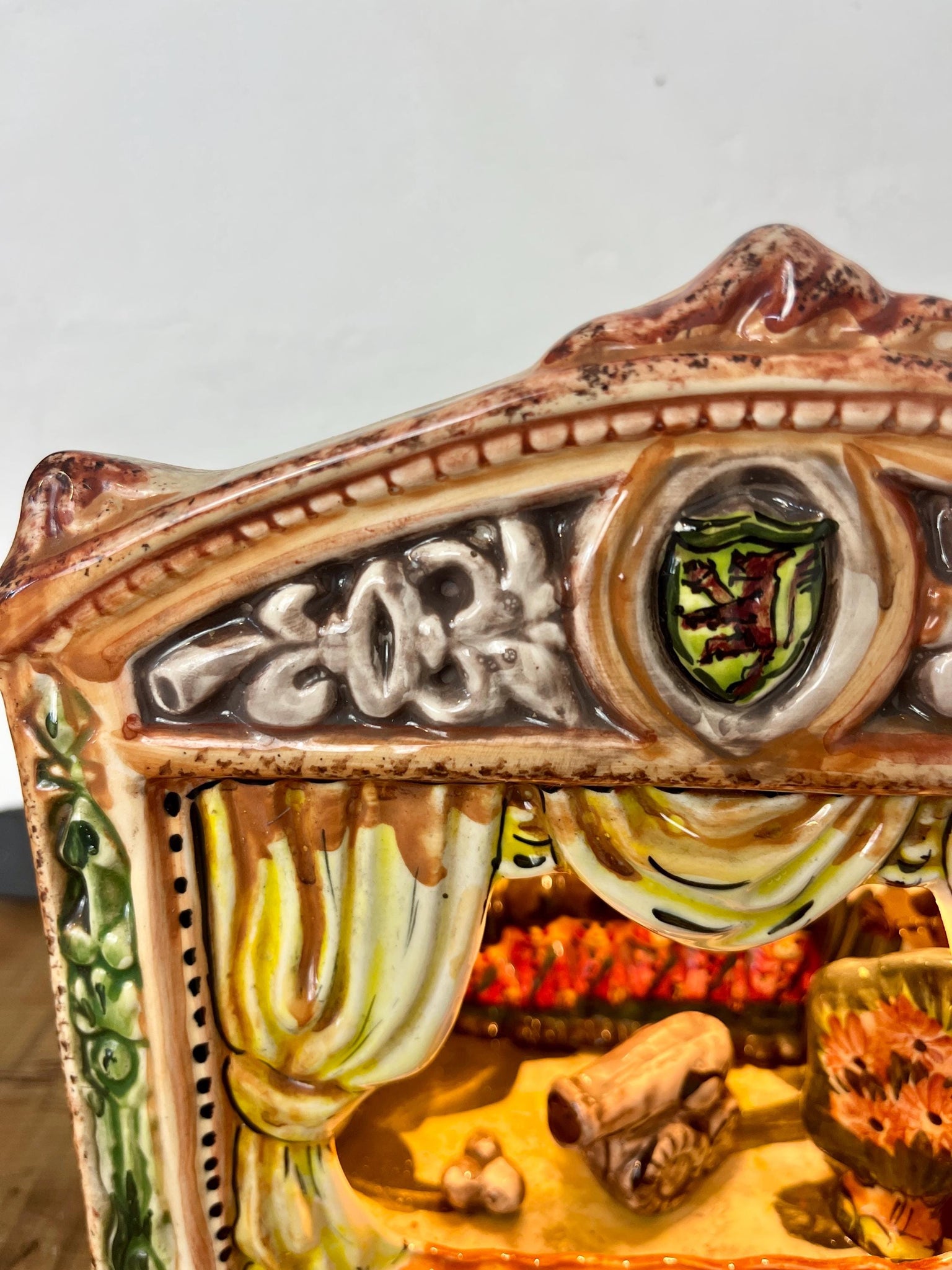 The piece is a freestanding ceramic structure designed to resemble a theatre stage, complete with painted, draped yellow curtains, green decorative side columns, and a base.