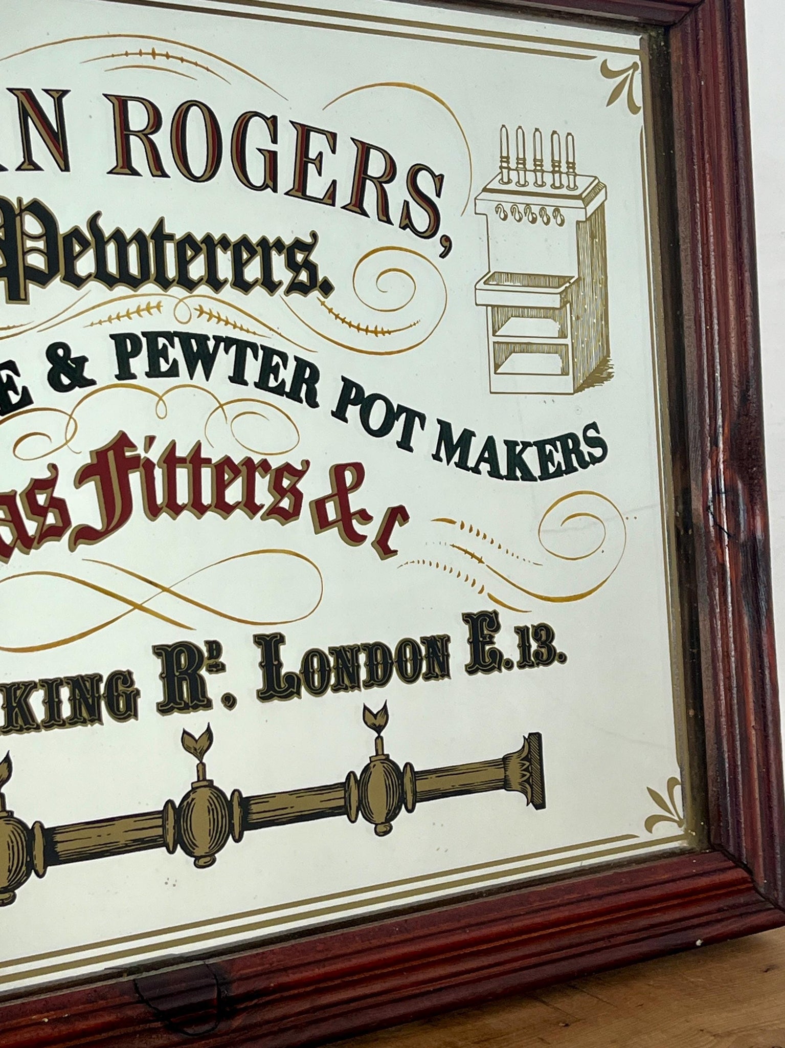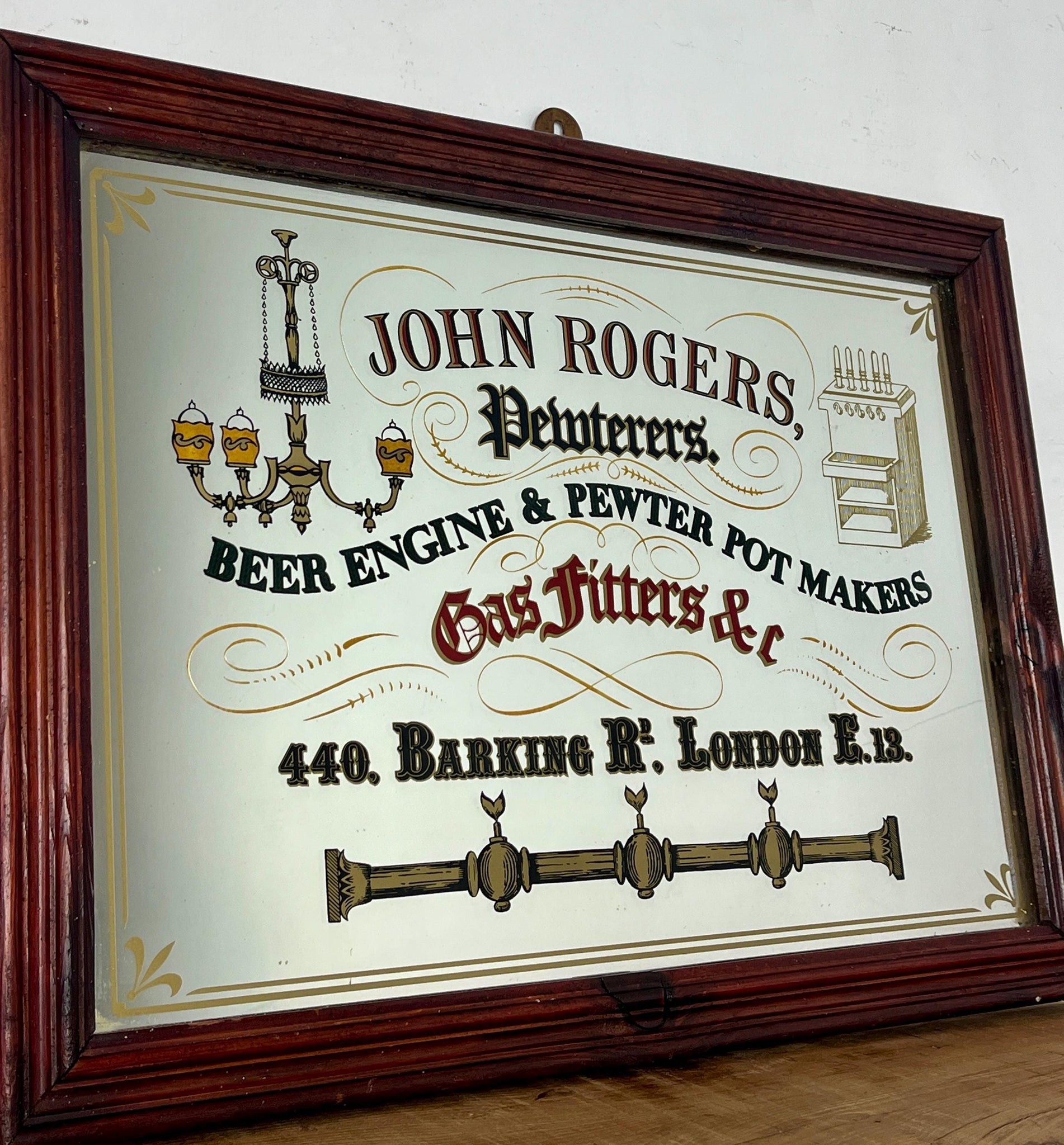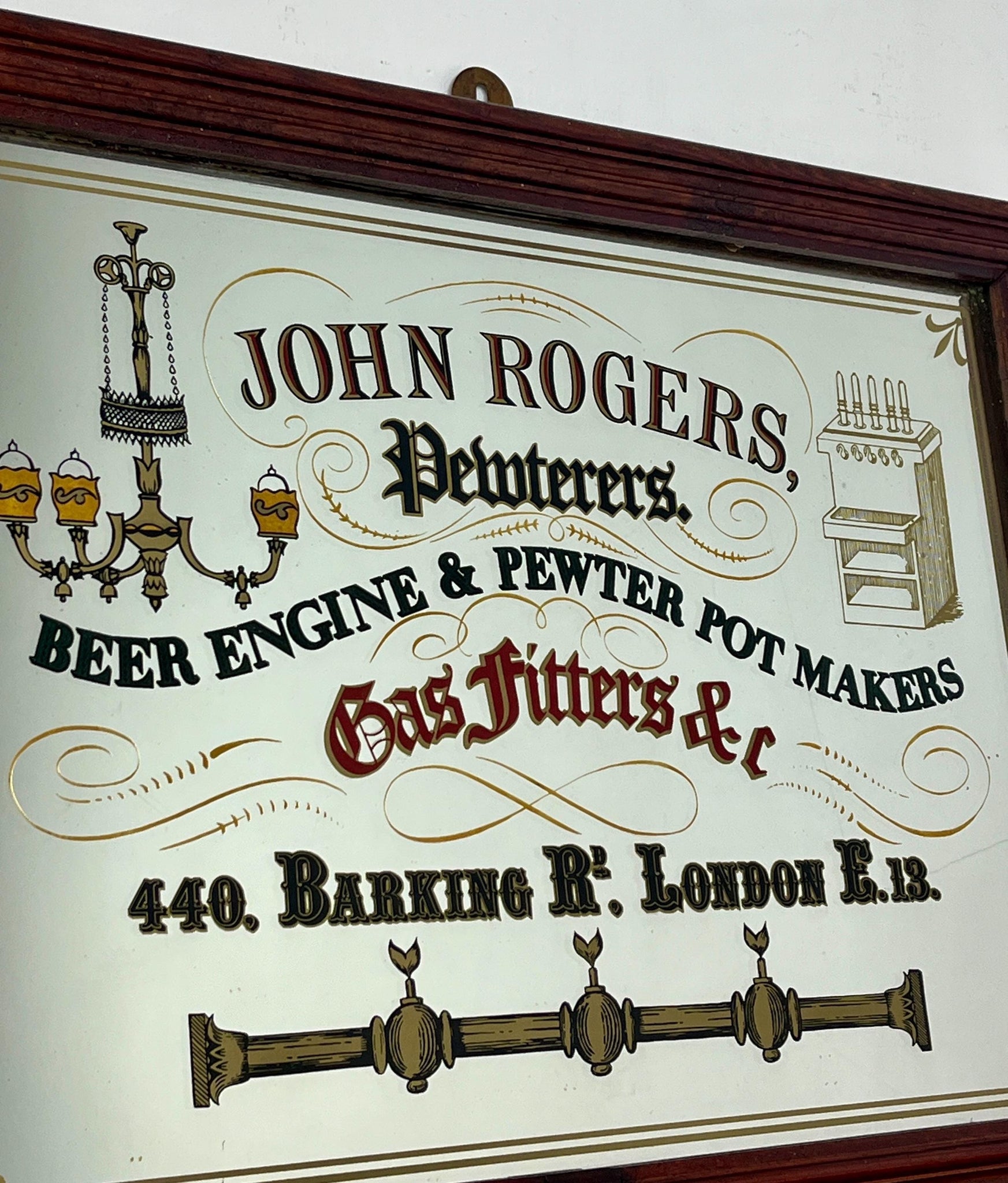 It's a fantastic vintage framed advertising mirror. John Rogers, Pewterers Beer Engine & Pewter Pot Makers, Gas Fitters, located at 440 Barking Rd. London E.13 has vivid fonts in a Victorian style, many styles, and hints of glamorous colours.