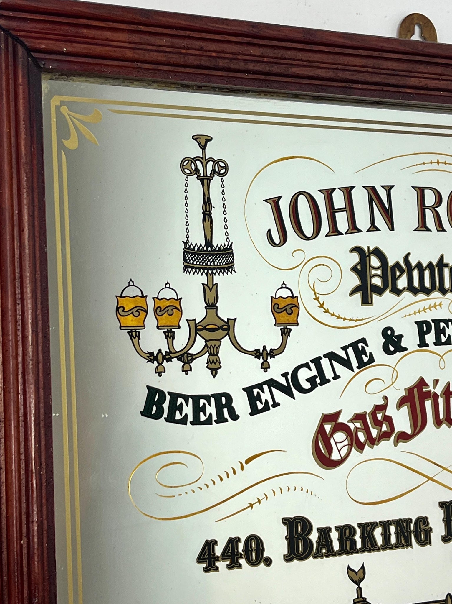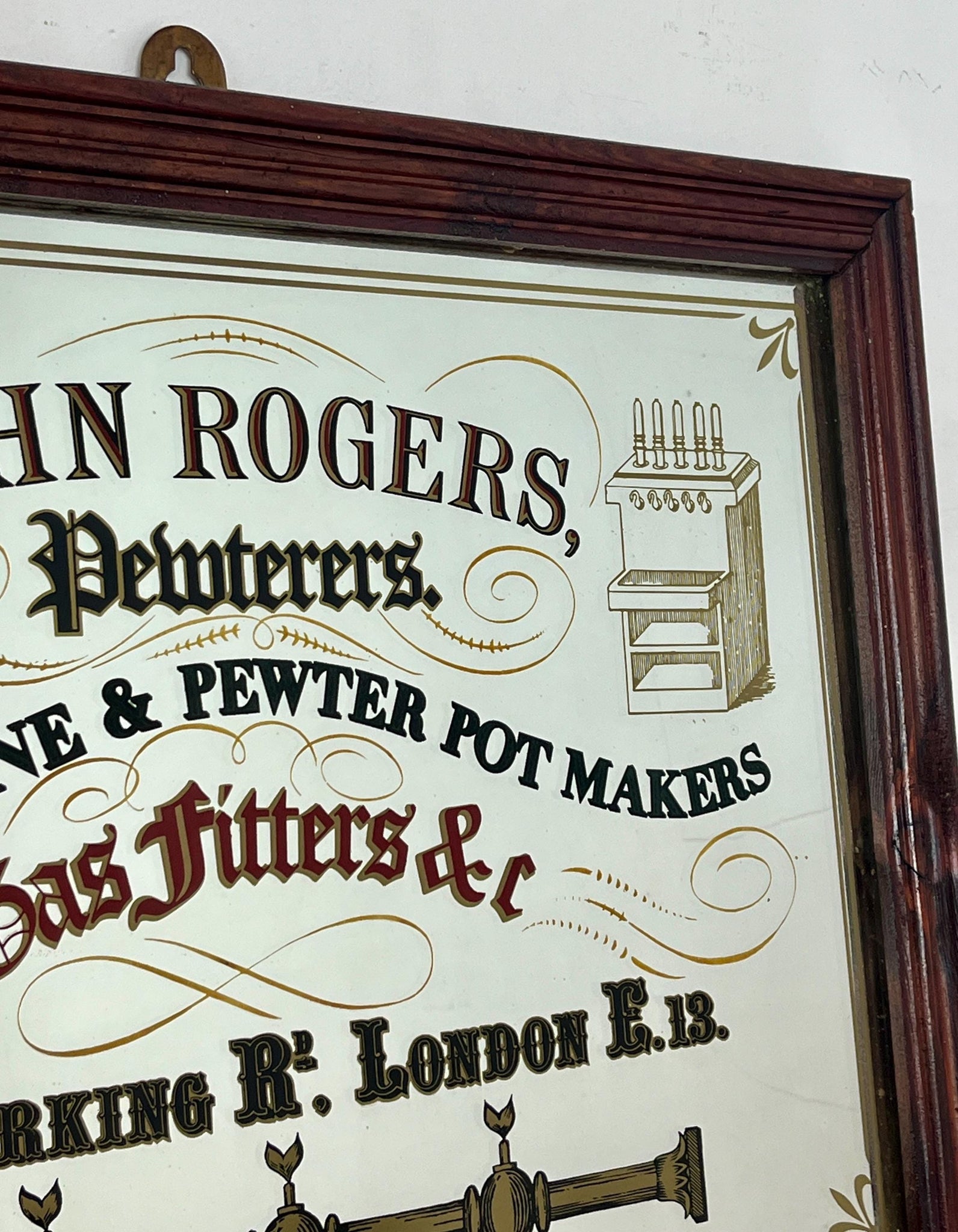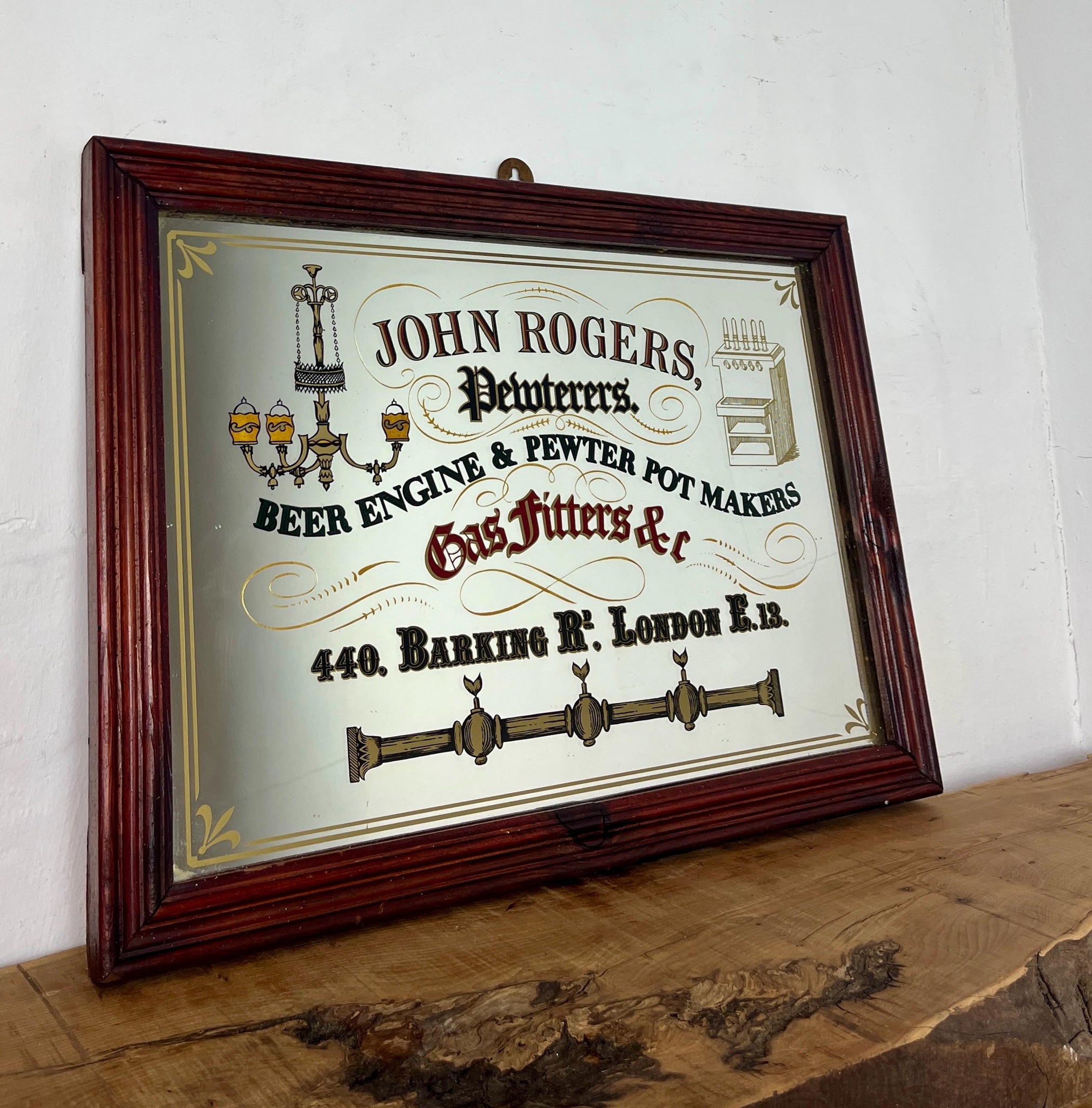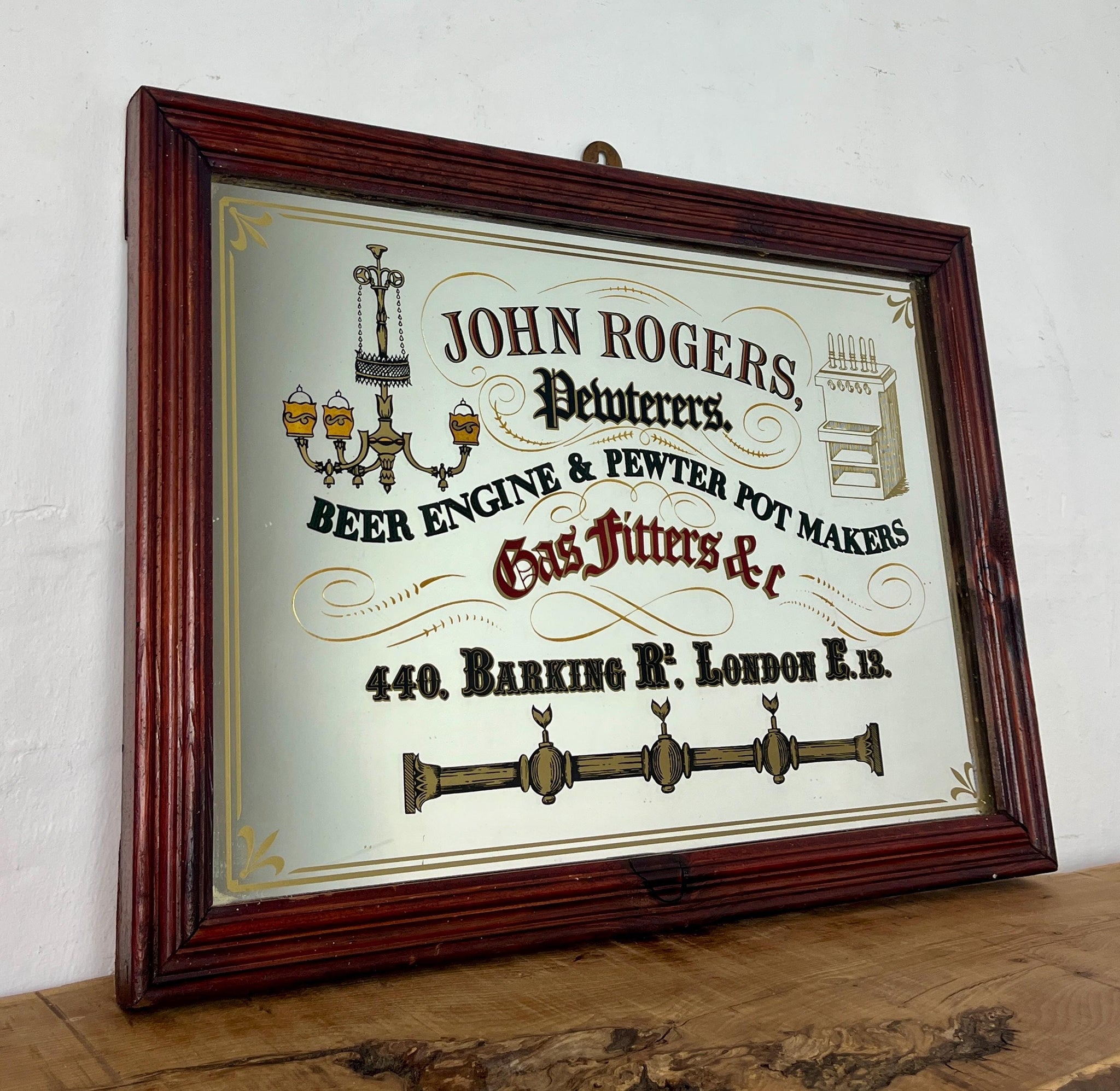 It's a fantastic vintage framed advertising mirror. John Rogers, Pewterers Beer Engine & Pewter Pot Makers, Gas Fitters, located at 440 Barking Rd. London E.13 has vivid fonts in a Victorian style, many styles, and hints of glamorous colours.
