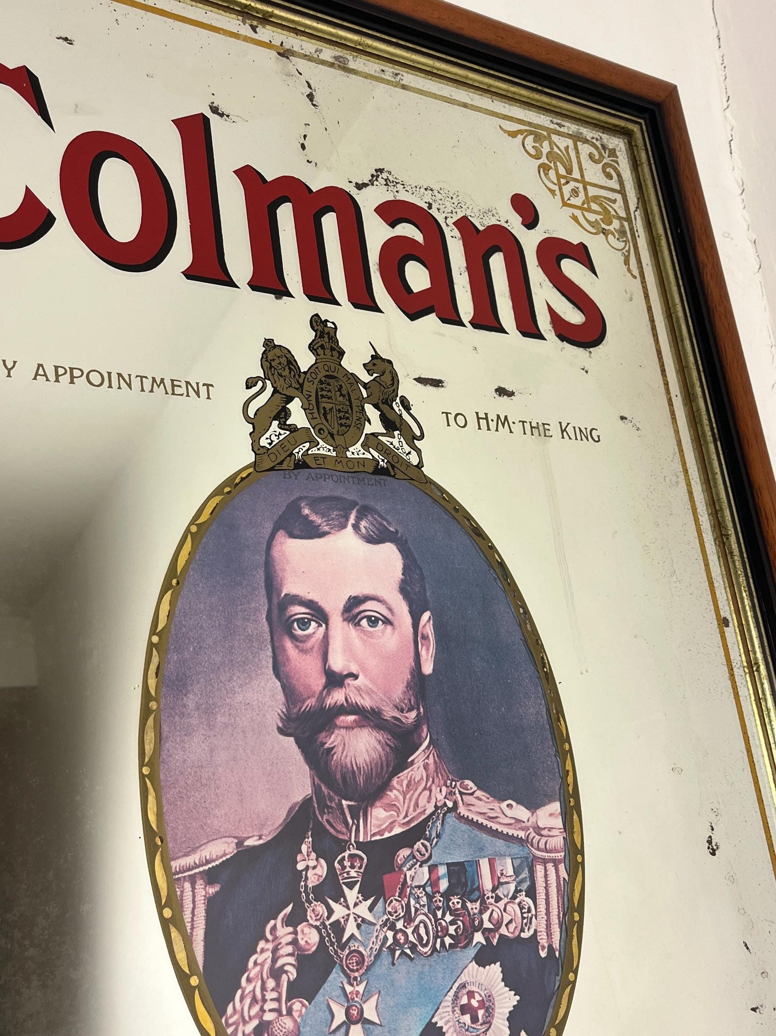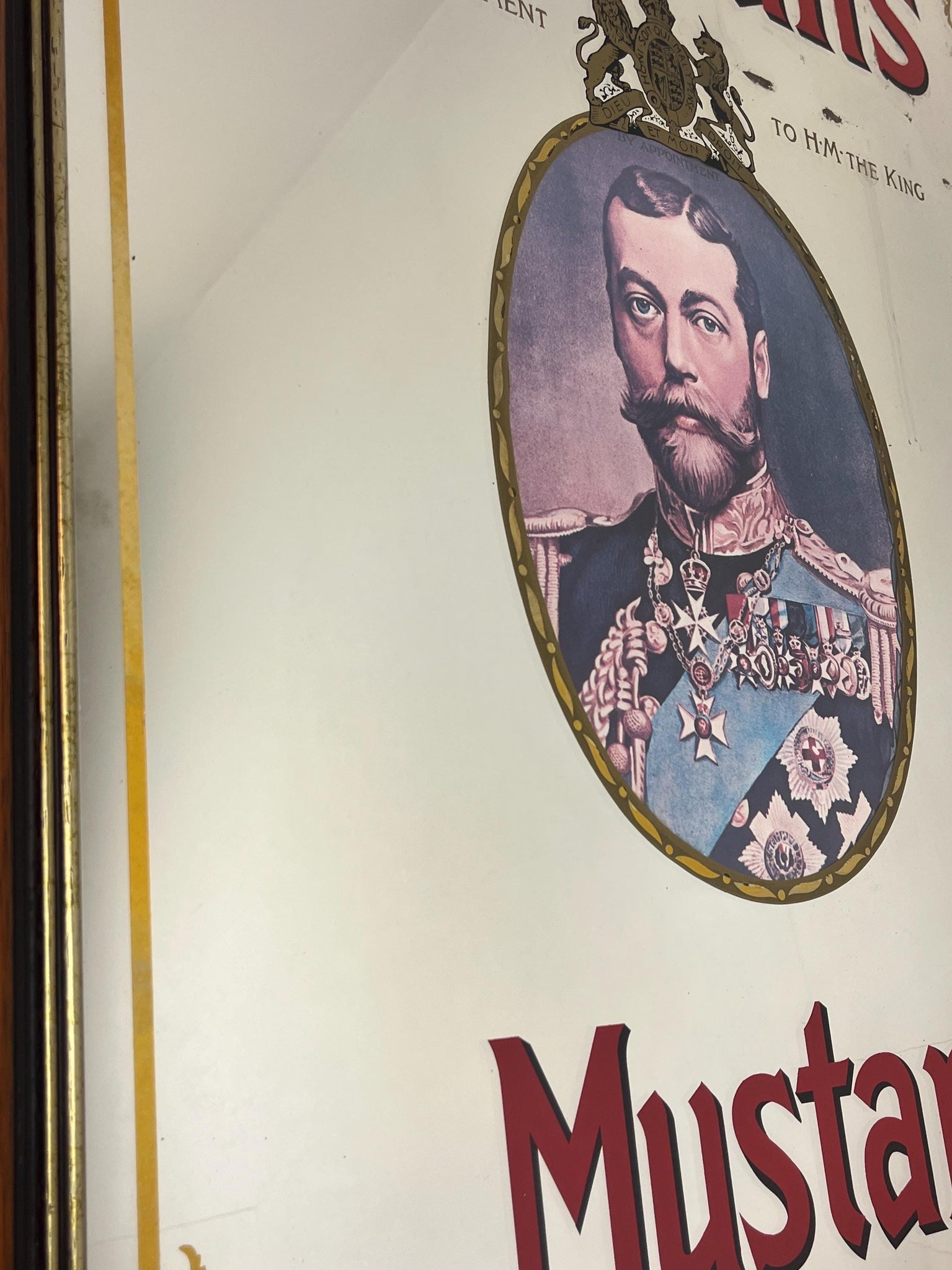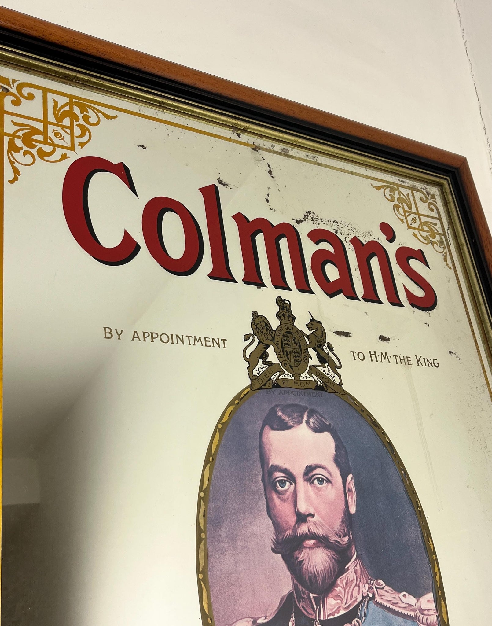 Colemans Mustard has always been a favourite with the Royal Family, in this mirror we even have a portrait of the king in the centre with the Royal Warrant By Appointment to H.M. The King, vibrant, stand-out red writing branding.