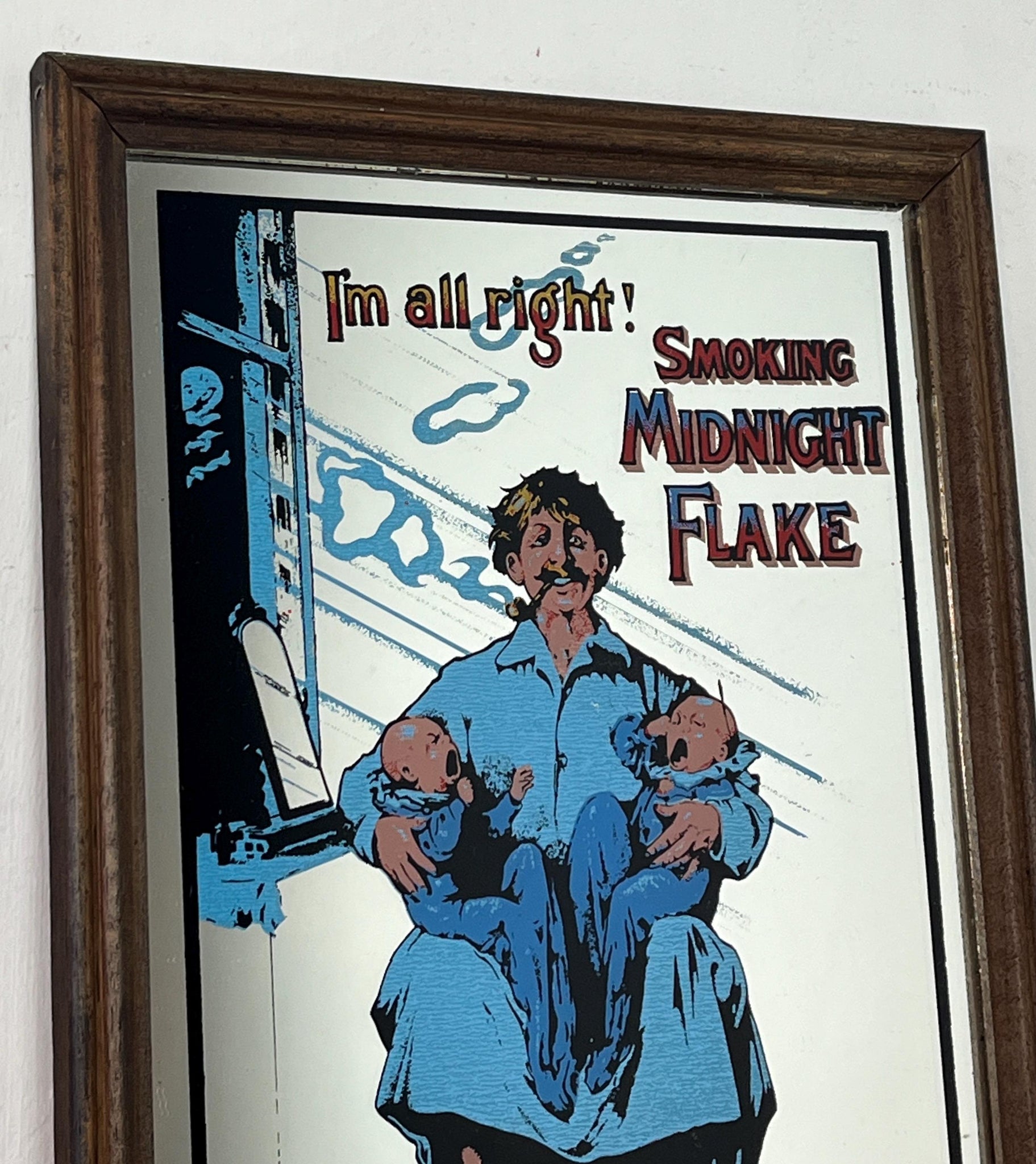 The mirror prominently features the slogan "I'm all right! SMOKING MIDNIGHT FLAKE.".