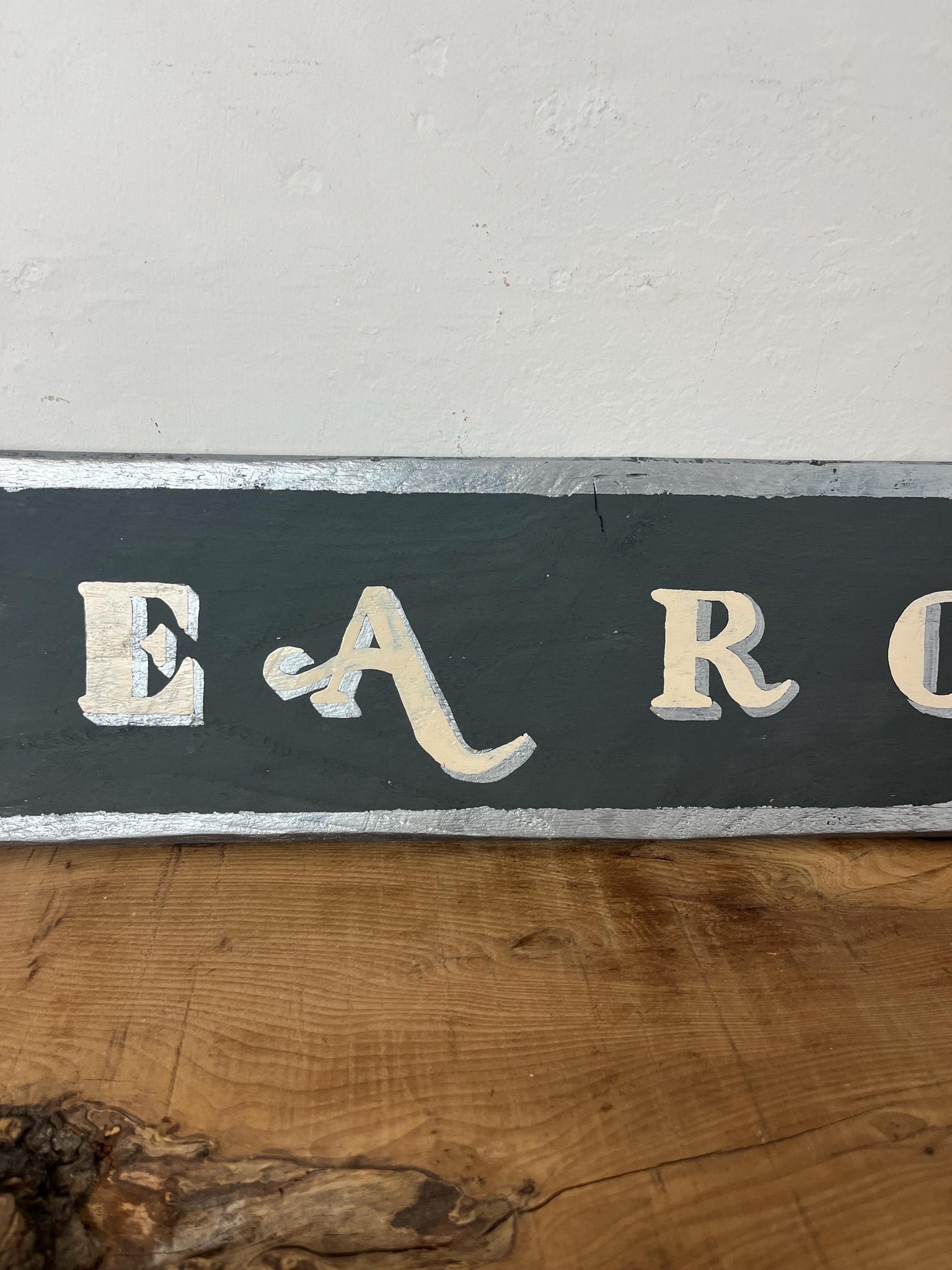 The sign has a distressed, shabby chic or retro aesthetic, designed to look more aged and weathered.