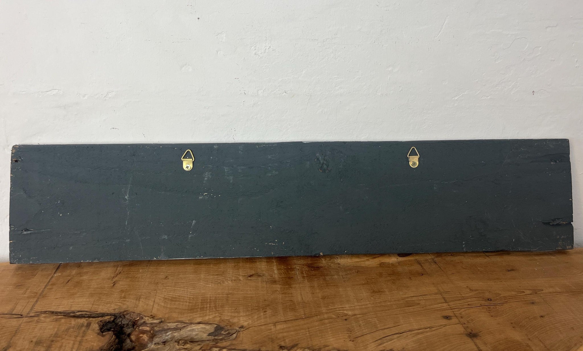 It features hand-painted or printed lettering with a bold font, often in contrasting colours like the black and silver/cream shown. The edges are sometimes aged by hand to enhance the vintage look.