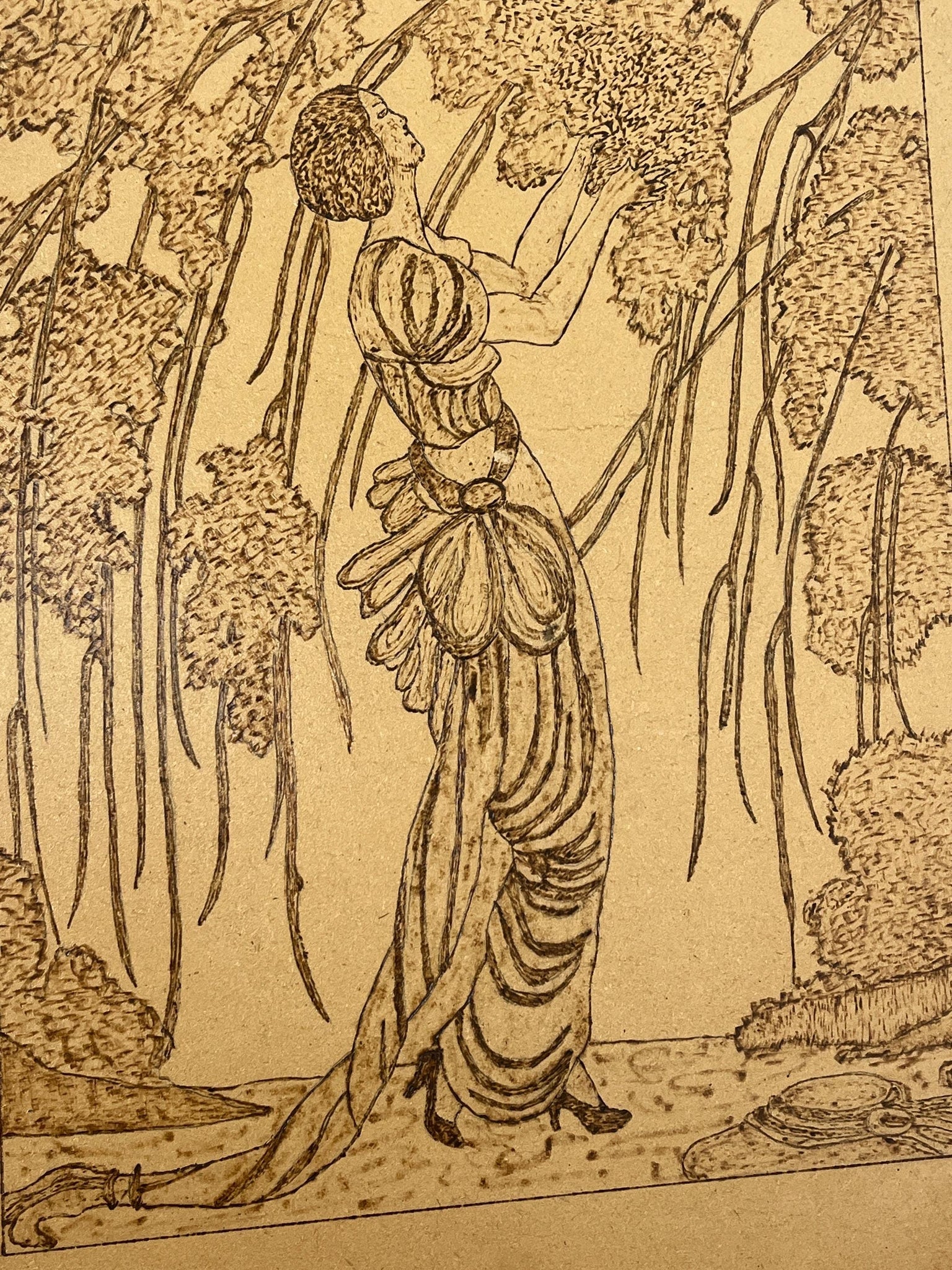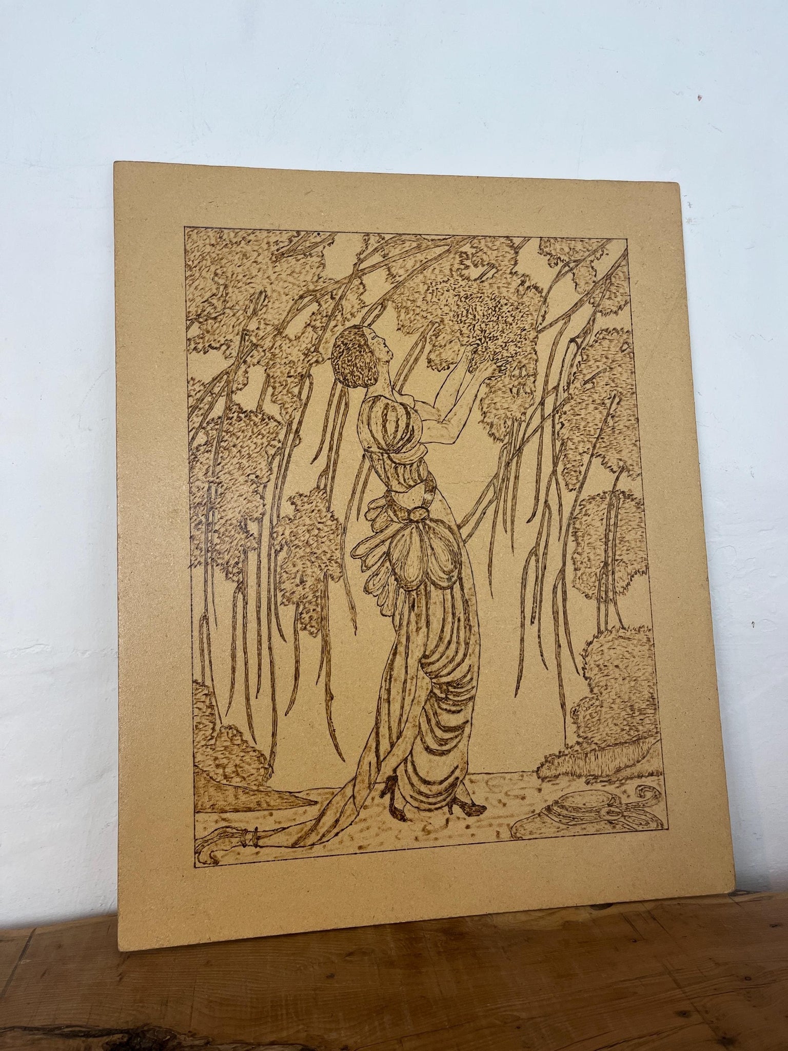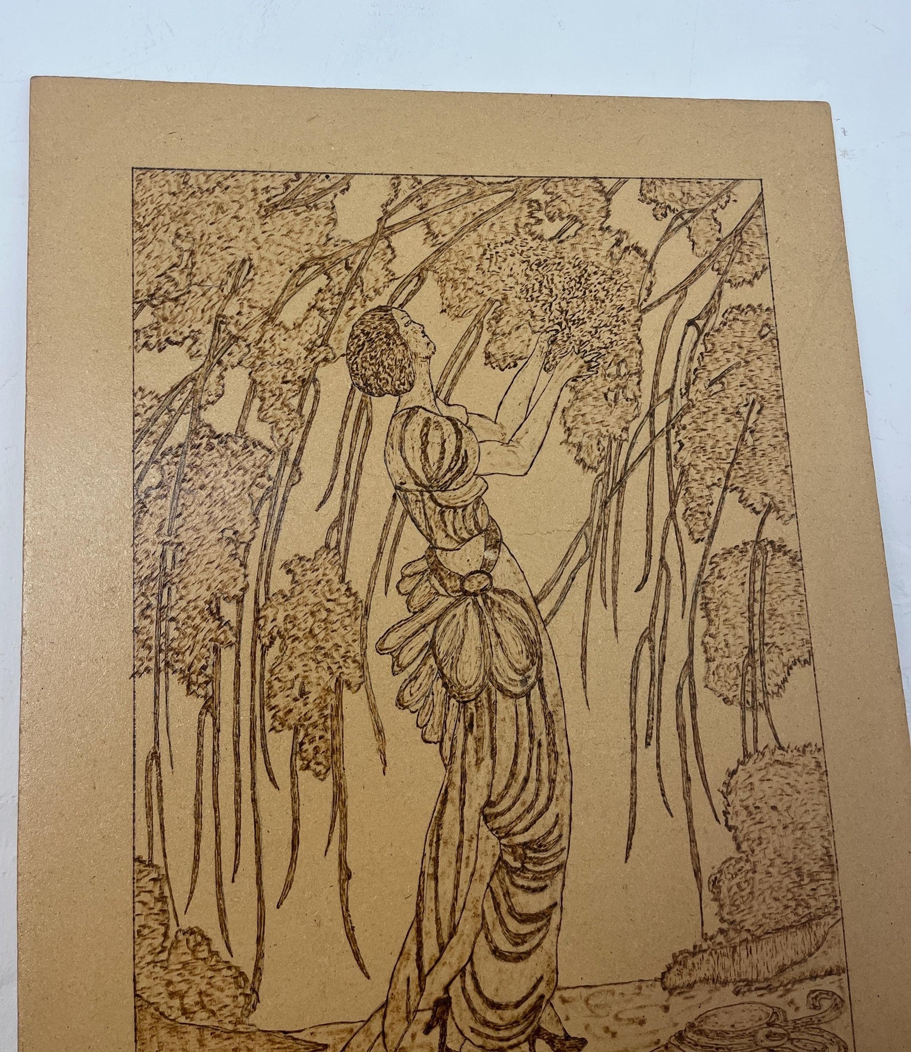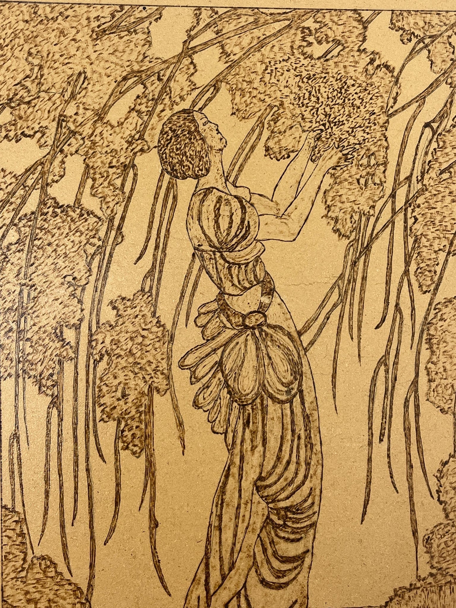 The piece is made using pyrography, the technique of burning designs into wood with a heated tool, giving it a distinctive monochromatic, sepia-toned look.